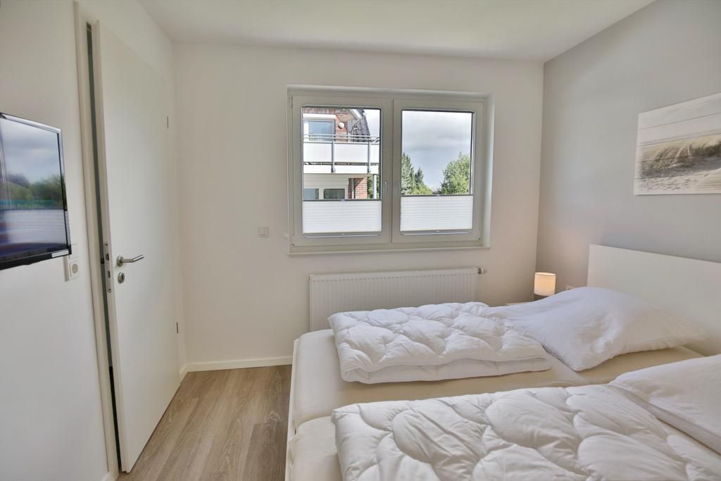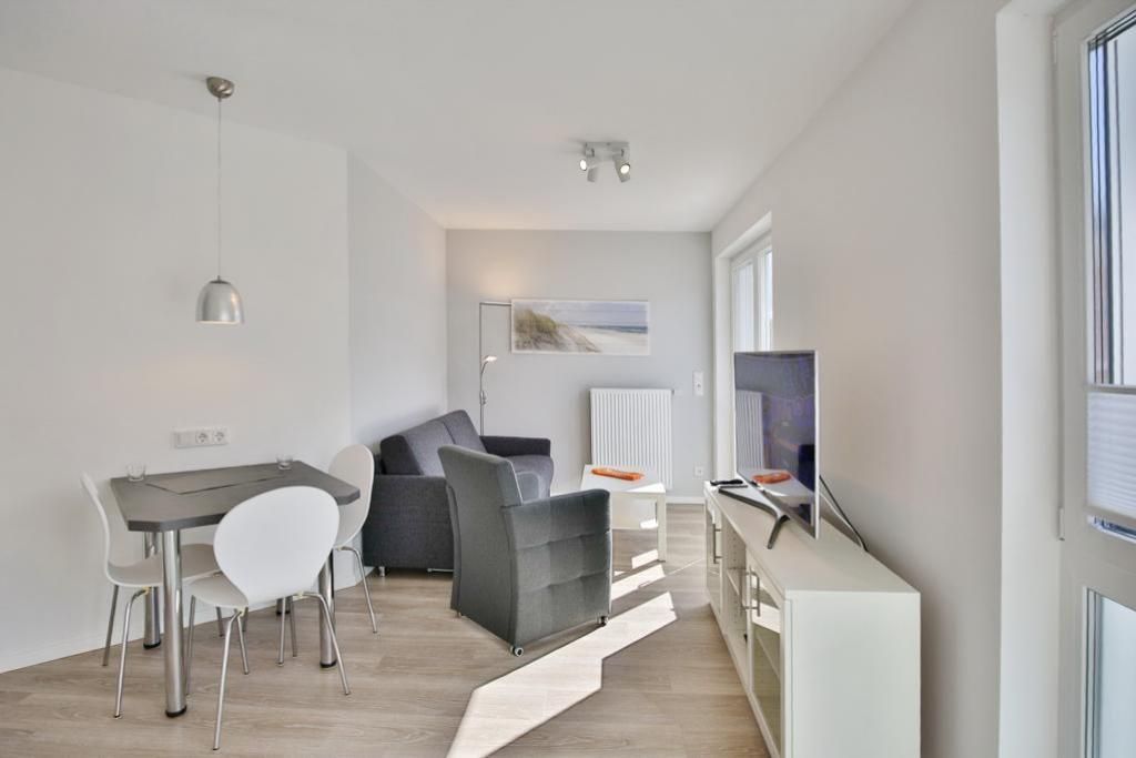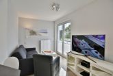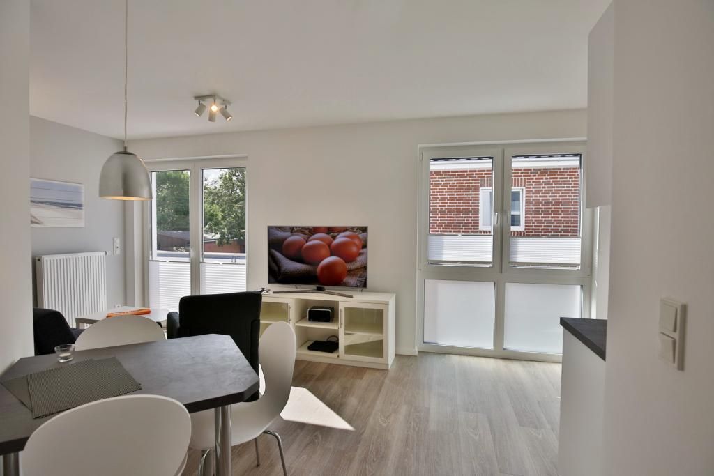 Sehr geschmackvolle Ferienwohnung auf ca. 47m² bis 3 Pers. ausgestattet im 1.OG mit Personenaufzug. Balkon (süd), 1 Schlafzimmer mit Doppelbett und TV, Wohn-/Schlafzimmer mit hochwertiger Schlafcouch, vollständige Küchenzeile mit Geschirrspüler, Gefrierfach, Backofen und Mikrowelle, TV, Blue-Ray-DVD, kostenfreies W-LAN, ebenerdige Dusche/WC mit Föhn, alle Räume mit Rollladen, reservierter Pkw-Stellplatz #7 am Haus, Nichtraucherwohnung, keine Haustiere gestattet.