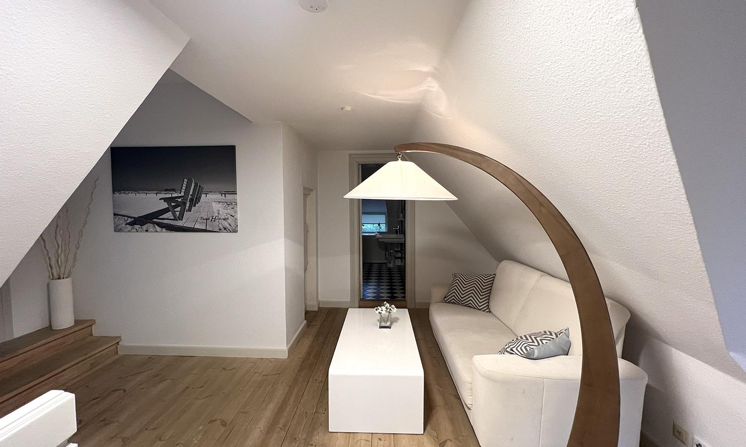 Die Einrichtung des Hauses ist von einer dem Friesenhaus angepassten Eleganz und erlesenen Qualität. Antiquarische Fliesen in der Diele, moderne Fliesen in den 2 Bädern, Holzfußböden in den 3 Schlafzimmern, dem Wohnzimmer und in den Räumen des Dachgeschosses, sowie massive lackierte Füllungstüren. Der ebenfalls neu gestaltete Außenbereich mit Strandkorb und Gartenmöbeln auf einer Terrasse aus Natursteinen ist durch eine mannshohe Ligusterhecke abgeschirmt. Die Wege und der Parkplatz wurden mit Klinker und Natursteinen gepflastert.