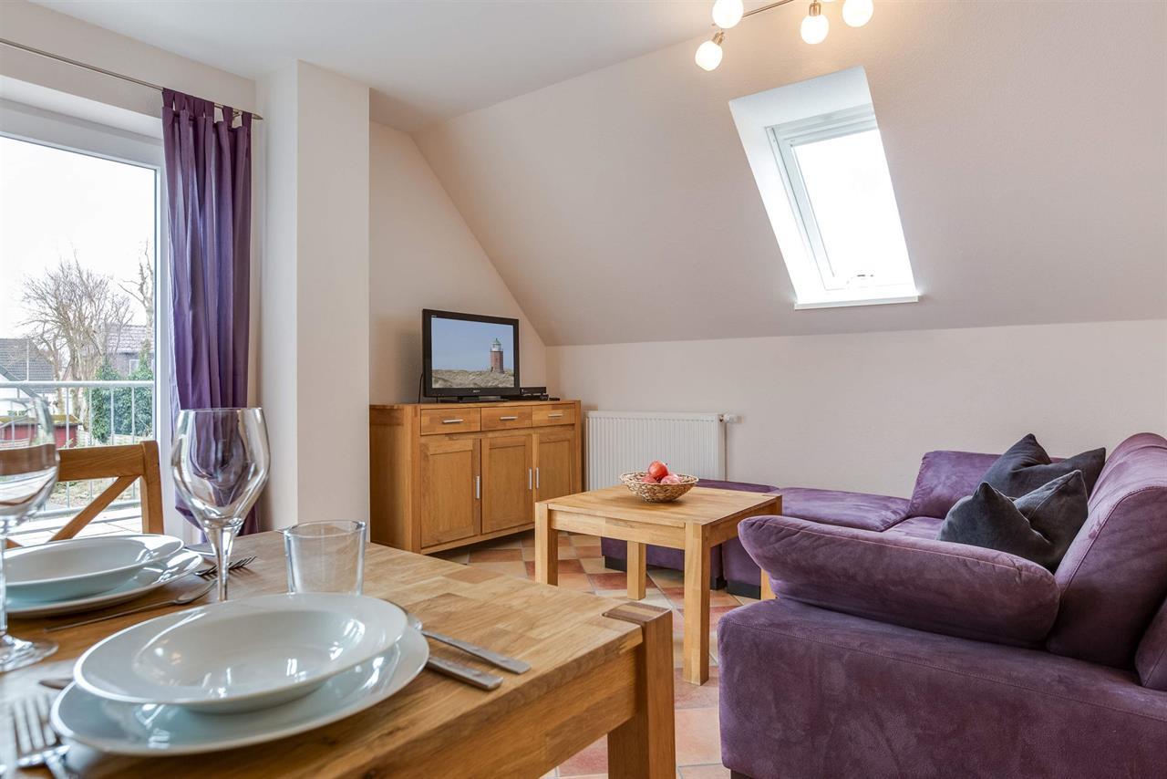 • Wohnzimmer mit Couch und 2 Hocker zum Entspannen, großem TV mit integriertem Radio und Esstisch mit 4 Stühlen.