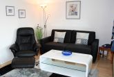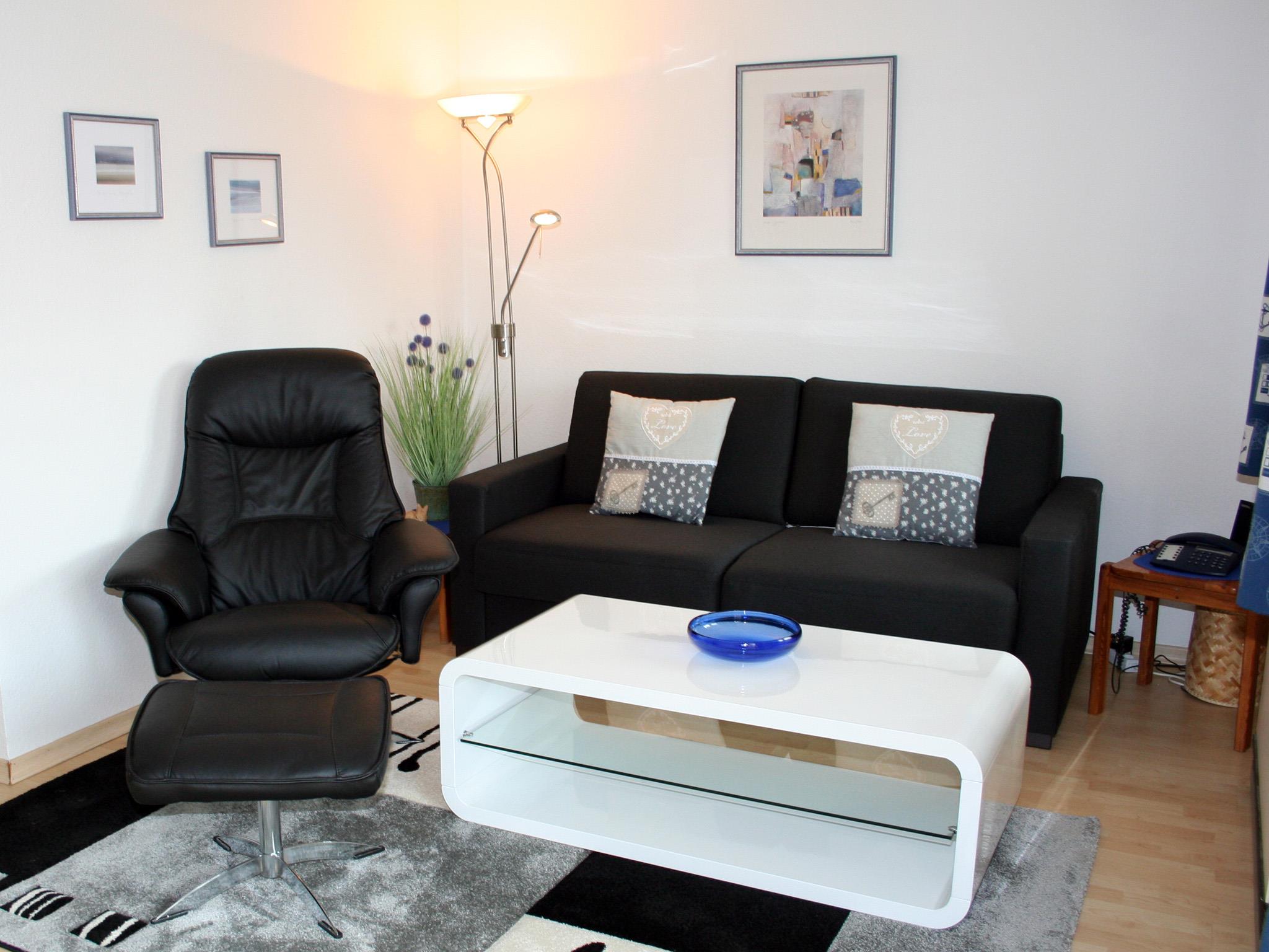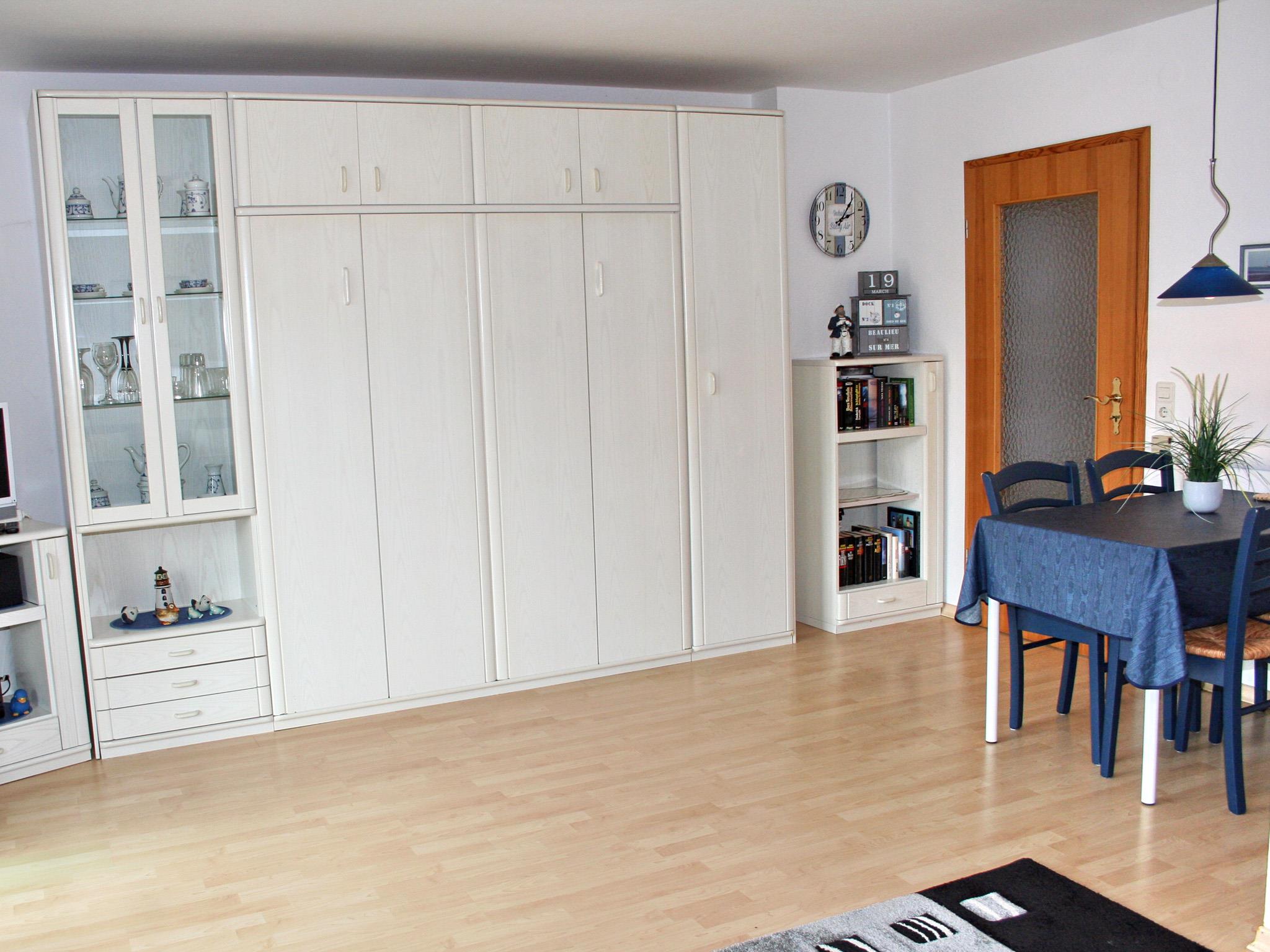 Wohnzimmer: ausziehbare Schlafcouch, Couchtisch, Fernsehsessel mit Hocker, zwei kleine Kommoden mit Beleuchtung, Hängeregal, Bücherschränkchen, Highboard mit Garderoben- und Geschirrteil, Kommode für Bettzeug, Esstisch mit 4 Stühlen, Kabel-TV mit Radio, Telefon, WLAN, Nachtspeicherofen.