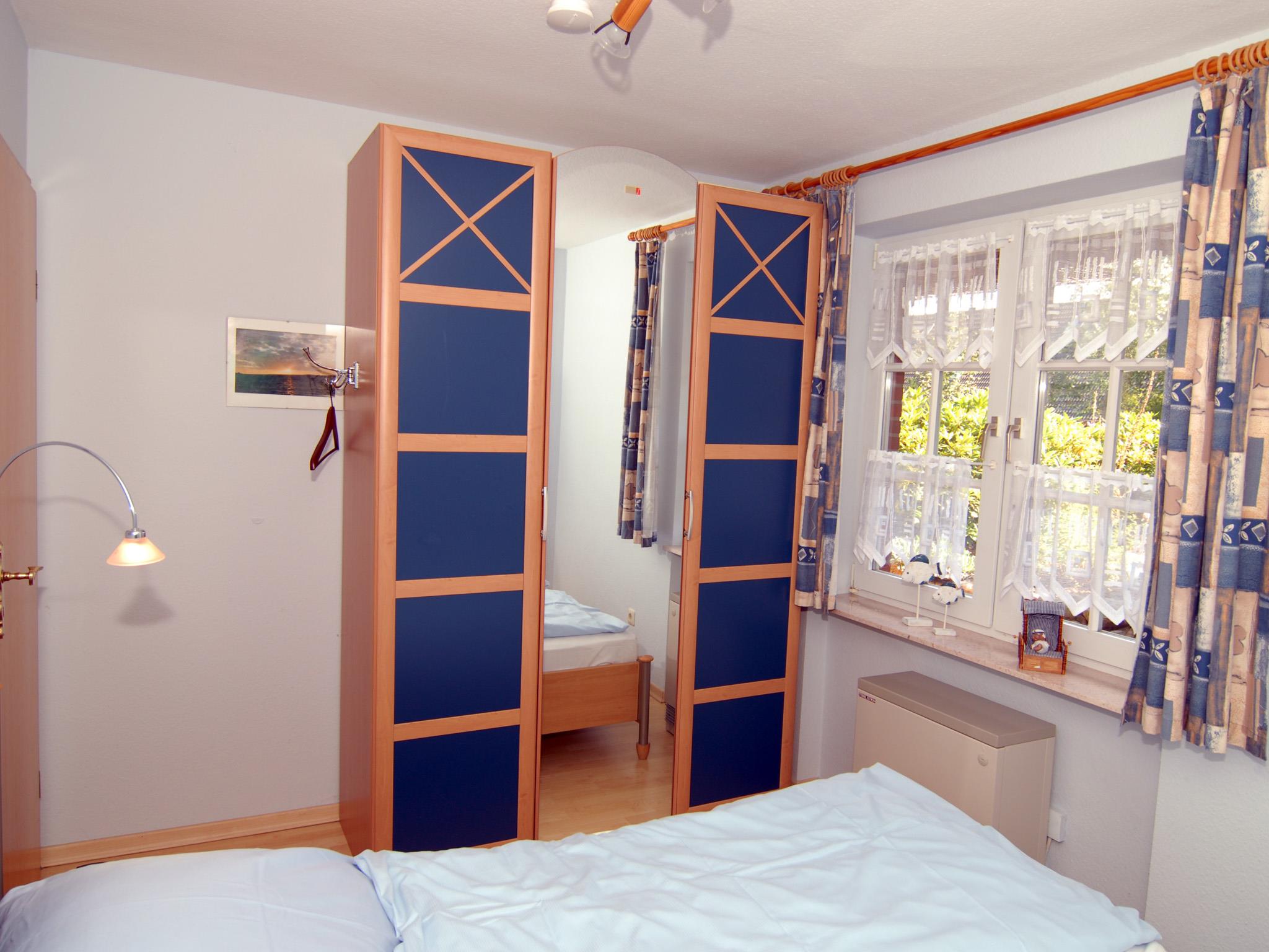Schlafzimmer: Doppelbett, 2 Ablagen, Kleiderschrank, Spiegel, Radiowecker, Nachtspeicherofen
