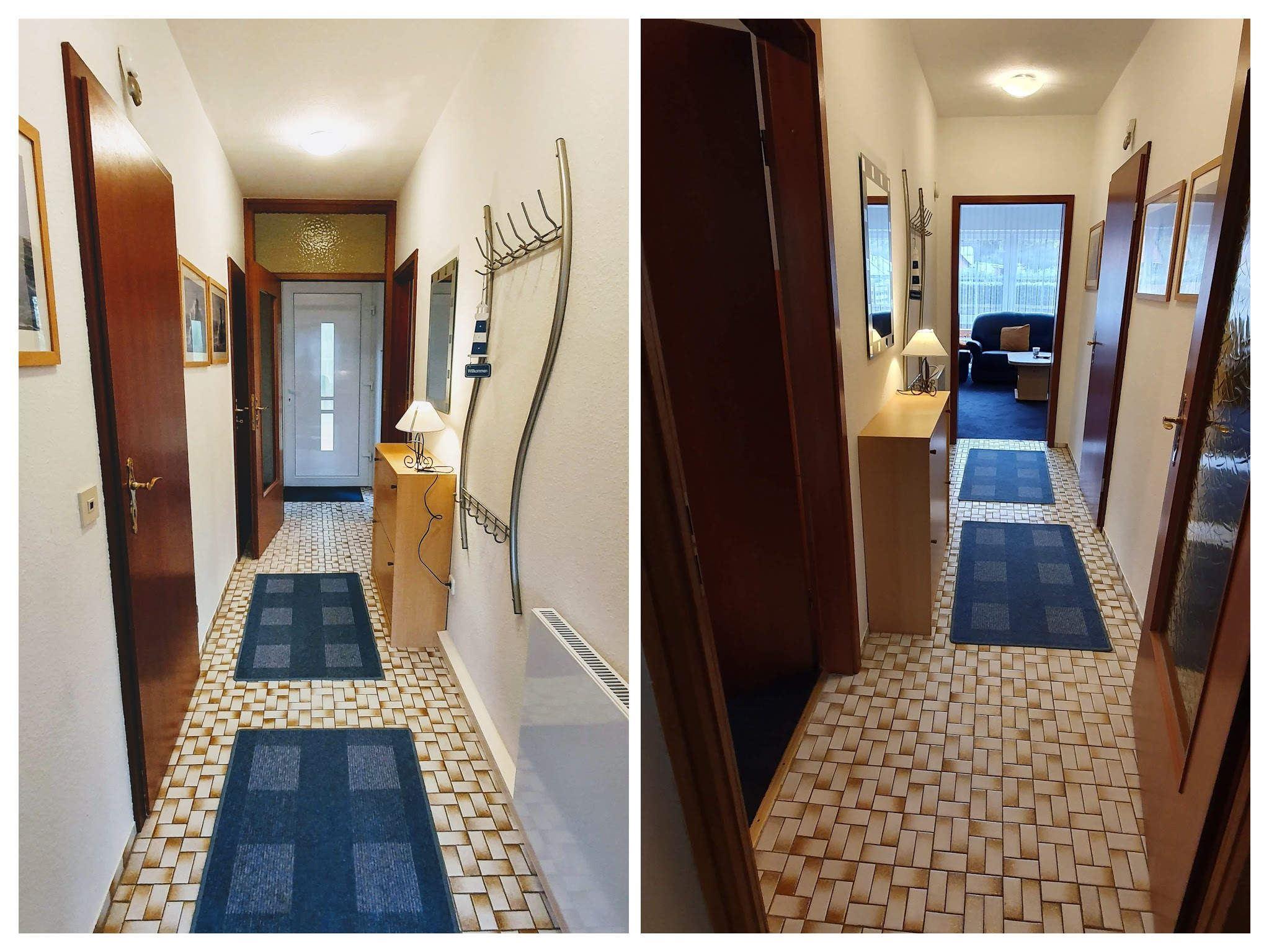 • Flur mit Garderobe, Schuhschrank und Spiegel.