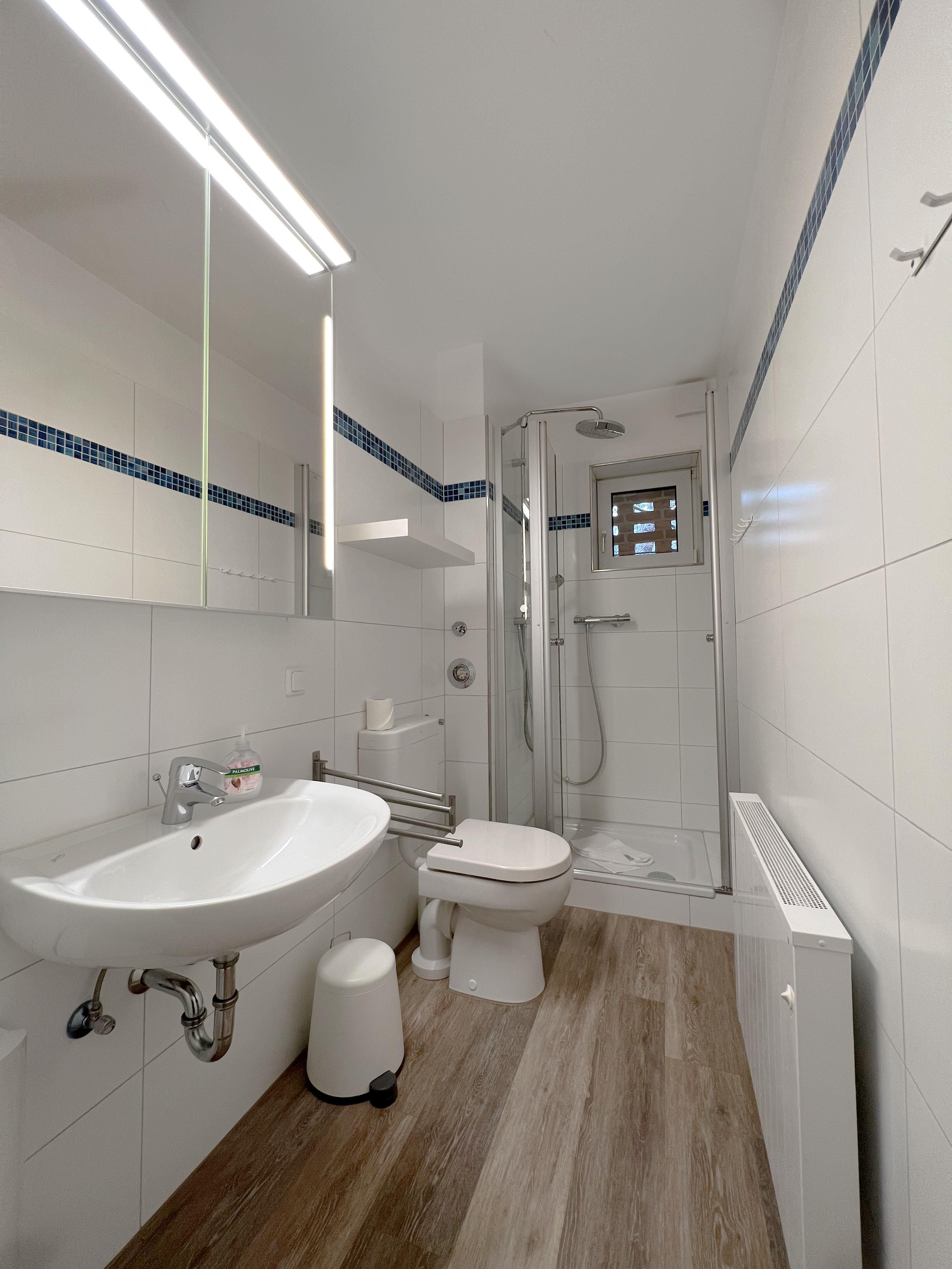Bad: Dusche, Waschbecken, WC, Spiegel, Duschkabine