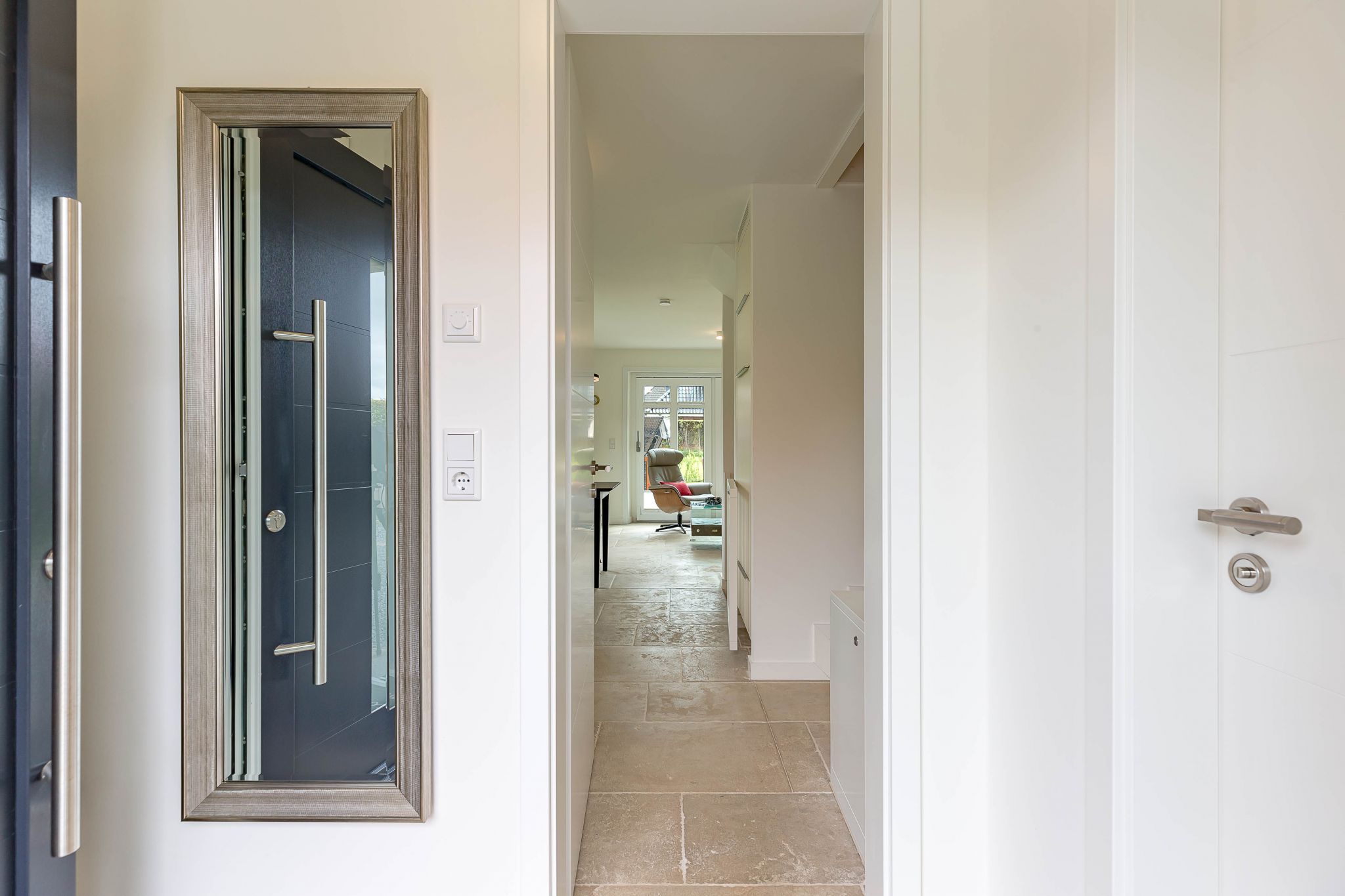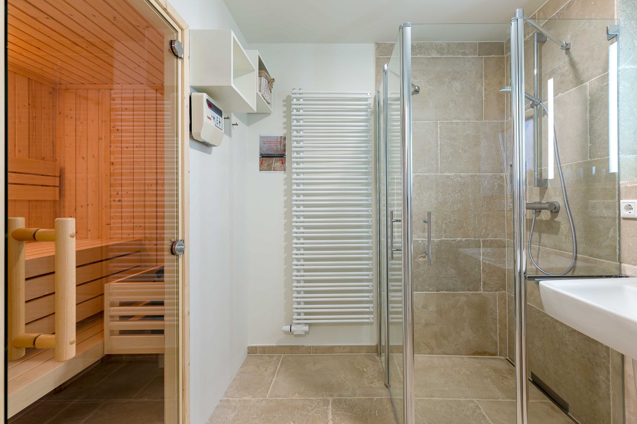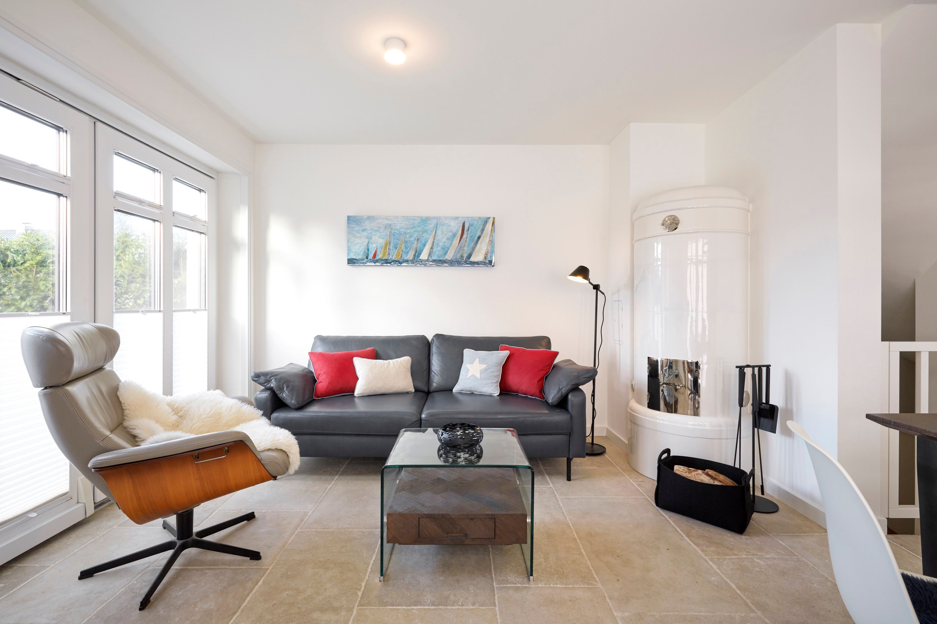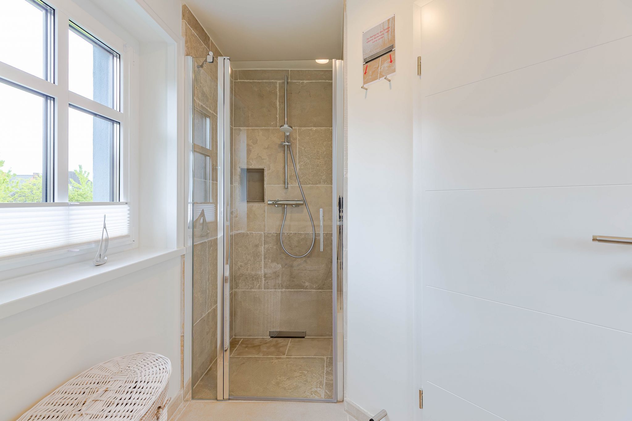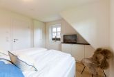 Von dort gelangen Sie über die zu gemütlichen Sonnenstunden einladende Terrasse in den Garten, wo Ihnen ein eigener Strandkorb zur Verfügung steht. Im Untergeschoss schaffen ein individuell von einer örtlichen Tischlerei eingerichtetes Doppelschlafzimmer sowie ein Bad mit bodentiefer Dusche und eine Sauna eine wohlige Atmosphäre. Der zweite ebenso hochwertig ausgestattete Doppelschlafraum befindet sich im Obergeschoss. Auch hier steht ein separates Bad mit bodentiefer Natursteindusche zur Verfügung.