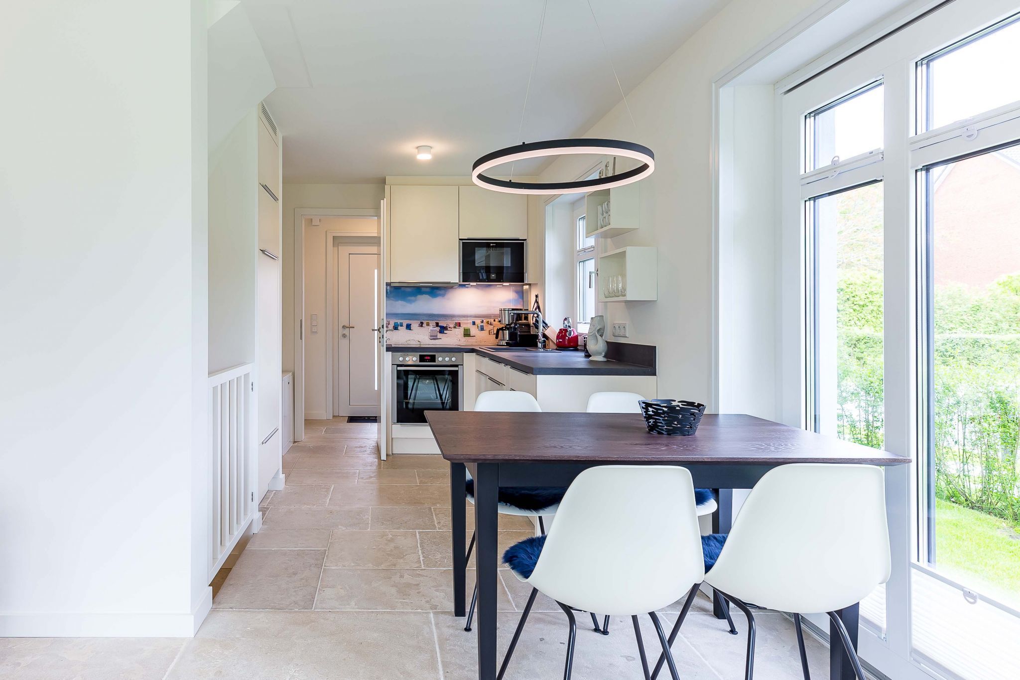 Im Erdgeschoss Ihres Feriendomizils befindet sich neben der Garderobe und der Gästetoilette der offene Wohn-/Essbereich mit komfortabel ausgestatteter Küche.