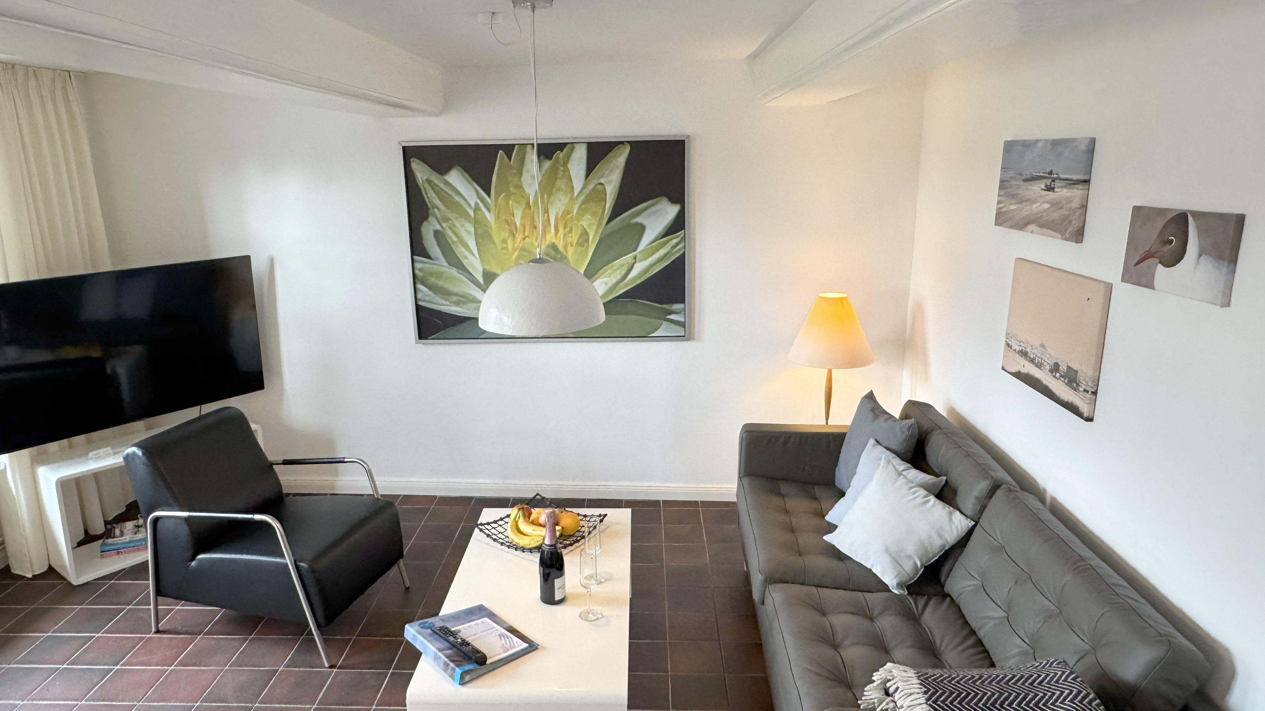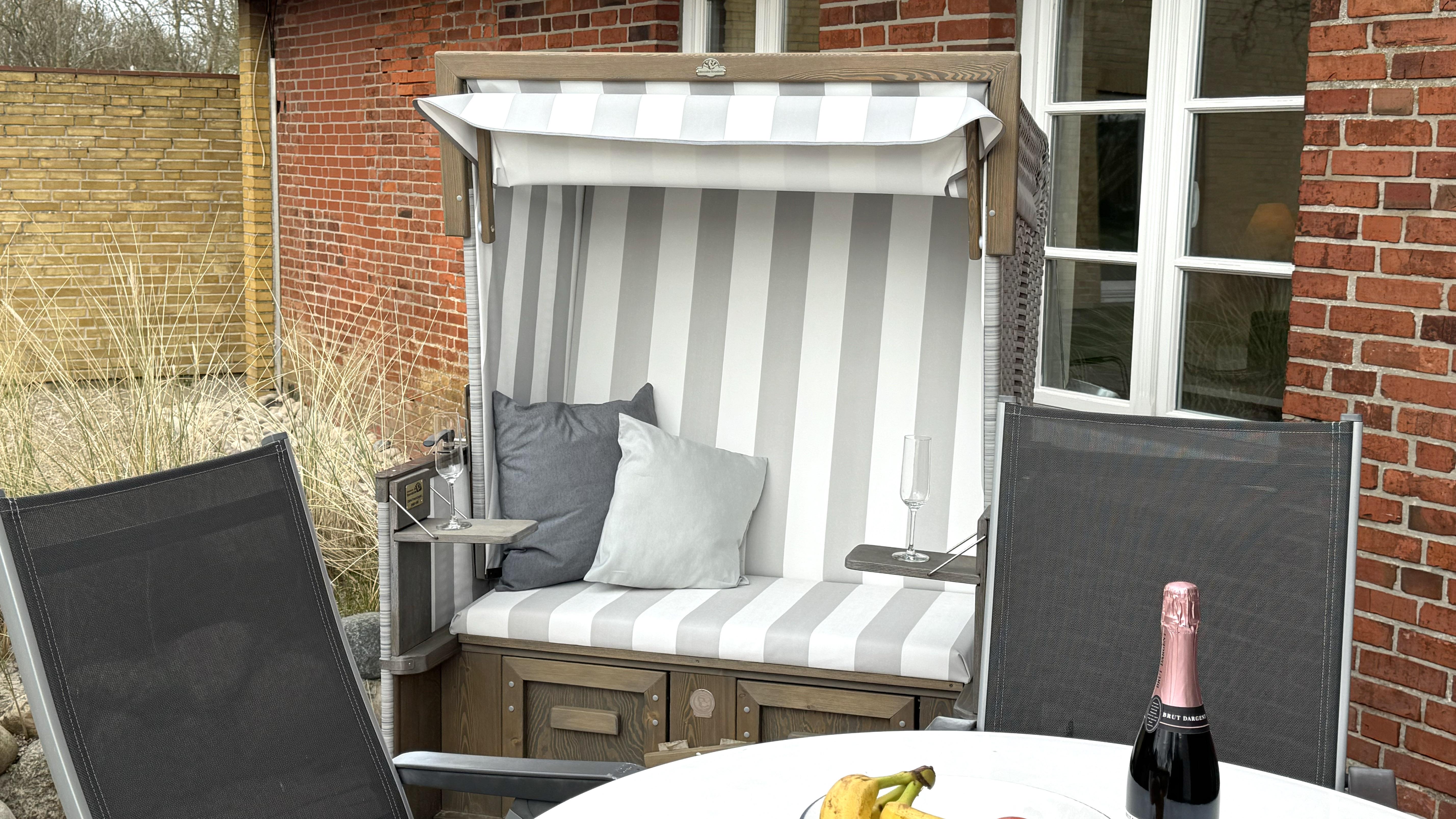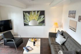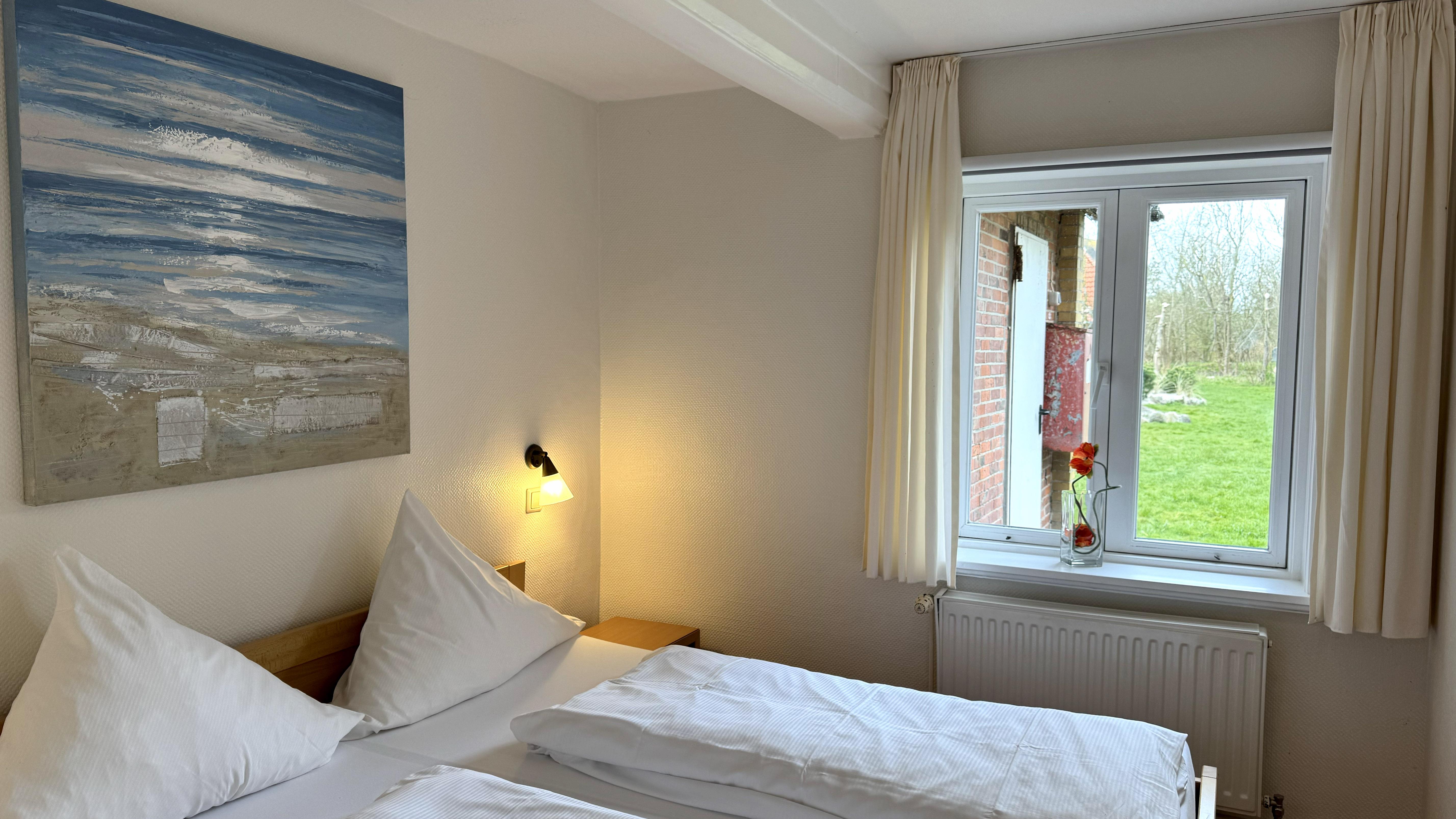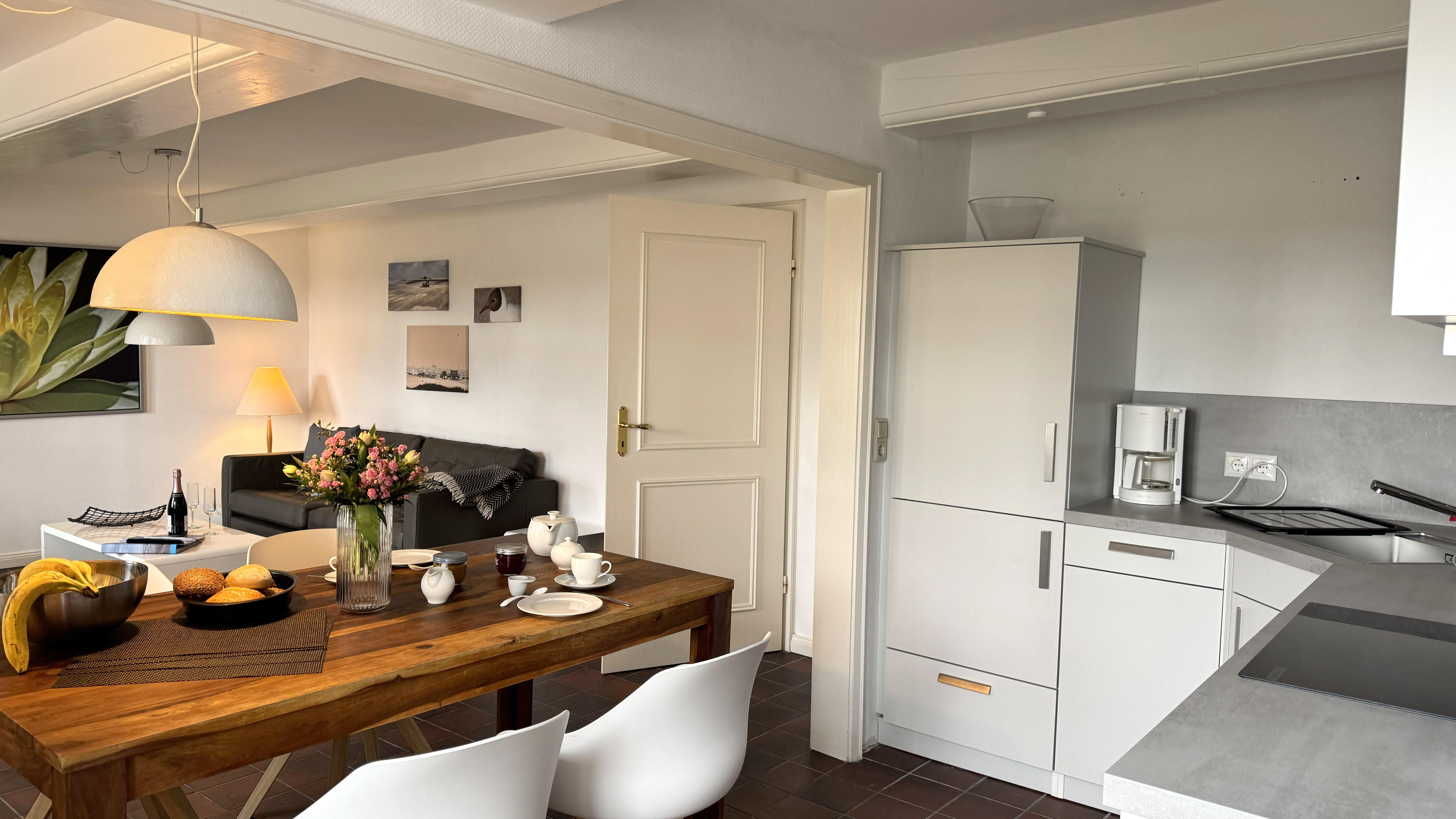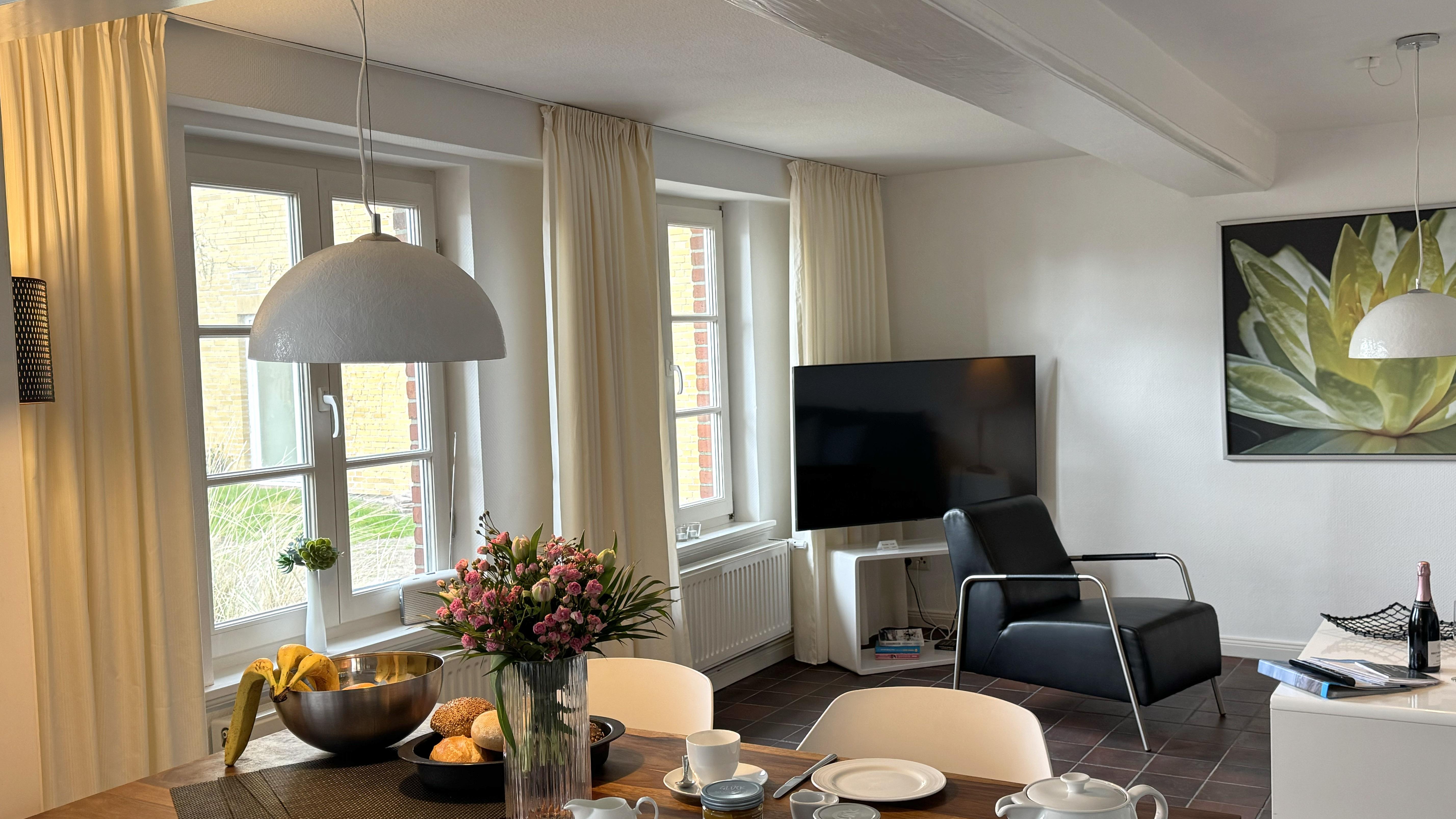 In den Schlafräumen sind noch die alten Holzfußböden erhalten, der restliche Bereich wurde gefliest, sichtbare Deckenbalken und Füllungstüren geben der Wohnung den besonderen Charme. Beide Wohnungen sind für 4 Personen ausgelegt und haben jeweilig Terrassen mit Strandkorb und Gartenmöbeln.