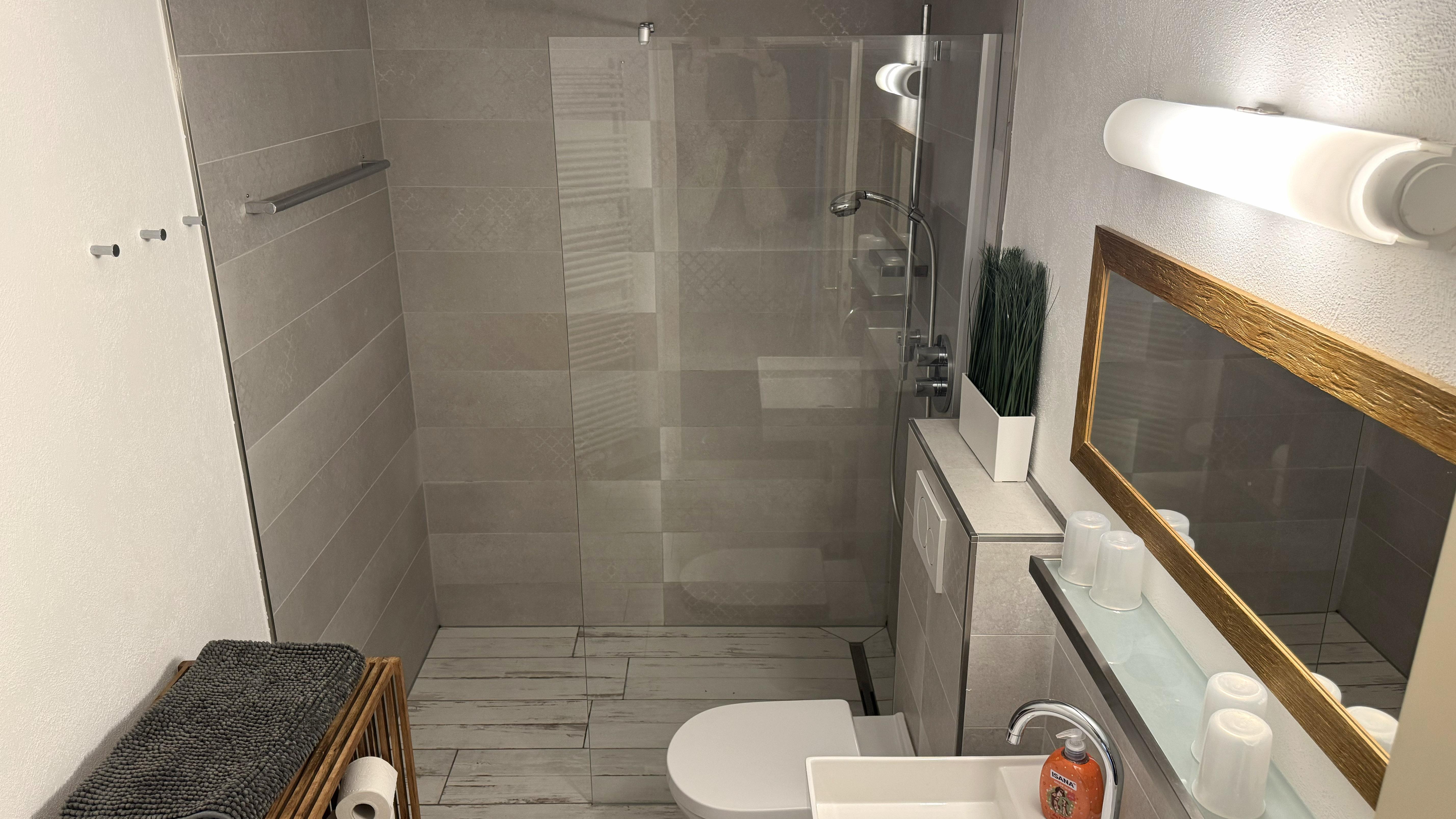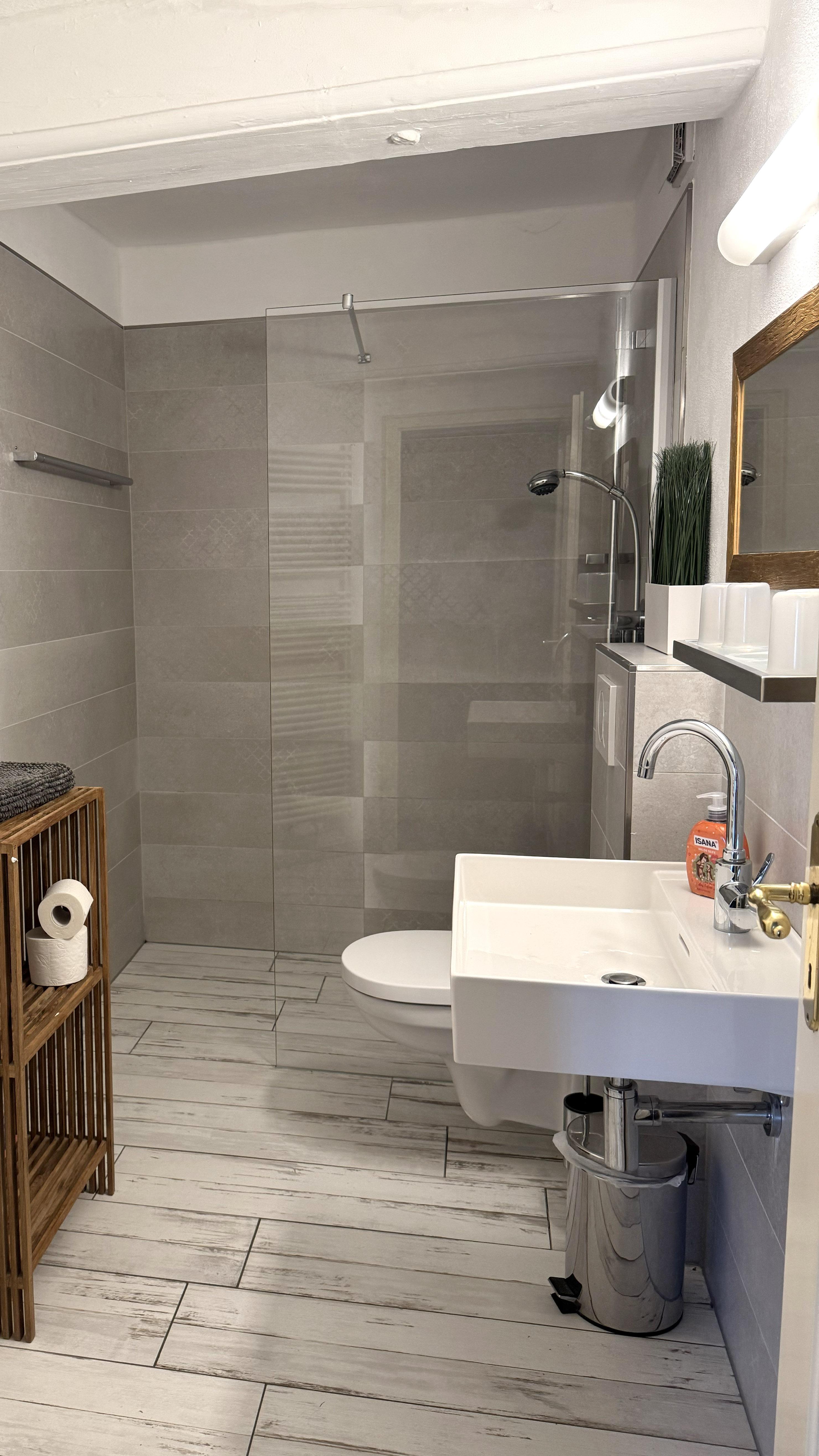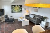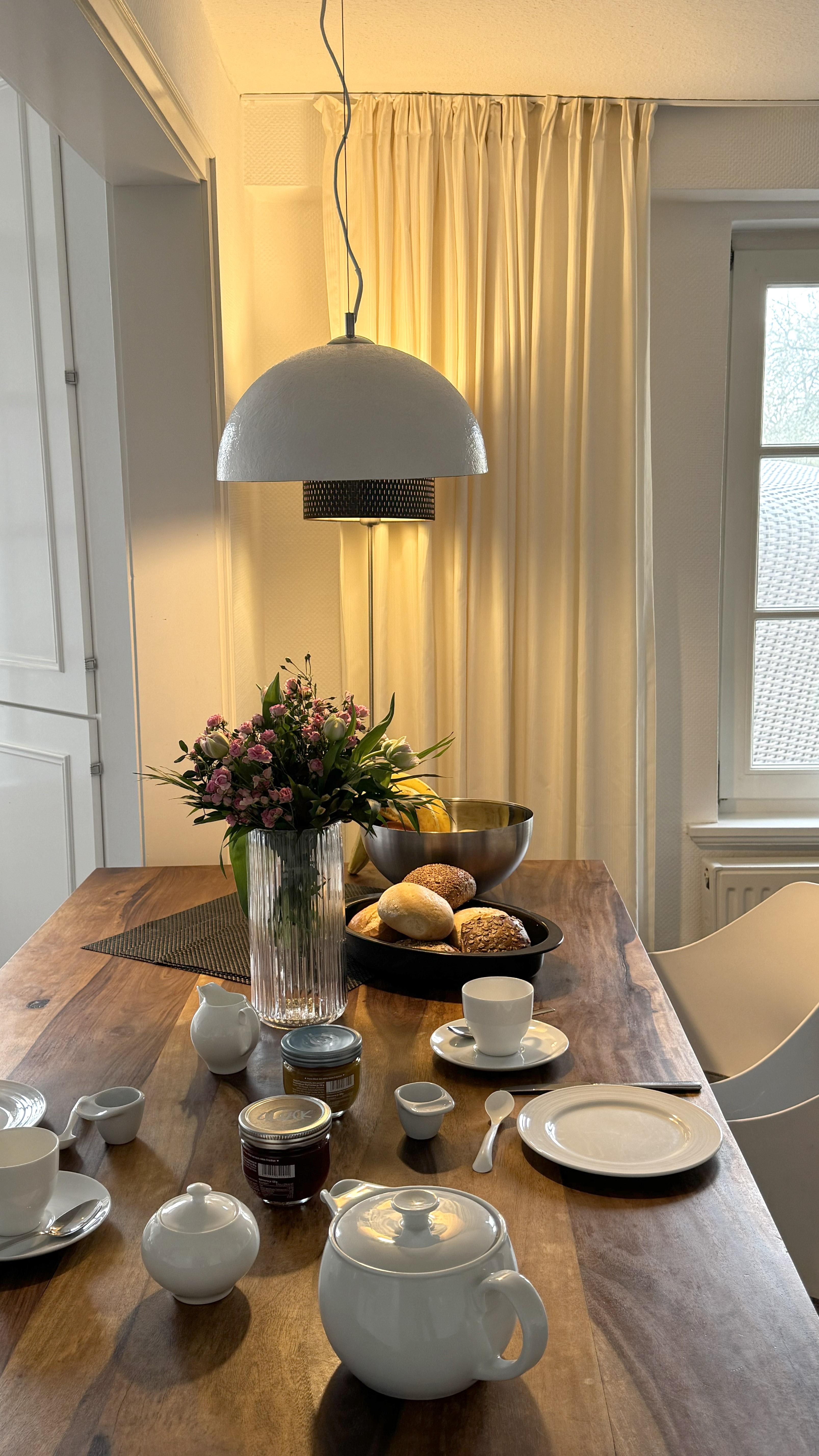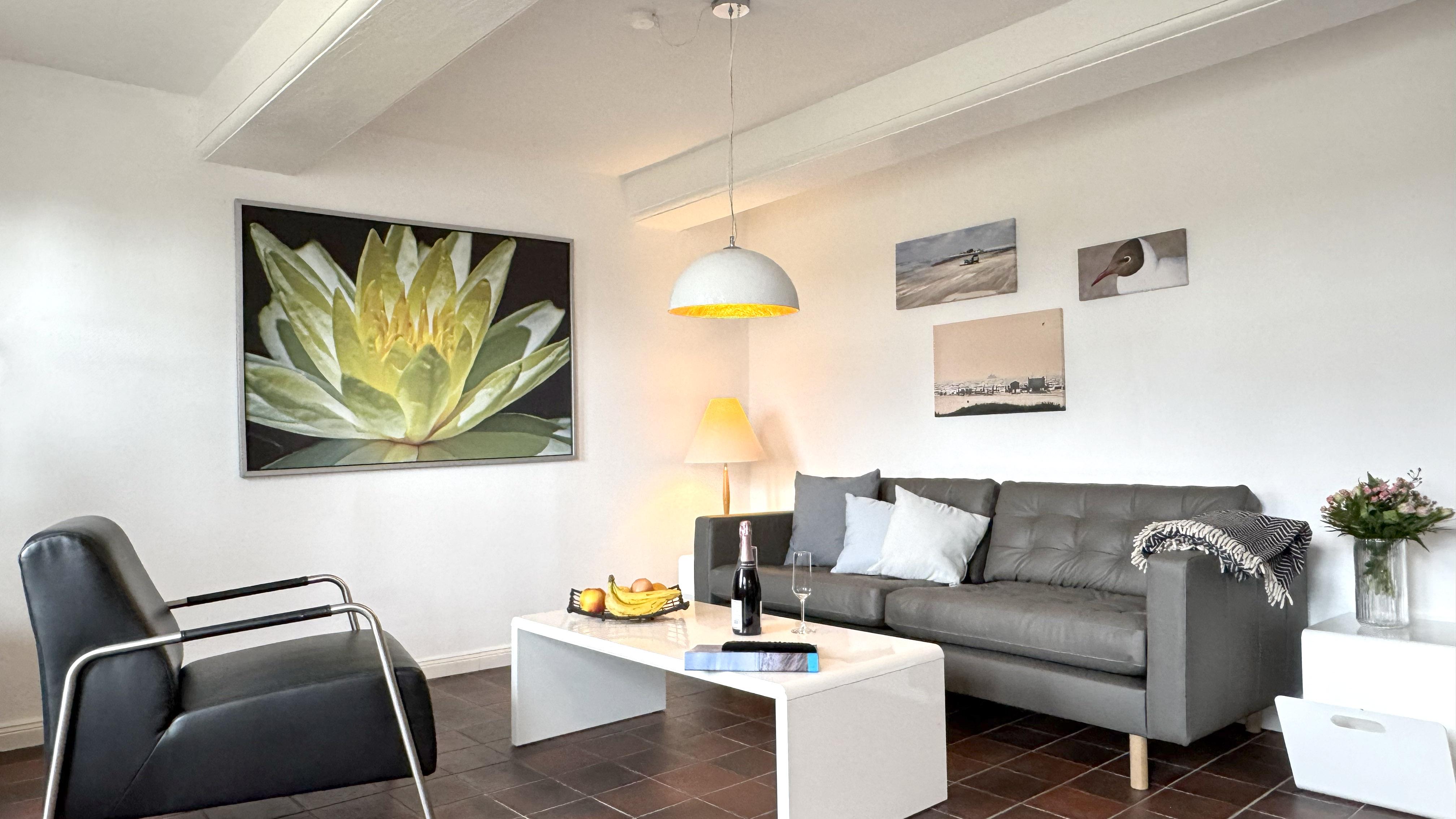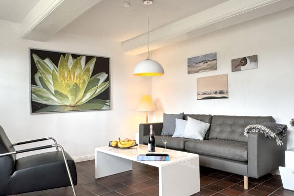 In den Schlafräumen sind noch die alten Holzfußböden erhalten, der restliche Bereich wurde gefliest, sichtbare Deckenbalken und Füllungstüren geben der Wohnung den besonderen Charme. Beide Wohnungen sind für 4 Personen ausgelegt und haben jeweilig Terrassen mit Strandkorb und Gartenmöbeln.
