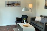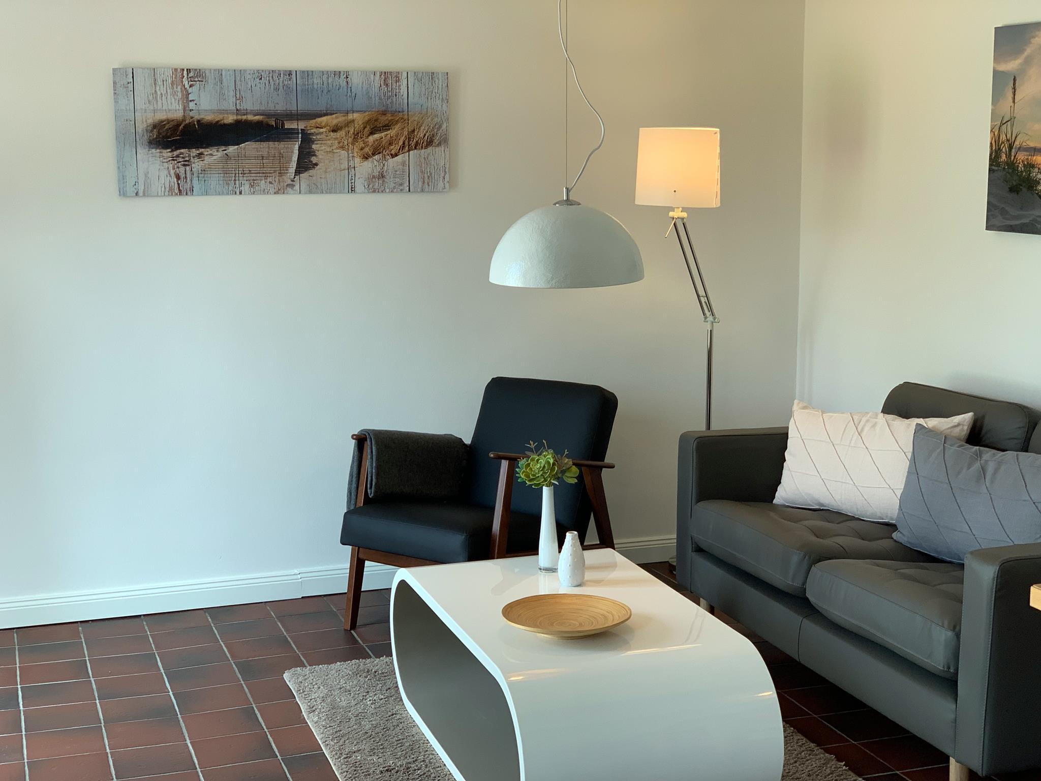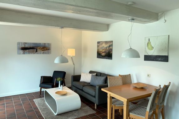 In den Schlafräumen sind noch die alten Holzfußböden erhalten, der restliche Bereich wurde gefliest, sichtbare Deckenbalken und Füllungstüren geben der Wohnung den besonderen Charme. Beide Wohnungen sind für 4 Personen ausgelegt und haben jeweilig Terrassen mit Strandkorb und Gartenmöbeln.