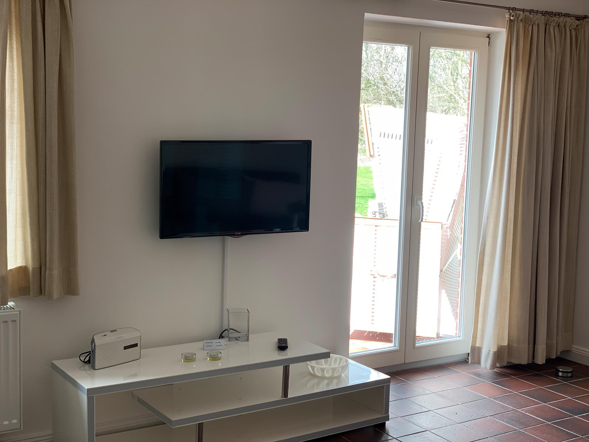 Modernisierte und renovierte Ferienwohnung unter Reet, im Schlafraum ist noch der alte Holzfußboden erhalten, der restliche Bereich wurde gefliest, sichtbare Deckenbalken und Füllungstüren geben der Wohnung den besonderen Charme. Vom Wohnraum haben Sie einen direkten Zugang auf eine große Westterrasse mit einem tollen Blick auf eine 4000qm große Obstwiese. Eingangsbereich mit Garderobe, Duschbad mit WC, 1 Schlafzimmer mit Doppelbett, großzügiger Wohn-Essbereich,Einzelschrankbett, direkter Zugang zur Terrasse, separate, komplett eingerichtete Küche.