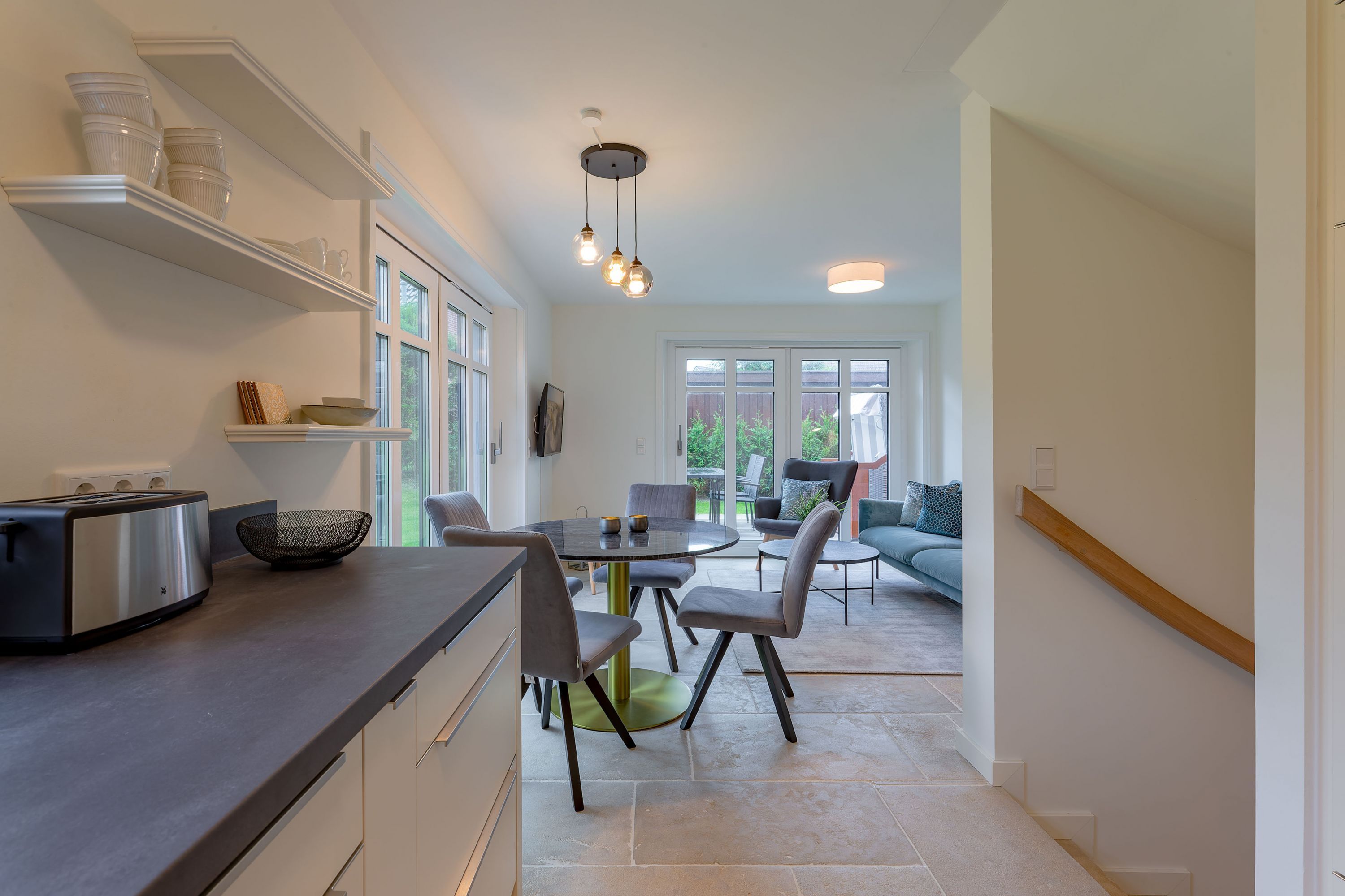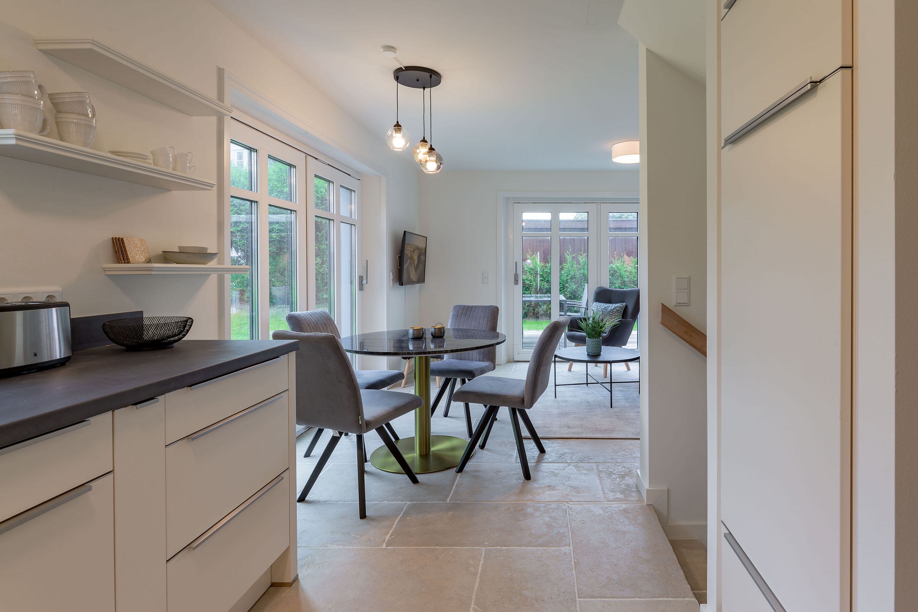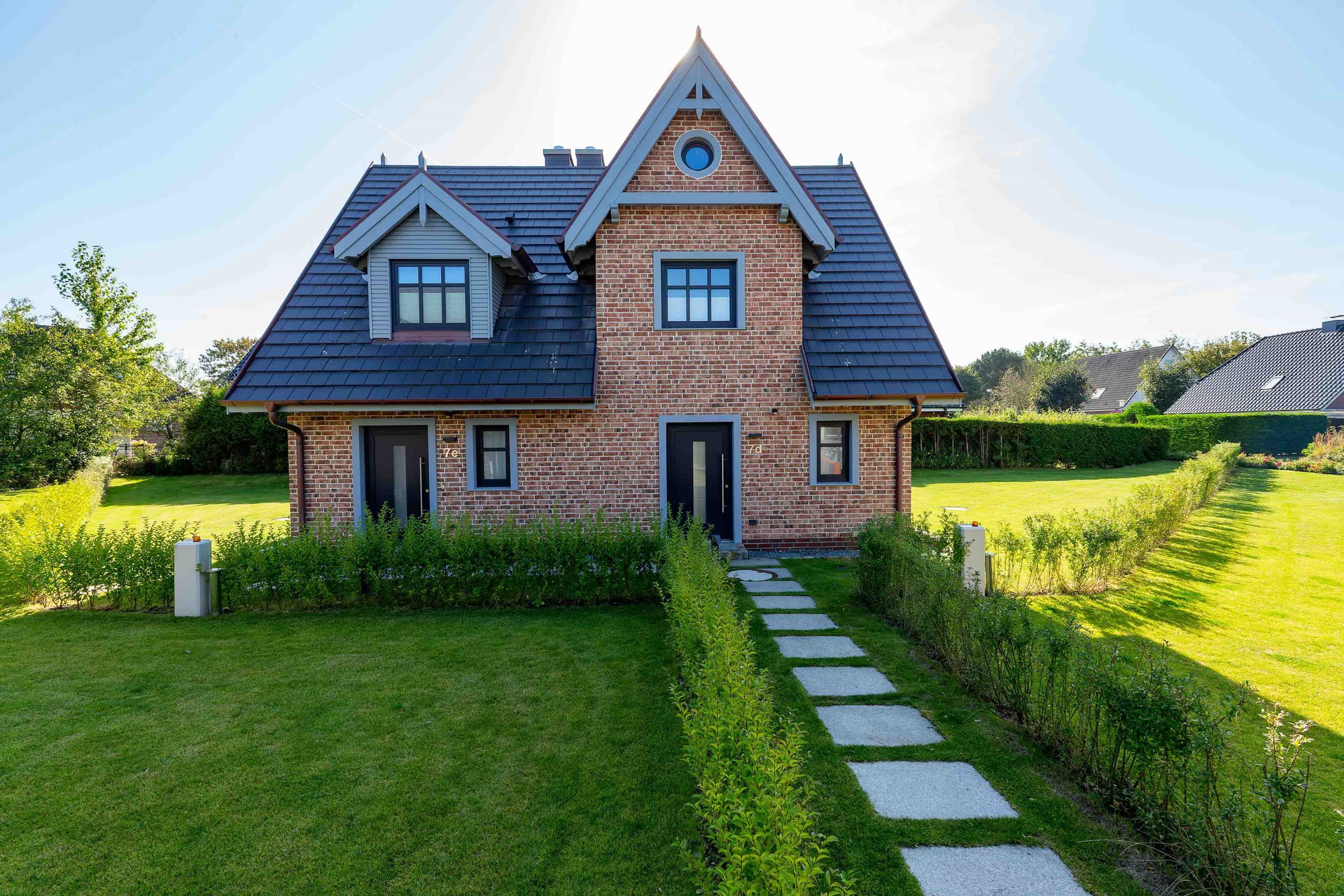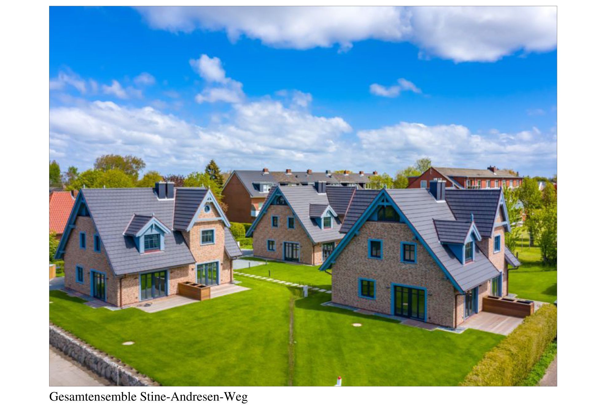 Modernes Wohnen im Stine-Andresen-Weg in Wyk auf Föhr. Der Stine-Andresen-Weg liegt westlich nur wenige Gehminuten vom Zentrum entfernt. Es handelt sich um eine ruhige Nebenstraße, in der sowohl Insulaner als auch Feriengäste leben. In fußläufiger Entfernung gelangen Sie zur Strandpromenade die zum Bummeln einlädt und sich fast 3 km lang erstreckt. Auch der Wyker Stadtwald und der Ortskern in Wyk liegen fußnah zum Stine-Andresen-Weg. Die Haushälfte ist durch die vielen bodentiefen Fenster lichtdurchflutet und modern ausgestattet. Eine Terrasse lädt zum Frühstücken uns relaxen ein. Sowohl im Obergeschoss als auch im Untergeschoss befindet sich ein großes Schlafzimmer mit Doppelbett und jeweils ein Bad mit bodenebener Dusche. Im Untergeschoss steht Ihnen eine Sauna zur Verfügung. Einem erholsamen und entspannten Urlaub steht nichts im Wege egal zu welcher Jahreszeit Sie einen Aufenthalt buchen.
