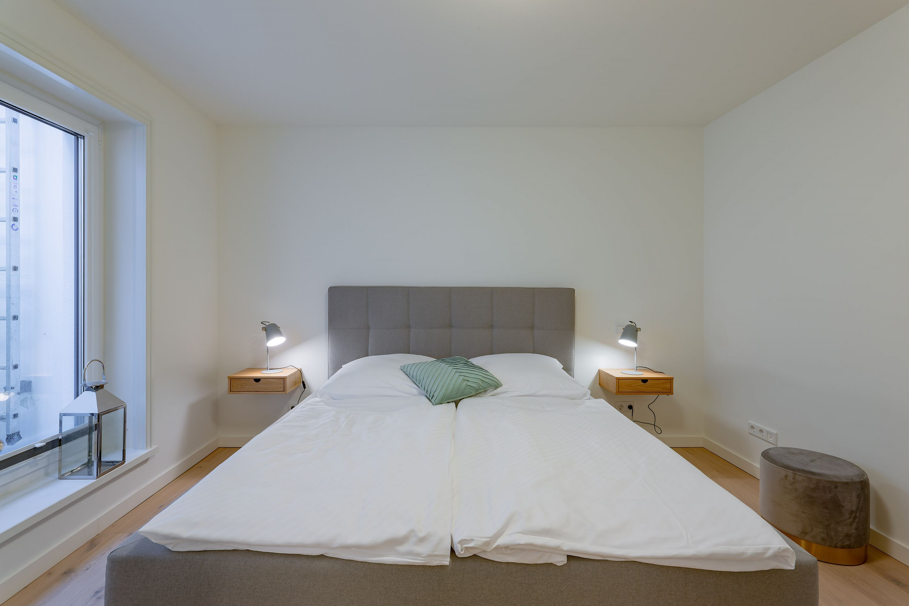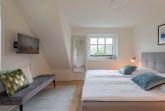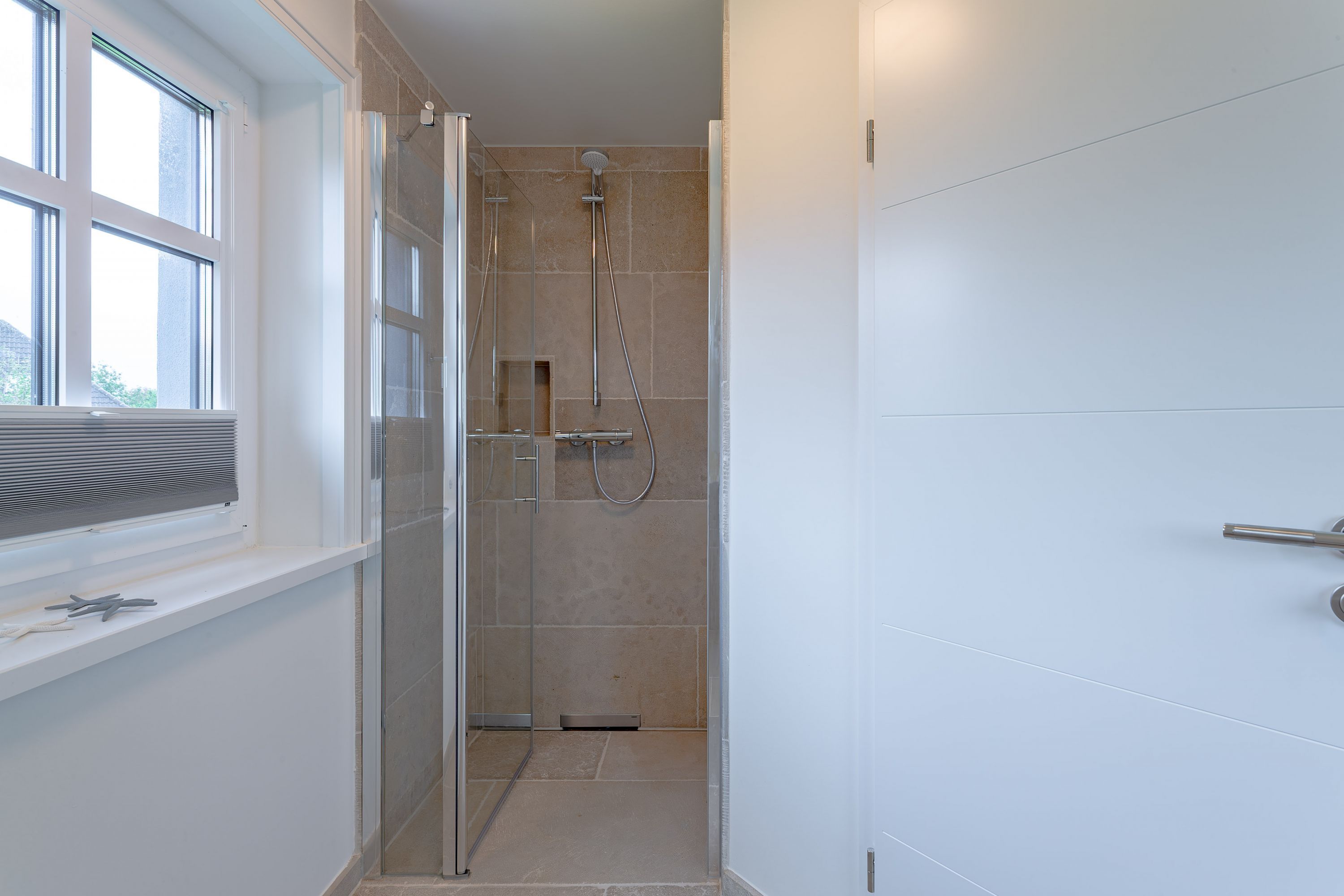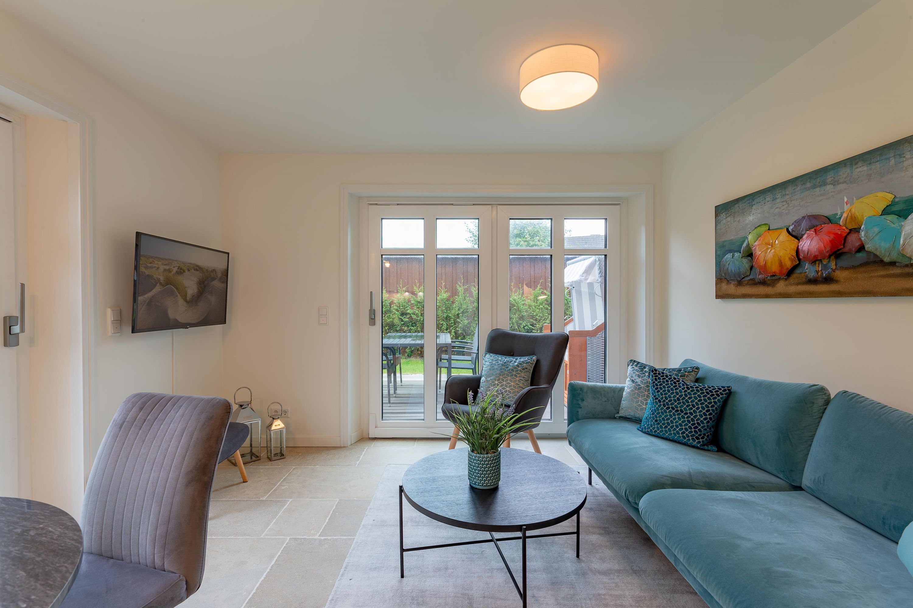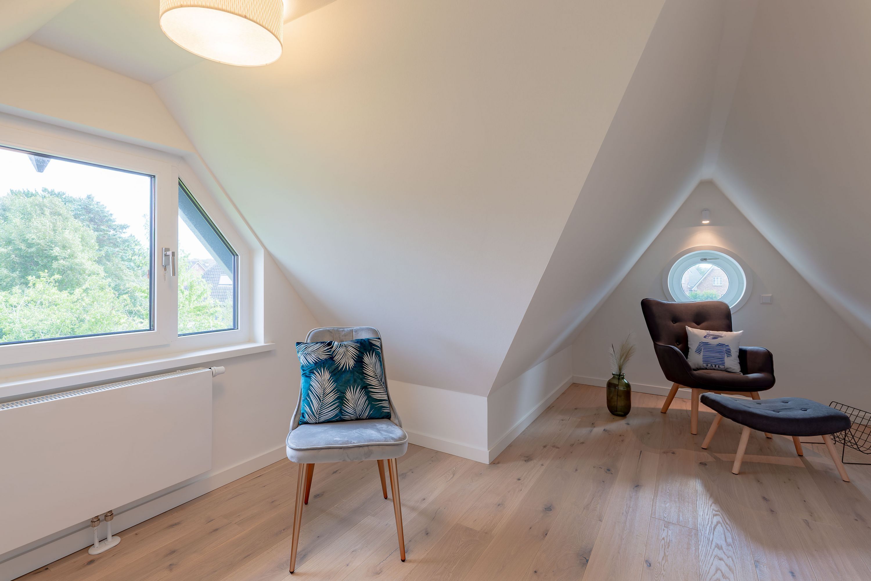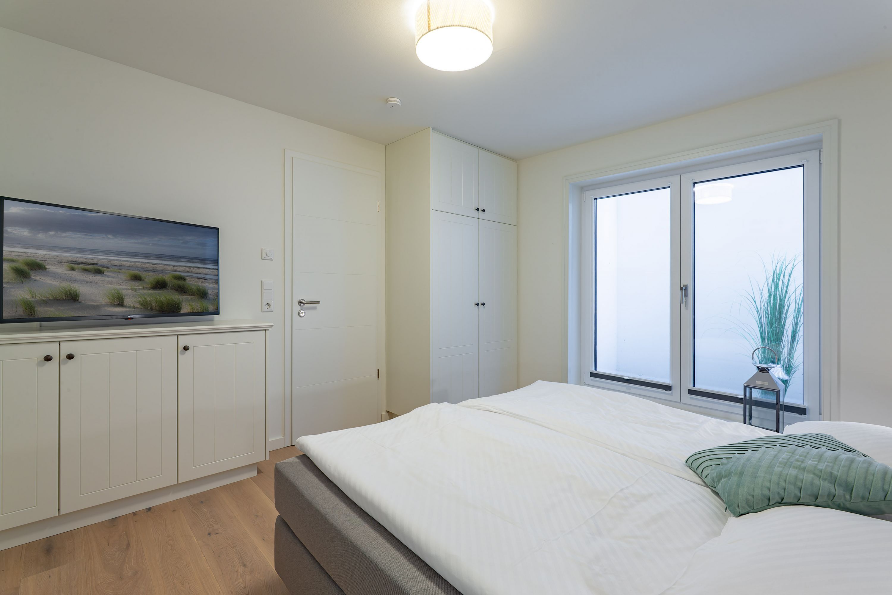 Modernes Wohnen im Stine-Andresen-Weg in Wyk auf Föhr. Der Stine-Andresen-Weg liegt westlich nur wenige Gehminuten vom Zentrum entfernt. Es handelt sich um eine ruhige Nebenstraße, in der sowohl Insulaner als auch Feriengäste leben. In fußläufiger Entfernung gelangen Sie zur Strandpromenade die zum Bummeln einlädt und sich fast 3 km lang erstreckt. Auch der Wyker Stadtwald und der Ortskern in Wyk liegen fußnah zum Stine-Andresen-Weg. Die Haushälfte ist durch die vielen bodentiefen Fenster lichtdurchflutet und modern ausgestattet. Eine Terrasse lädt zum Frühstücken uns relaxen ein. Sowohl im Obergeschoss als auch im Untergeschoss befindet sich ein großes Schlafzimmer mit Doppelbett und jeweils ein Bad mit bodenebener Dusche. Im Untergeschoss steht Ihnen eine Sauna zur Verfügung. Einem erholsamen und entspannten Urlaub steht nichts im Wege egal zu welcher Jahreszeit Sie einen Aufenthalt buchen.