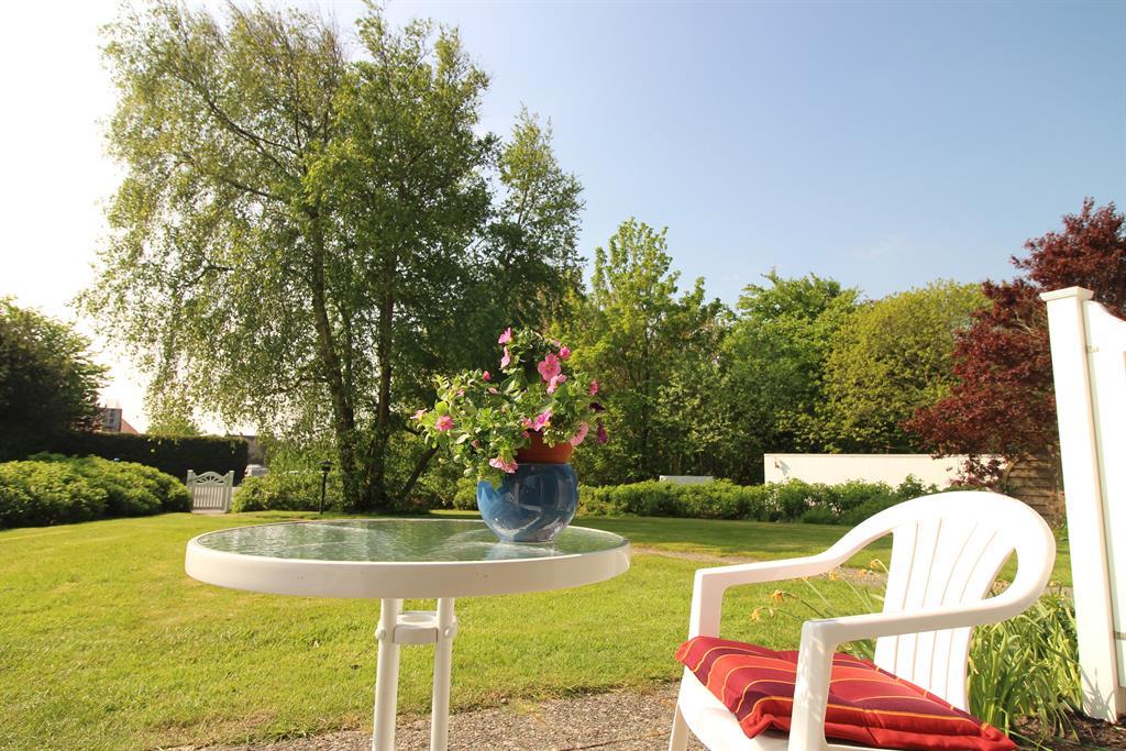 Gartenmöbeln und Sonnenschirm zum Entspannen ein.