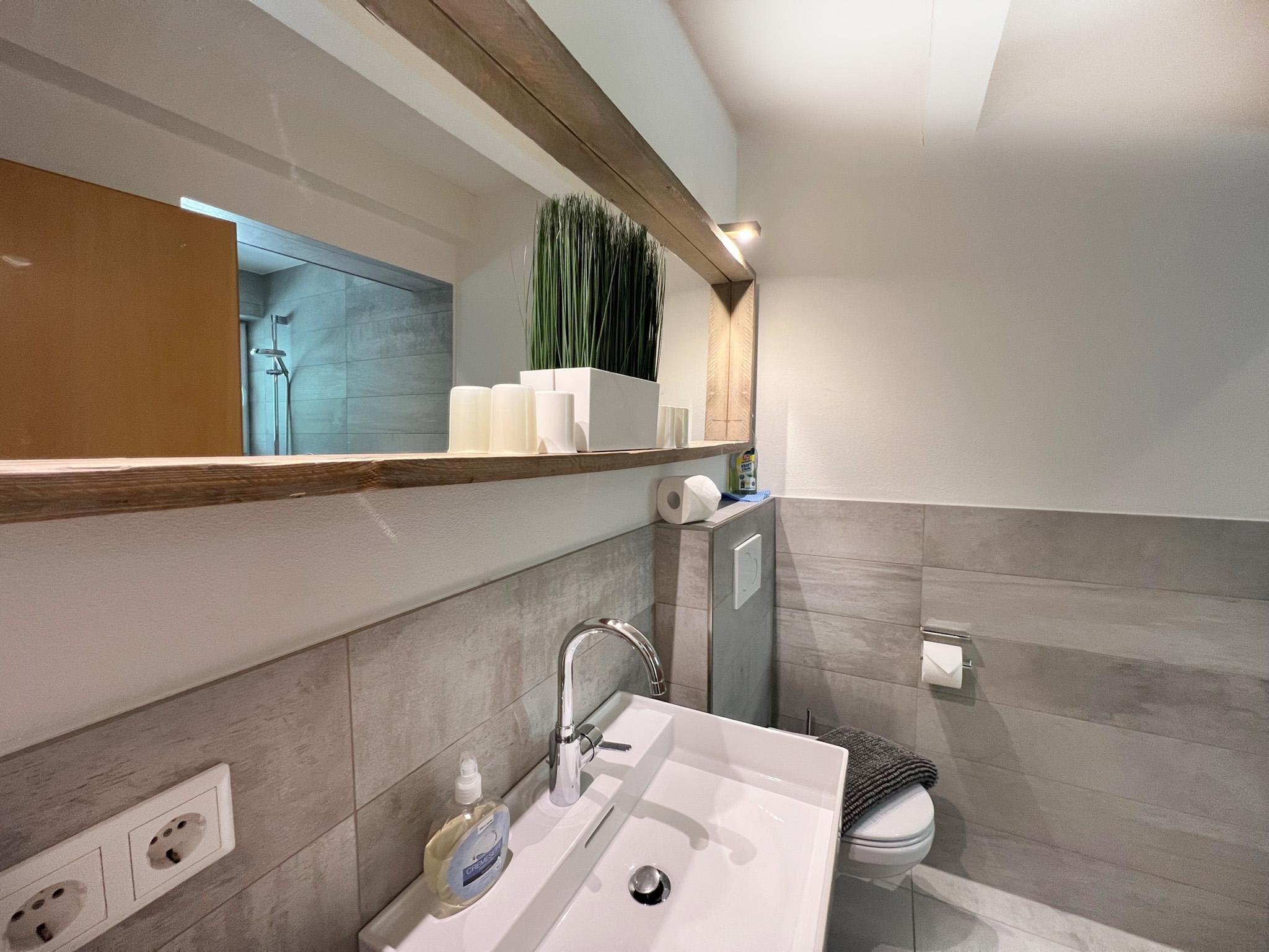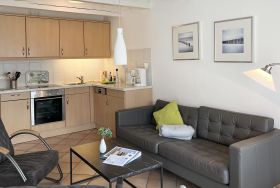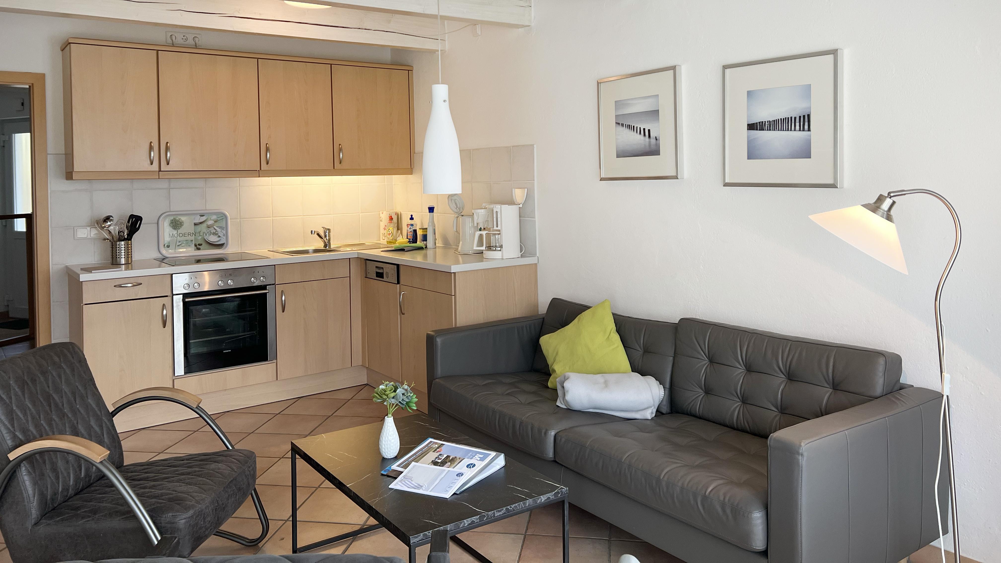 • komplett eingerichtete Küche, Backofen, Geschirrspüler, Kühlschrank mit Gefrierfach, Wasserkocher, Kaffeemaschine (Filter), Toaster.