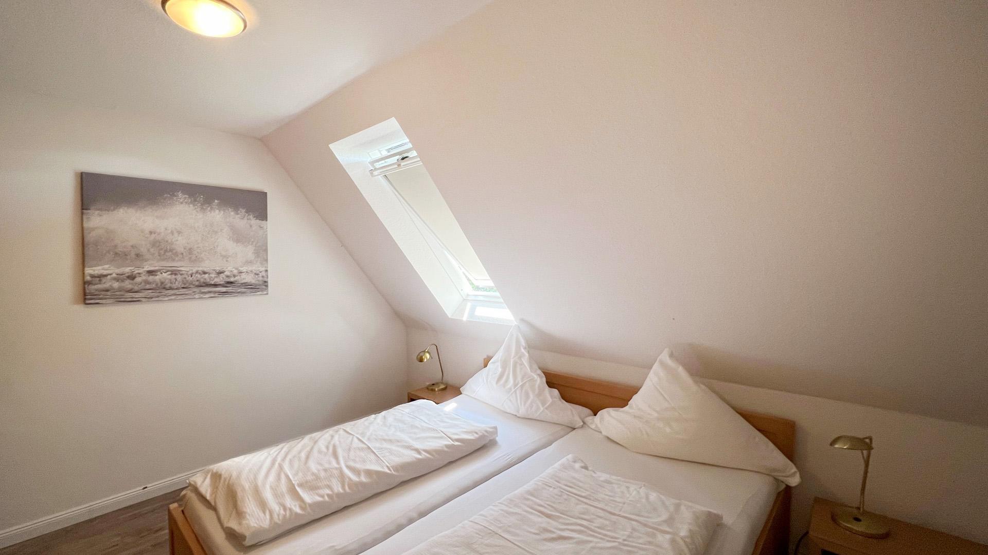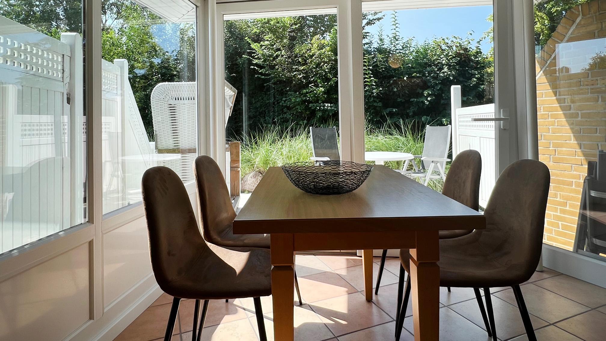 Im Erdgeschoss befindet sich die Eingangsdiele mit einer gradläufigen Treppe nach oben zu den beiden Schlafzimmern.1 Schlafraum mit Doppelbett 180x200cm mit getrennten Matratzen, ein Schlafraum mit 2 Einzelbetten (90x200cm). Das Zustellen eines Kinderreisebettes oder Hochstuhles ist kein Problem. Abgehend von der Eingangsdiele, der Wohn-Essraum mit voll ausgestatteter Küchenzeile, gemütlicher Sitzecke und Essecke im raumhoch verglasten Wintergarten, direkter Zugang zu einer, mit einer kleinen Sanddüne eingefassten Terrasse und Garten. Das Duschbad ist komplett neu in 2018, ausgestattet mit begehbarer Dusche, WC, Waschbecken und Außenfenster.