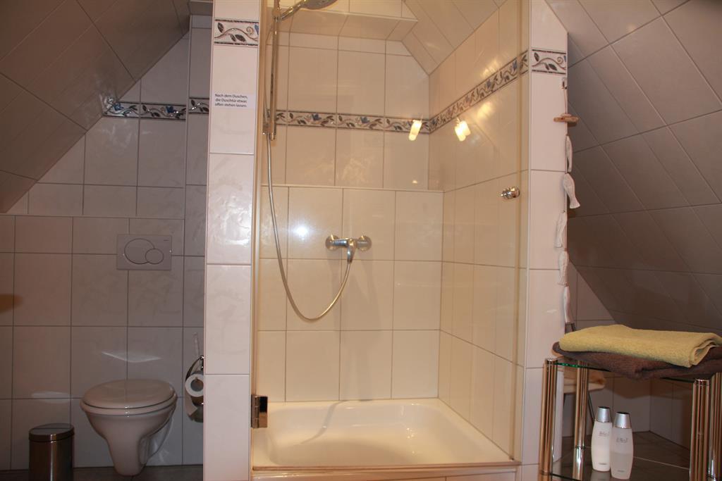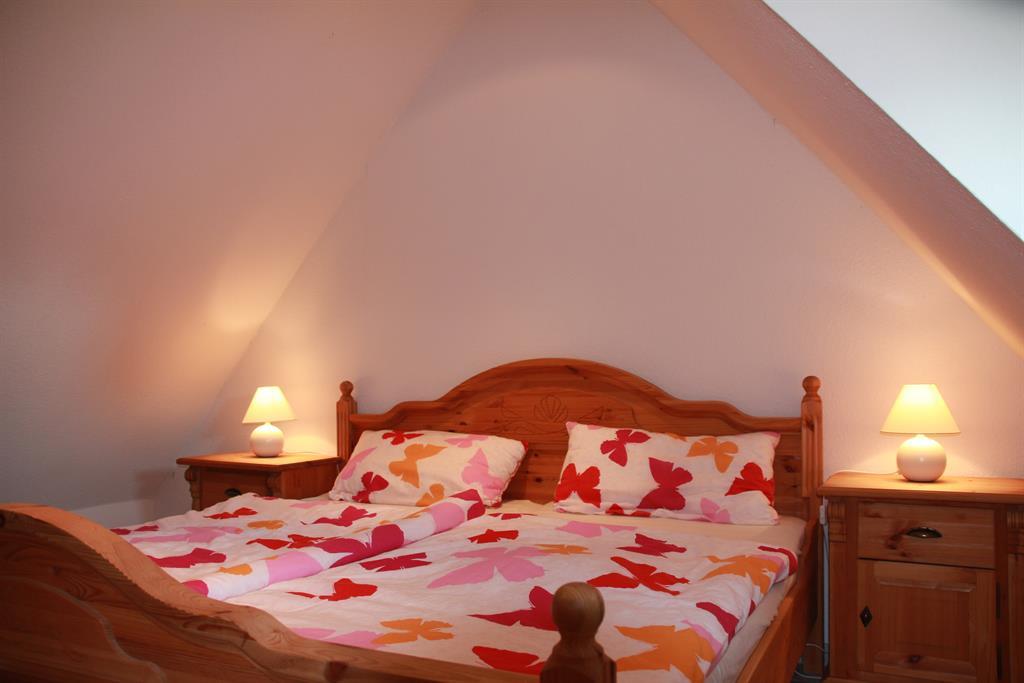 In der oberen Etage finden Sie unter dem Spitzdach ein Schlafzimmer mit einem Doppelbett (1,80 x 2,00 m) und ein großzügiges Duschbad.