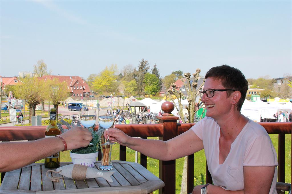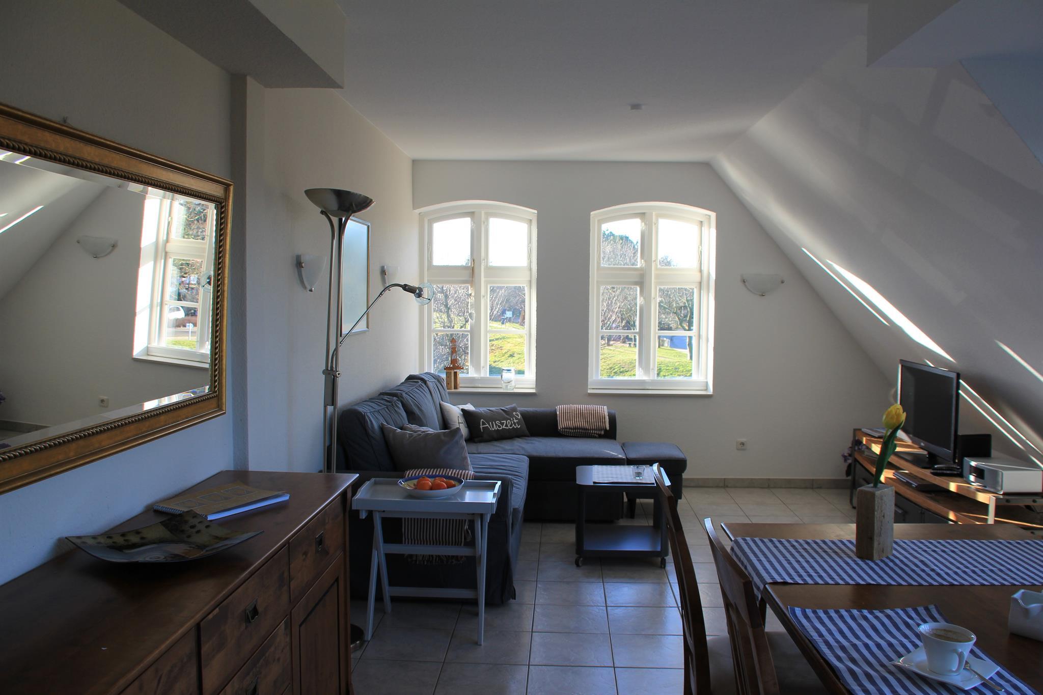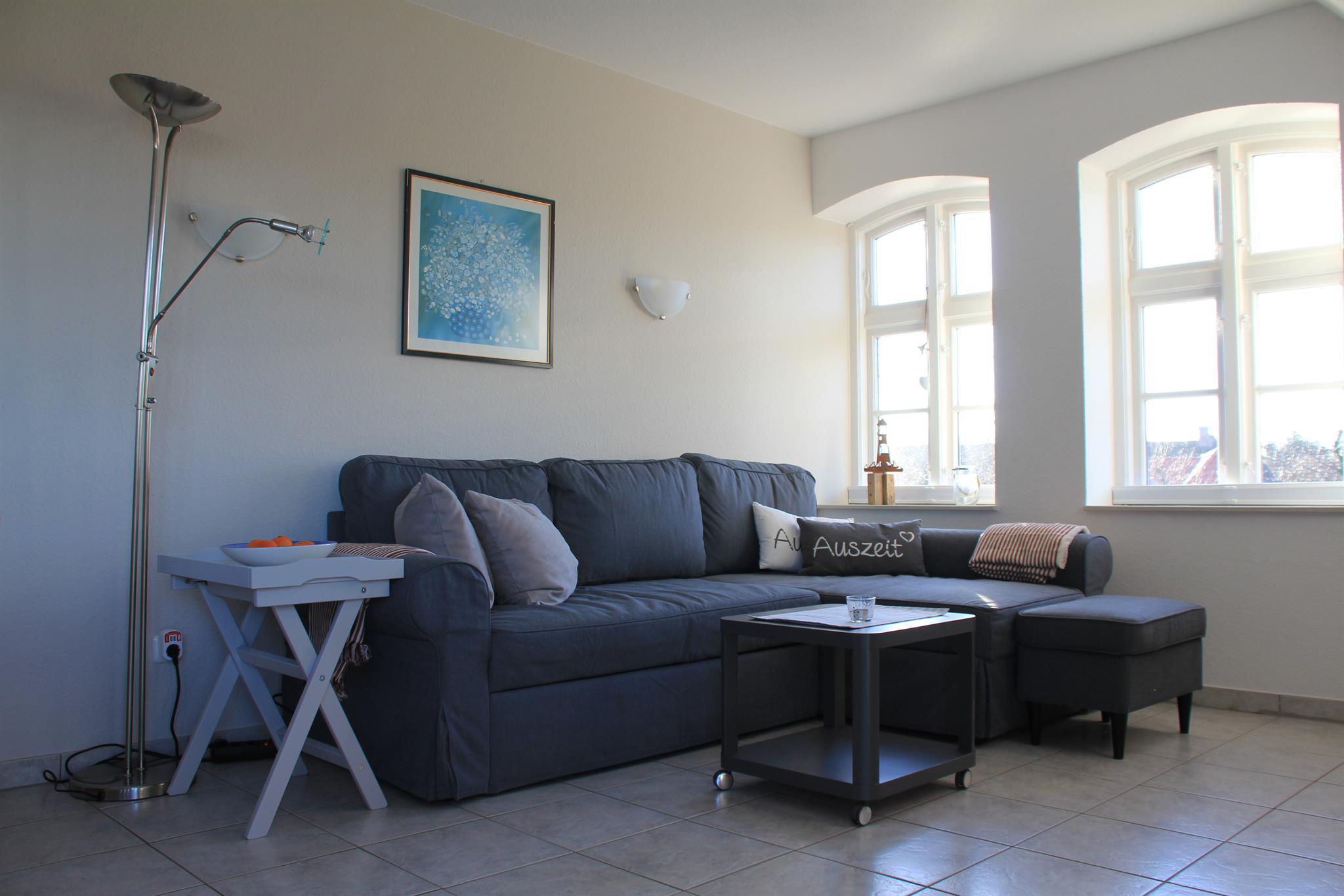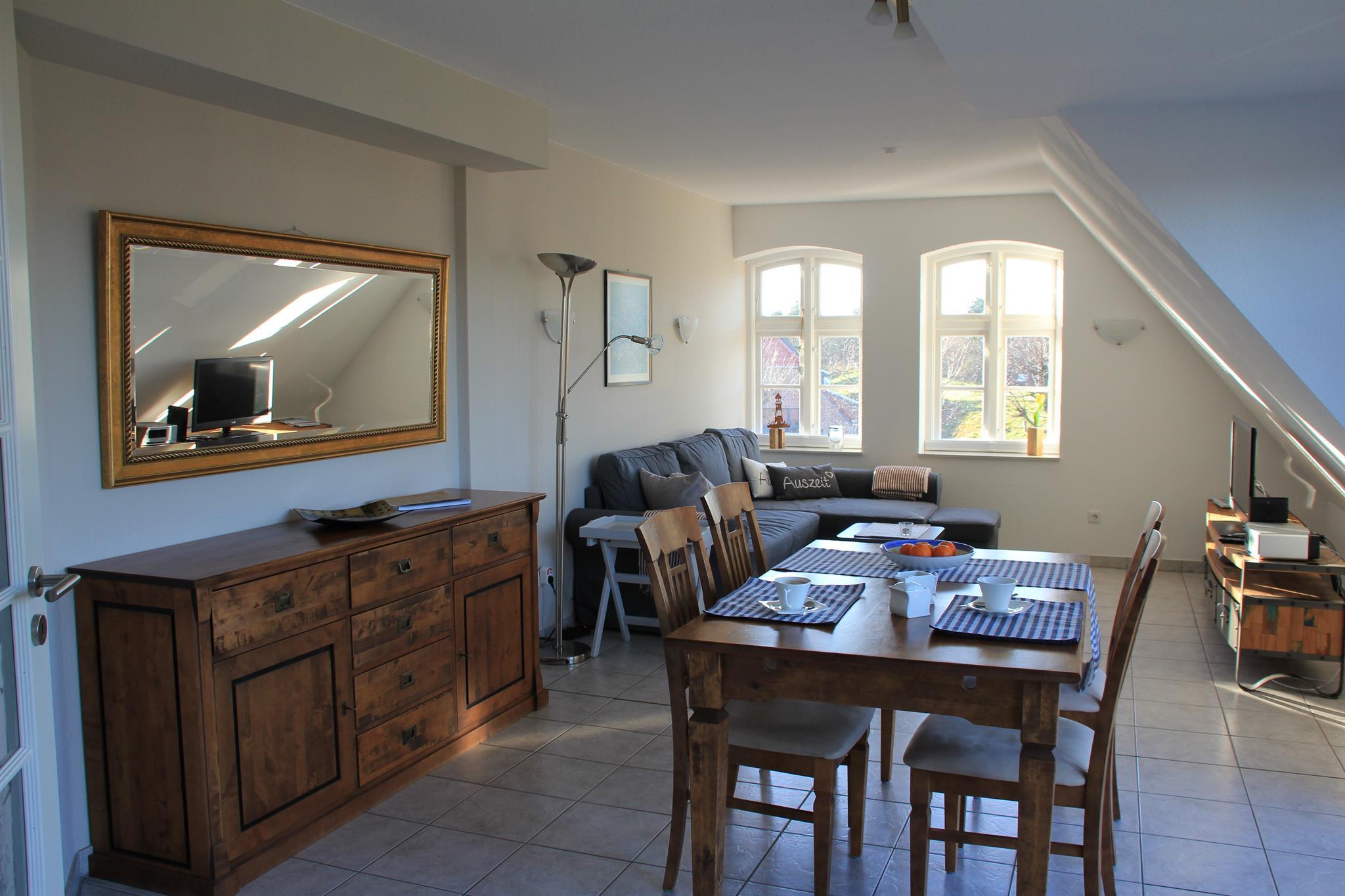 Nach einem Bummel in der Fußgängerzone von Dorf mit vielen Geschäften, Cafés und Restaurants, in der Sie direkt wohnen, oder einem Spaziergang auf dem Deich, den Sie in fünf Minuten zu Fuß erreichen, können Sie es sich im gemütlichen Wohn-/Essbereich mit Schlafcouch (1,60 x 2,00 m) oder auf dem West-Balkon gemütlich machen.
