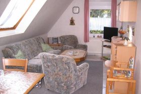 Zur Erdgeschosswohnung 1 (ca. 70 qm) gehört ein Wohn- Essbereich mit integrierter Küchenzeile, welche über div. elektrische Geräte wie Mikrowelle, Kaffeemaschine, Wasserkocher usw. verfügt. Sat-TV und Radio/CD sind ebenfalls vorhanden. Außerdem gehören zwei Schlafräume (Doppel- u. Zweibett) und ein Bad mit Dusche/WC dazu.