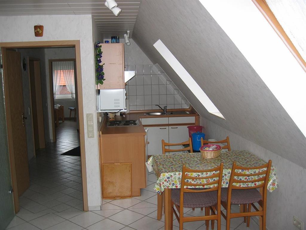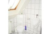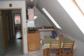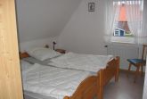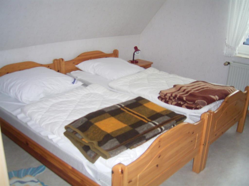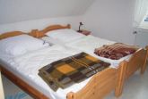 Oberhalb der Garage befindet sich die Ferienwohnung 3. Hier steht Ihnen auf einer Wohnfläche von c. 30 m² ein gemütlich eingerichteter Wohn-Essraum mit Sat-TV, eine separate komplett eingerichtete Küchenzeile mit Backofen und Cerankochfeld, eine Mikrowelle sowie eine Kühlgefrierkombination zur Verfügung. Ein Schlafzimmer mit Doppelbett sowie eine weitere Schlafgelegenheit mit zwei einzelnen Betten im ausgebauten Dachstuhl, der nur durch eine Raumspartreppe zu erreichen ist. Aus diesem Grund wird die Wohnung erst für Kinder ab 5 Jahren vermietet. Ein Bad mit Dusche/WC gehört ebenfalls zur Ausstattung dazu