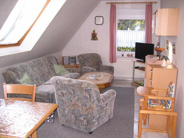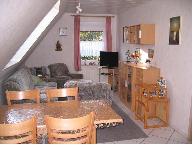 Zur Ferienwohnung im Obergeschoß gehört ein Wohn- Essraum mit F-TV, Radio/CD sowie eine integrierte Küchenzeile. Diese ist mit einem Toaster, Mikrowelle, Kaffeemaschine, Eierkocher, Wasserkocher ausgestattet. Zwei getrennte Schlafzimmer (Doppel- u. Zweibett) gehören zur Ausstattung dazu genauso wie ein Bad mit Dusche/WC. Für unsere kleinen Gäste steht ein Kinder Reisebett zur Verfügung.
