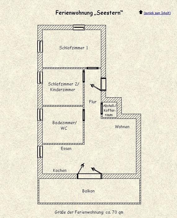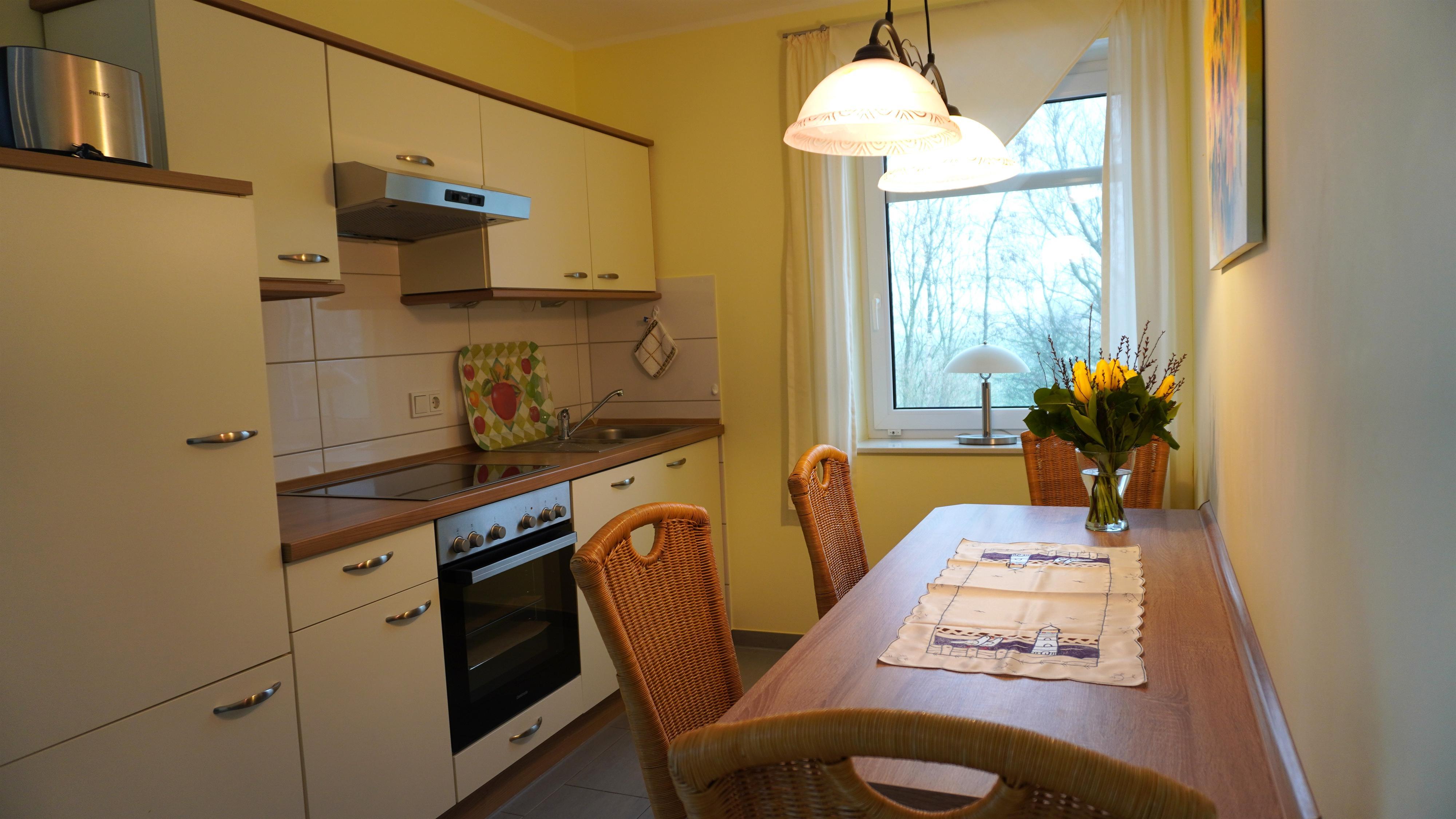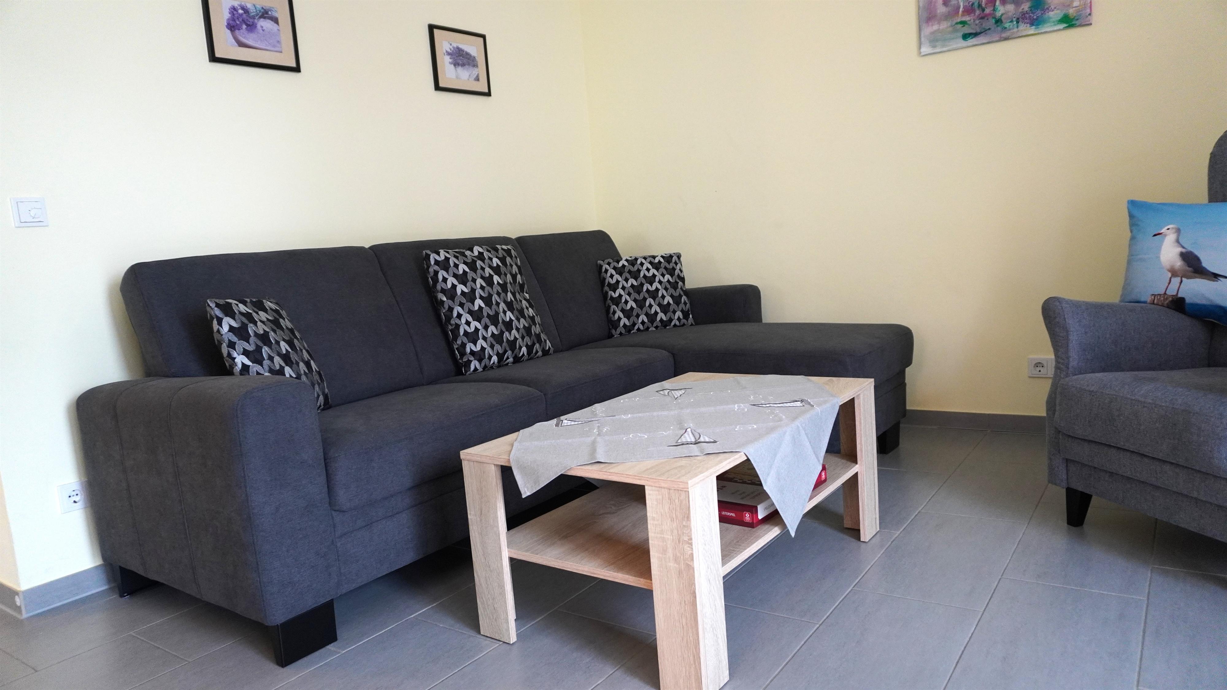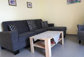 Die Wohnung „Seewind“ befindet sich im Obergeschoss des Hauses und hat einen Balkon. Es gibt eine separate vollausgestattete Küche mit Esstisch, eine Wohnzimmer mit gemütlicher Ledergarnitur und Sat-TV. Als Schlafmöglichkeiten dienen ein Doppel- und ein Zweibettzimmer. Bad mit Dusche und WC.