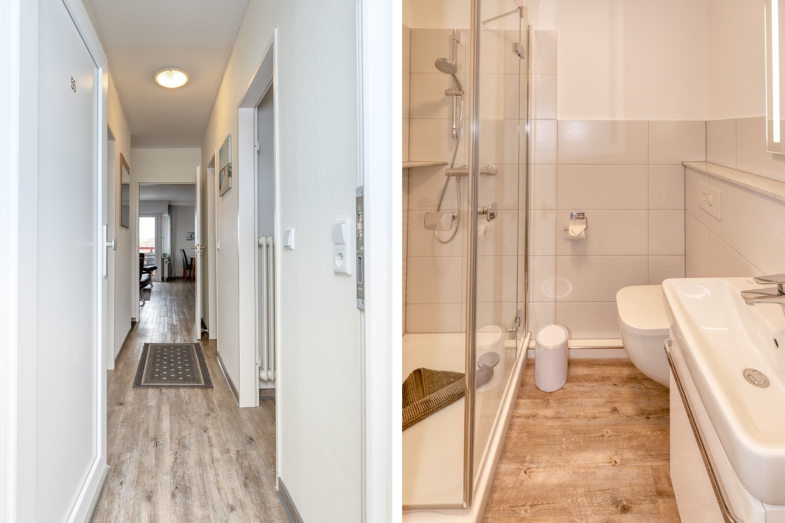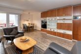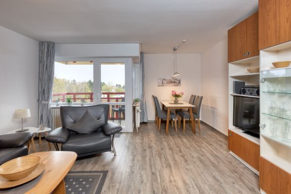 Das Appartement 55 ist ein 2-Raum-Appartement im 4. Obergeschoss für bis zu 4 Personen mit 45 qm. Der möblierte Ostbalkon bietet morgens Sonne und nachmittags Schatten.