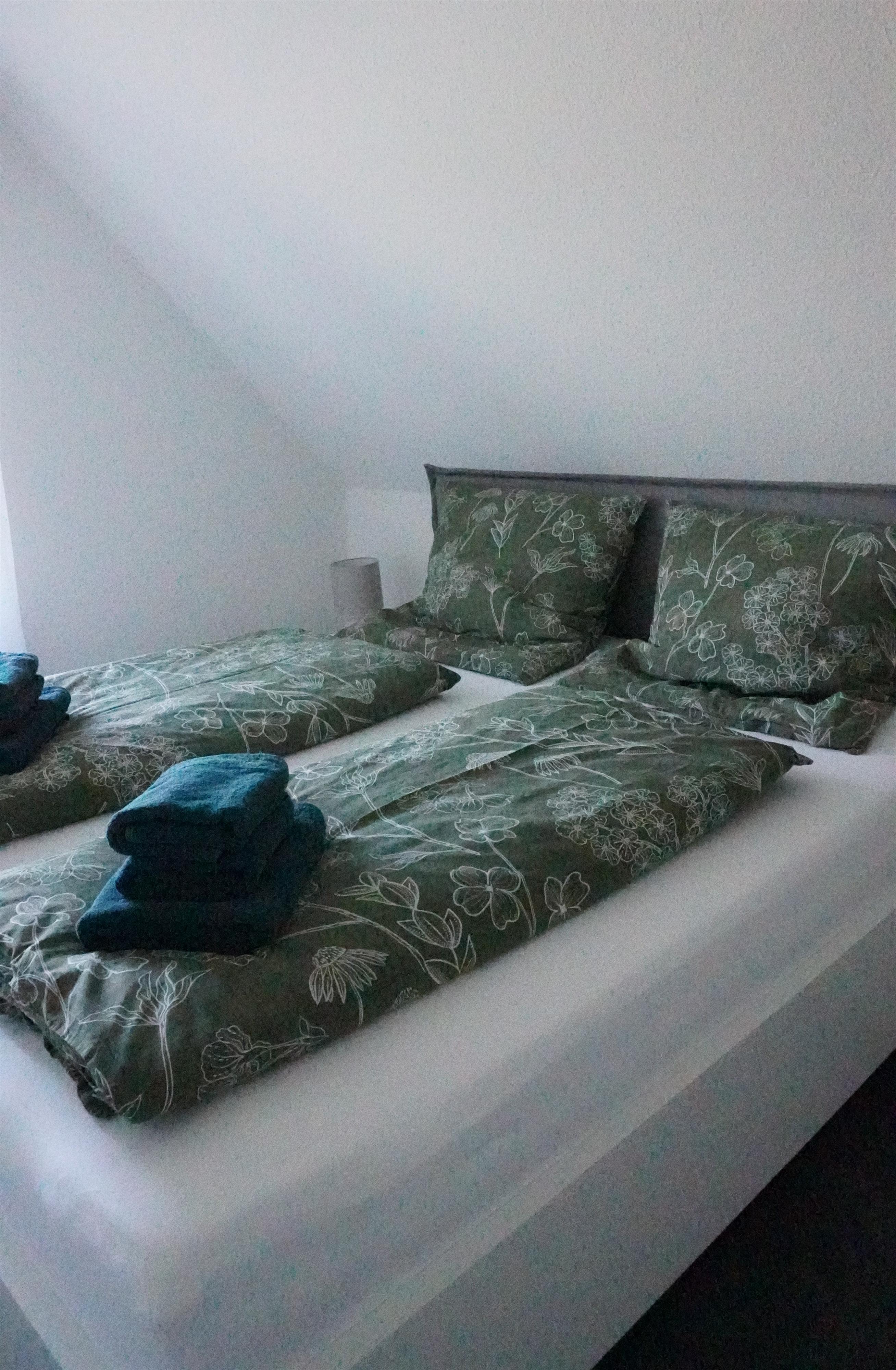 Die Wohnung erstreckt sich über 2 Etagen. Im Erdgeschoss erwartet Sie neben einer komplett eingerichteten Küche, mit u.a. einer Spülmaschine und einer Mikrowelle. Auch ein Gäste-WC finden Sie unten. Im Wohnzimmer stehen Ihnen eine gemütliche Sofalandschaft mit TV sowie ein Sommergarten zur Verfügung. Infos und Bücher geben Ihnen Tips für einen entspannten Aufenthalt. Im Obergeschoss befinden sich zwei Schlafzimmer (2 Doppelbetten mit 90x 200 cm Matratzen). Im Bad mit Tageslicht befinden sich ein WC , Waschbecken und Dusche.