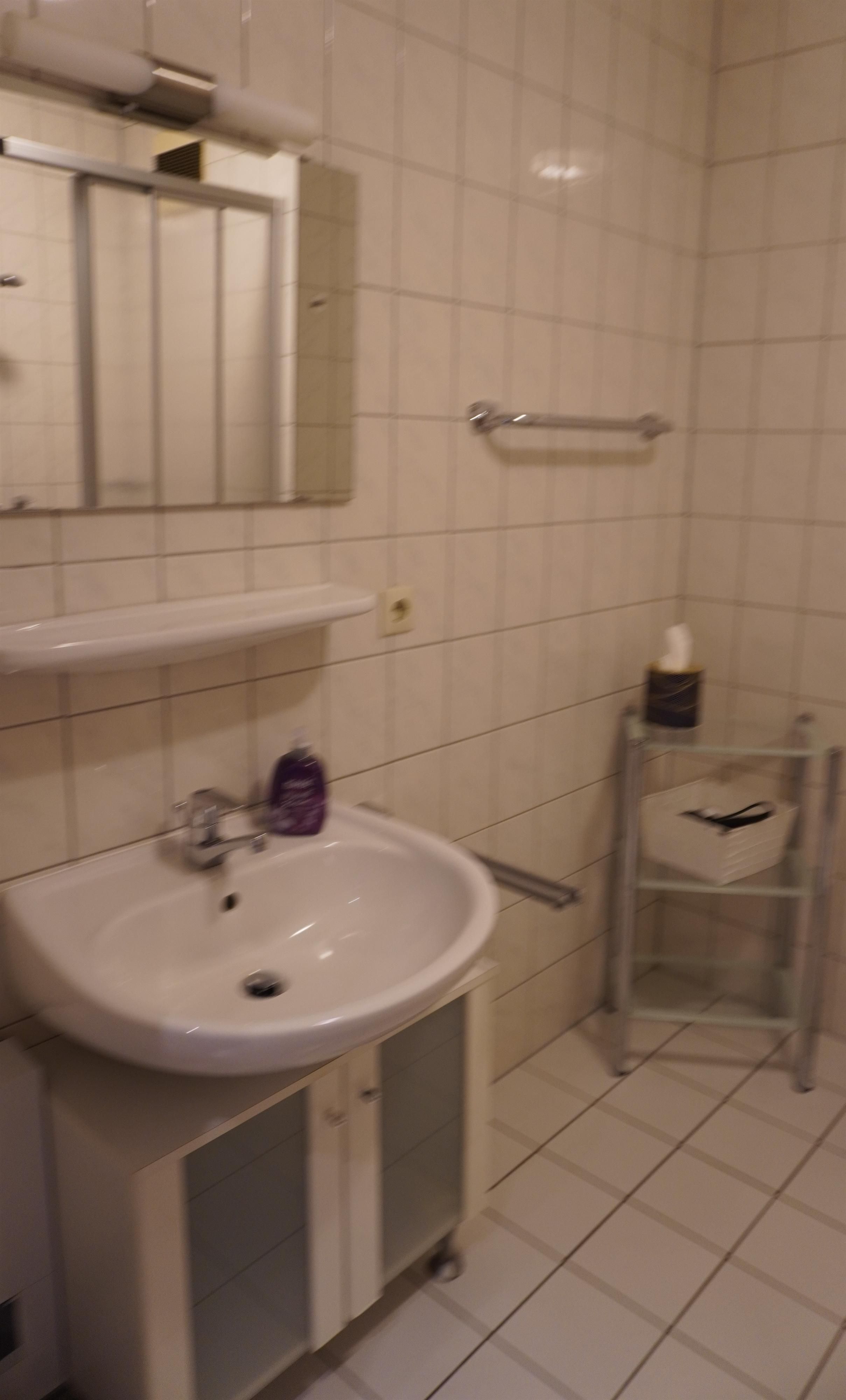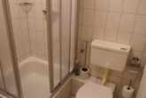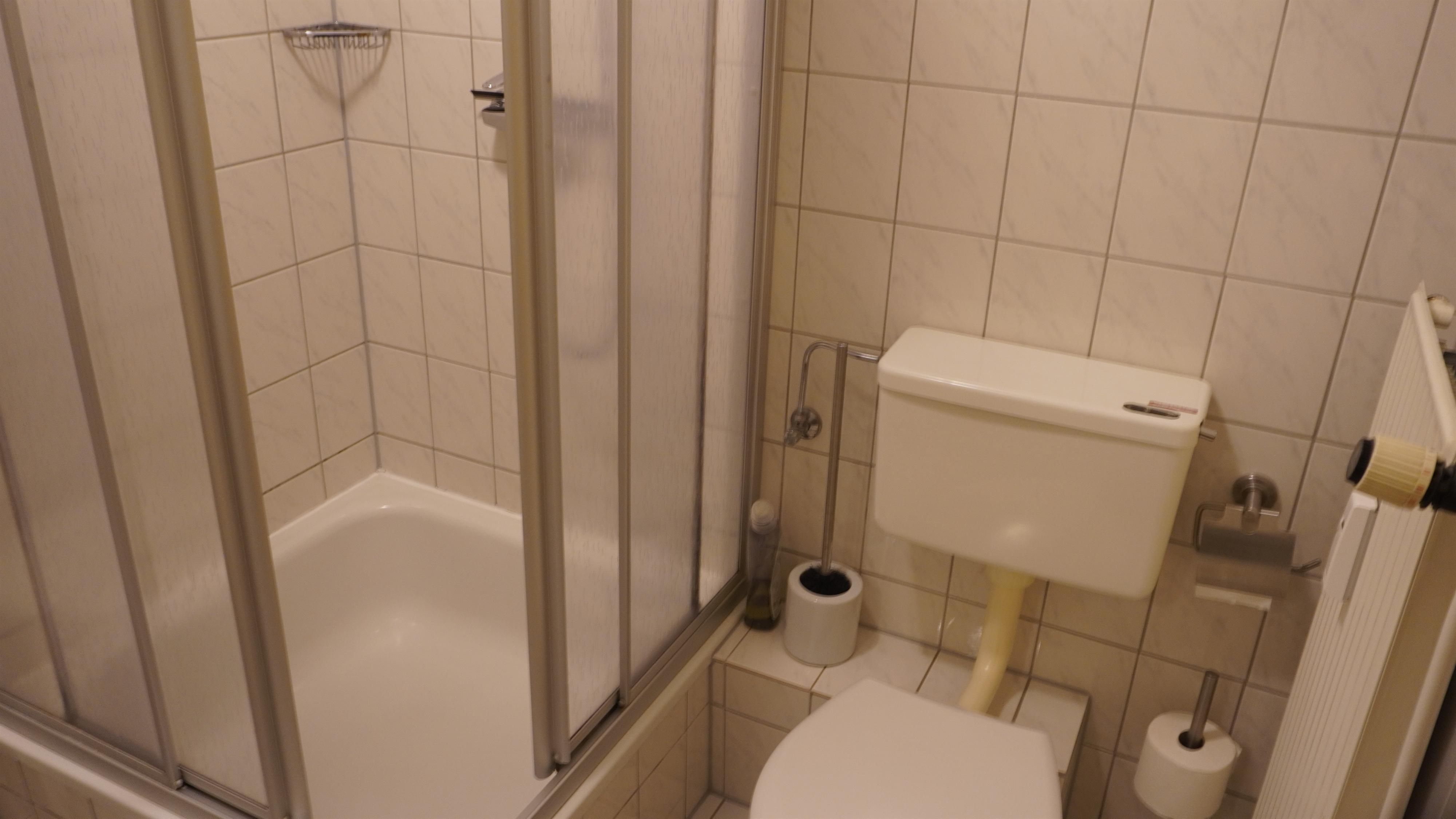 Im Bad befindet sich eine Dusche mit Sitzstuhl sowie das WC und Waschbecken.