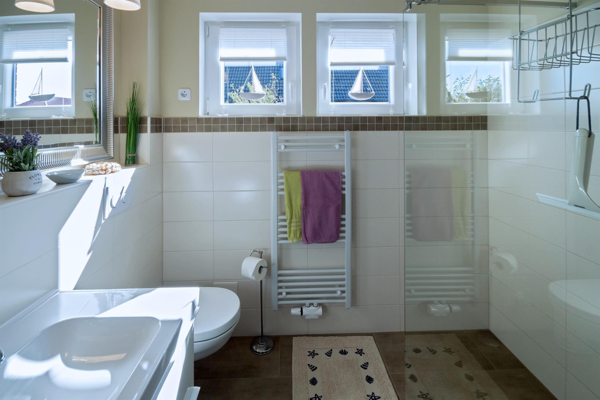 Im Obergeschoss gelangen Sie dann durch einen großen Flur, zu den drei Schlafzimmern. Zwei Zimmer sind mit jeweils einem Doppelbett ausgestattet, im dritten Schlafzimmer befindet sich ein Einzelbett. Dieses kann man bei Bedarf ausziehen und zu einem Doppelbett umfunktionieren. Alle Zimmer sind mit einem Kleiderschrank ausgestattet. Außerdem befindet sich auf der 1. Etage ein Gäste- WC.