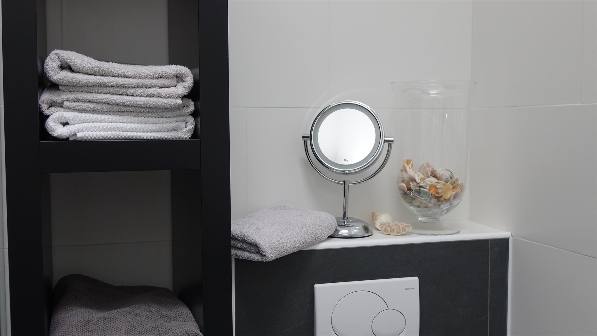 Zwei Zimmer, Küche, Bad und eine Dachterrasse mit Grill. Das Schlafzimmer mit Doppelbett (180 x 200 cm, Allergiker-geeignet mit milbendichtem Matratzenbezug). Hinter dem Schlafzimmer ist eine geräumige Kammer, in der Sie Ihre Koffer abstellen können. Das Sofa im Wohnzimmer lässt sich zu einer Schlafcouch (130 x 200 cm) verwandeln, so dass auch bis zu vier Personen hier übernachten können.
