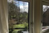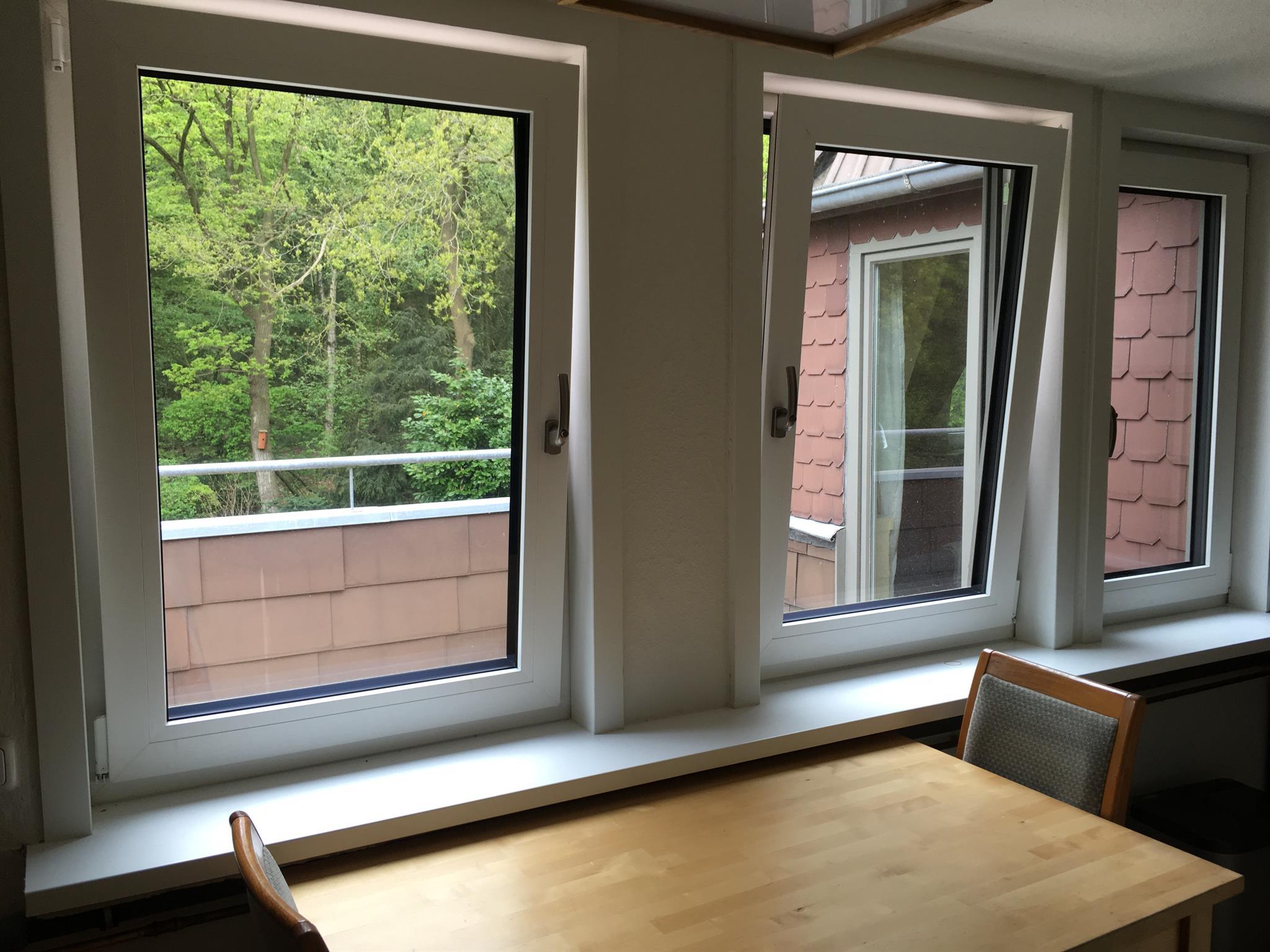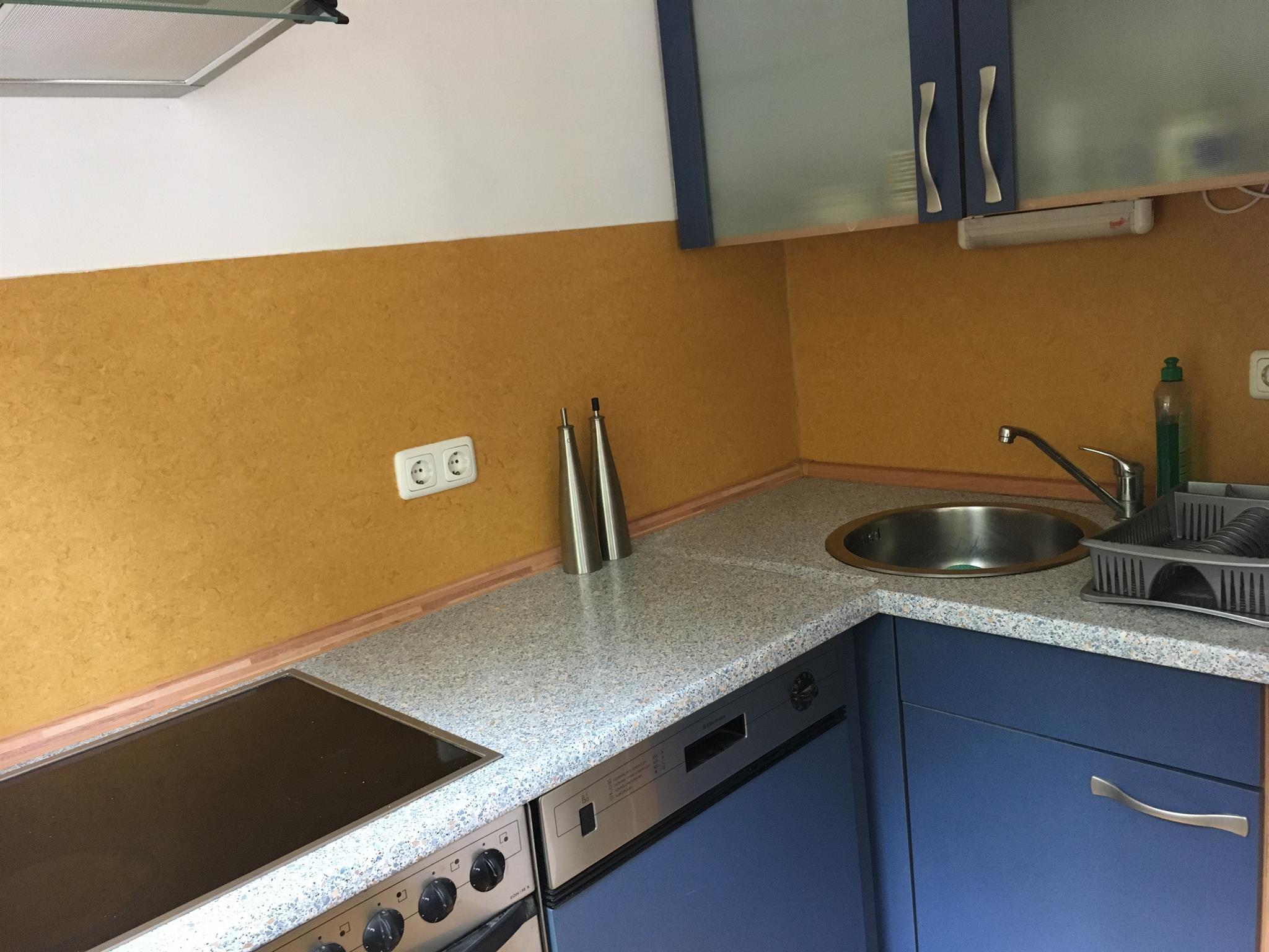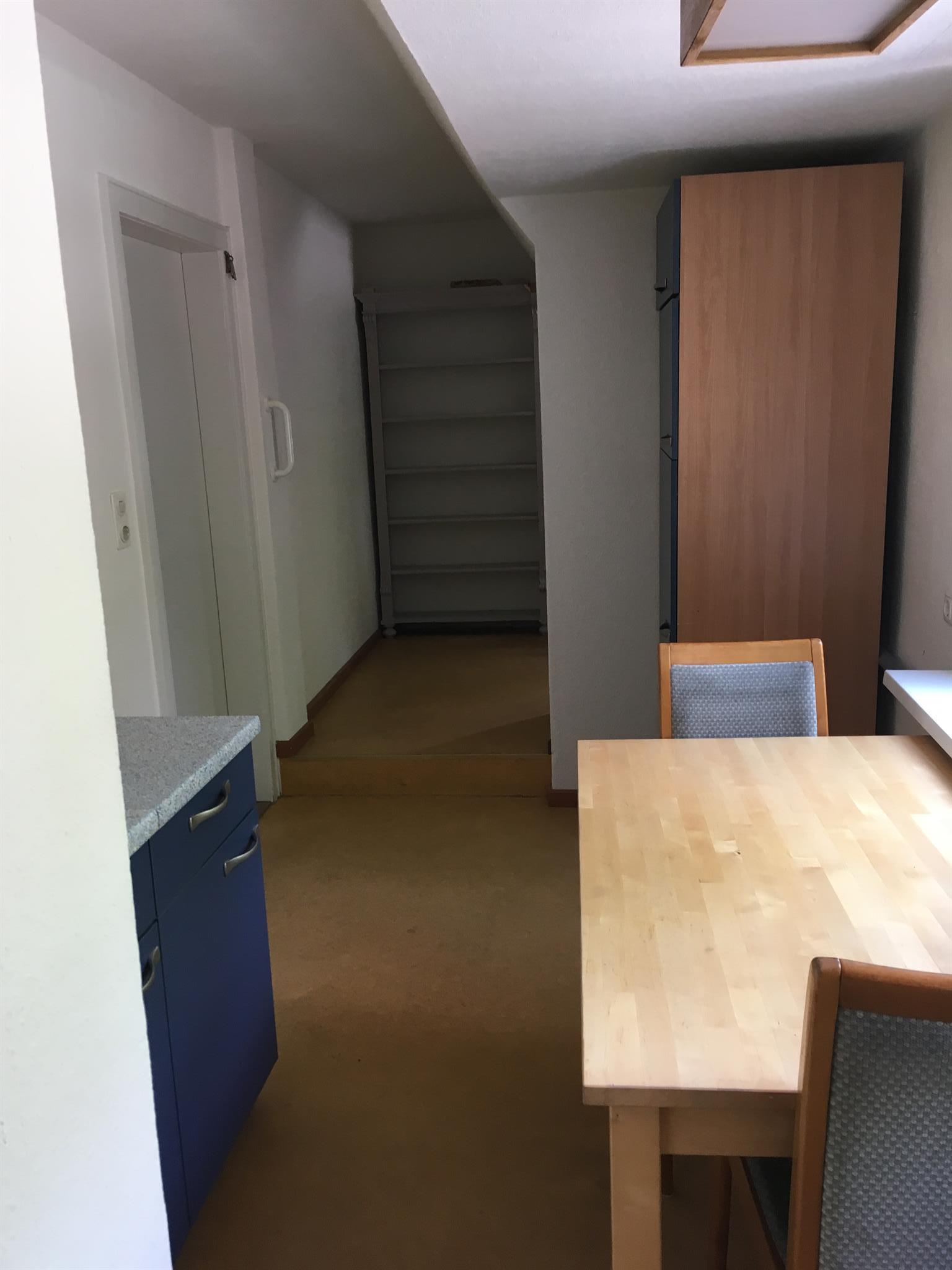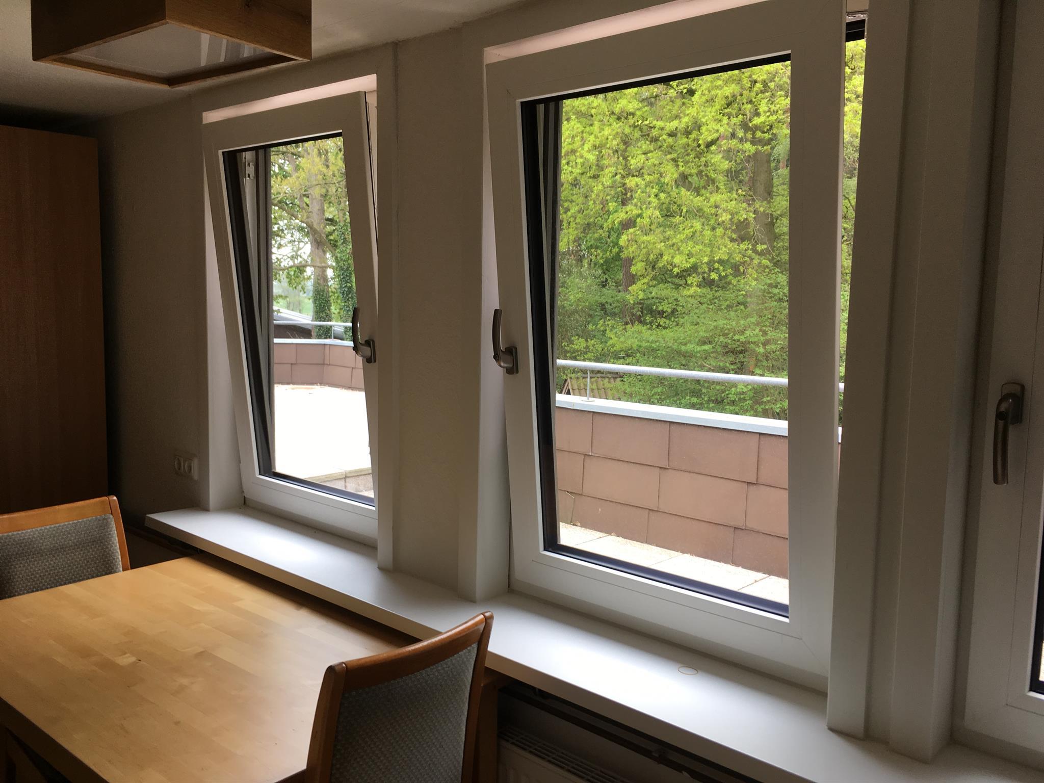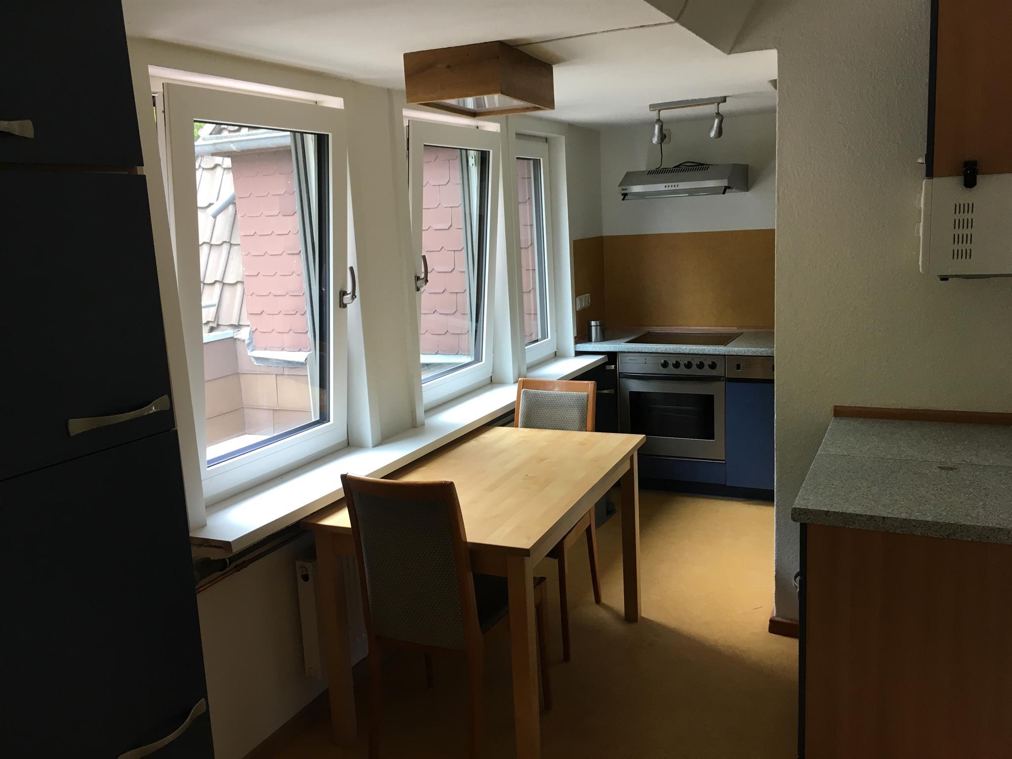 Küchenmitbenutzung zusammen mit einem anderen Mieter. Es ist eine Wohnküche, von der man auf den angrenzenden Wald schaut. Hier befindet sich auch die Waschmaschine.