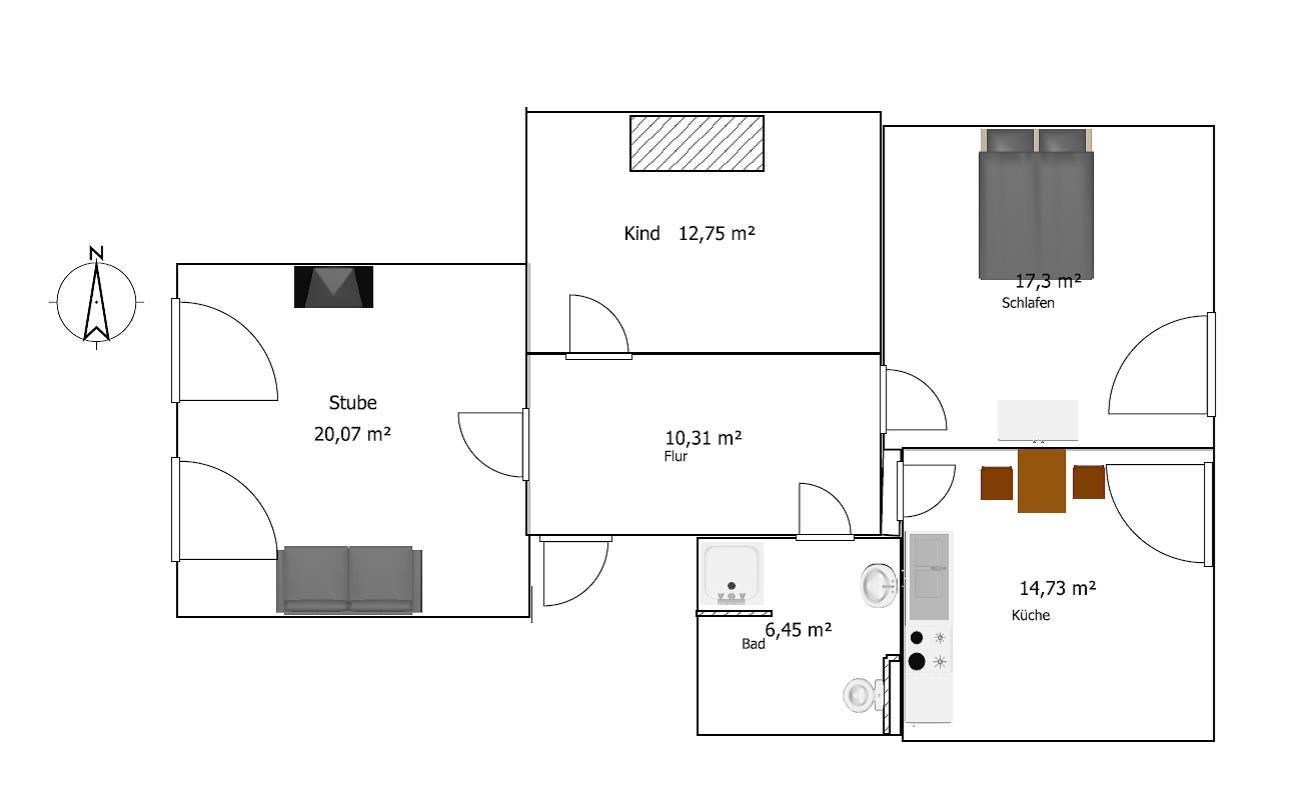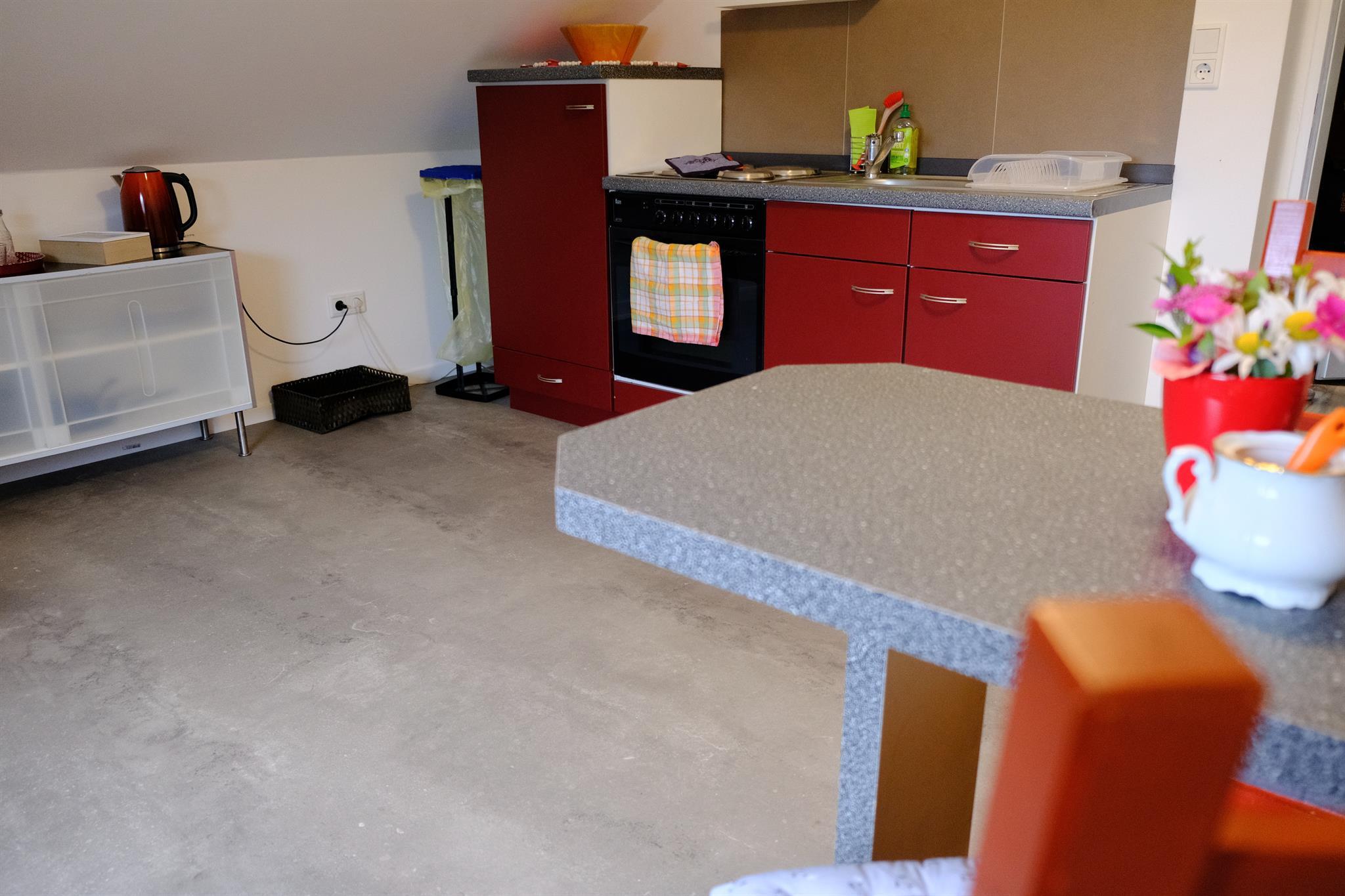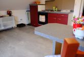 Die Wohnung befindet sich im Dachgeschoss und umfasst eine Küche mit Sitzgelegenheiten, ein Wohnimmer mit gemütlichem Sofa, sowie einen zusätzlichen Raum.