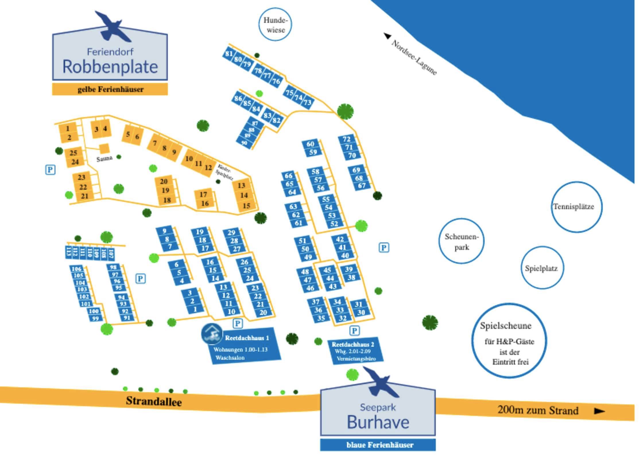 Unser Feriendorf Robbenplate mit seinen 25 exklusiven Doppel-, Reihenhäusern und einem Saunahaus befindet sich in zentraler Lage in Burhave und ist nur 200 m vom Strand entfernt. Die vielfältigen Freizeitaktivitäten wie die Spielscheune und die Nordseelagune sind in wenigen Gehminuten erreichbar. Die exklusiven und familienfreundlichen 3 bis 5-Zimmerhäuser sind modern ausgestattet und lassen keinerlei Komfort vermissen. Sie bieten im Erd- und Obergeschoss Platz für bis zu 8 Personen (großzügige Raumaufteilung auf rund 78 86 m²).