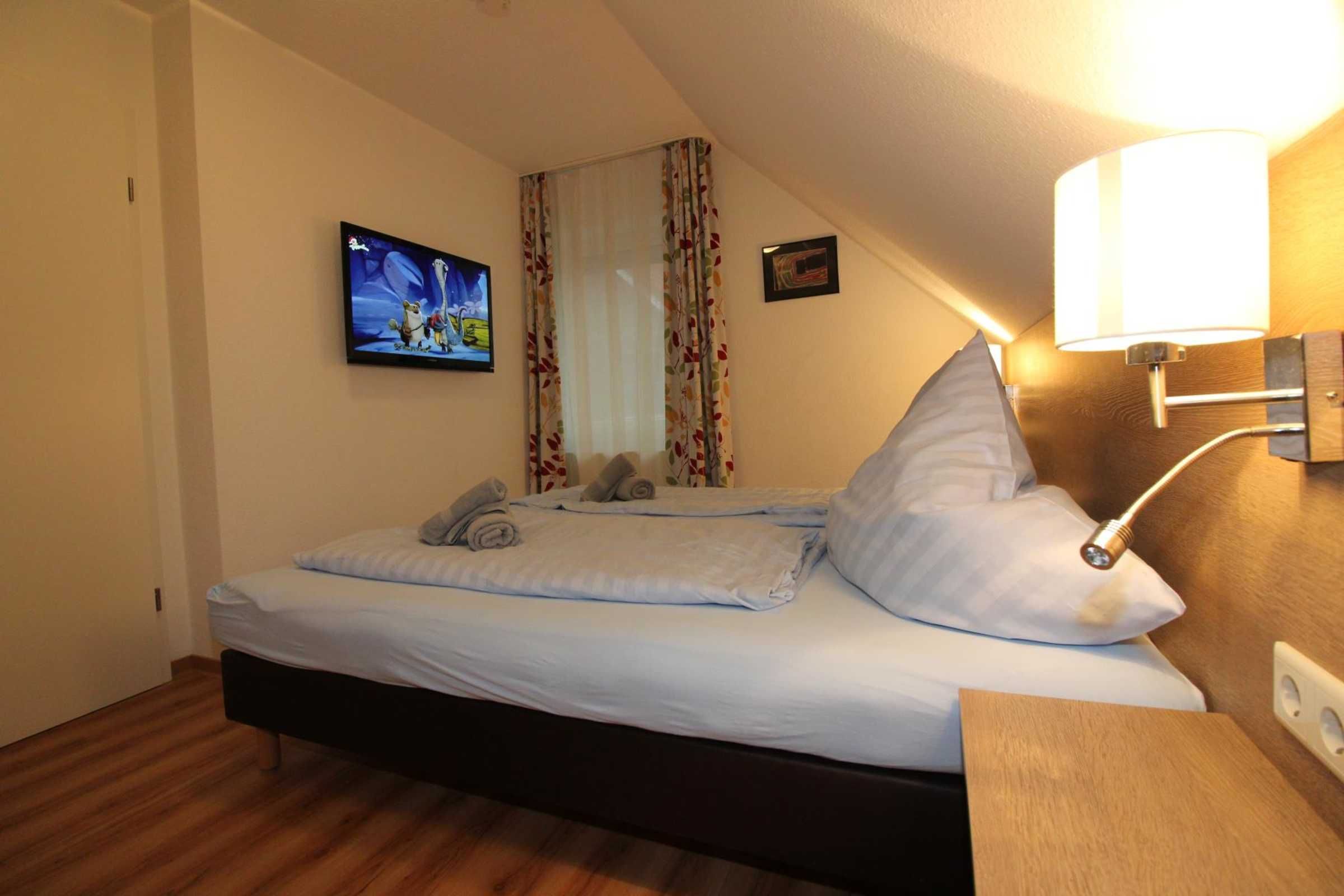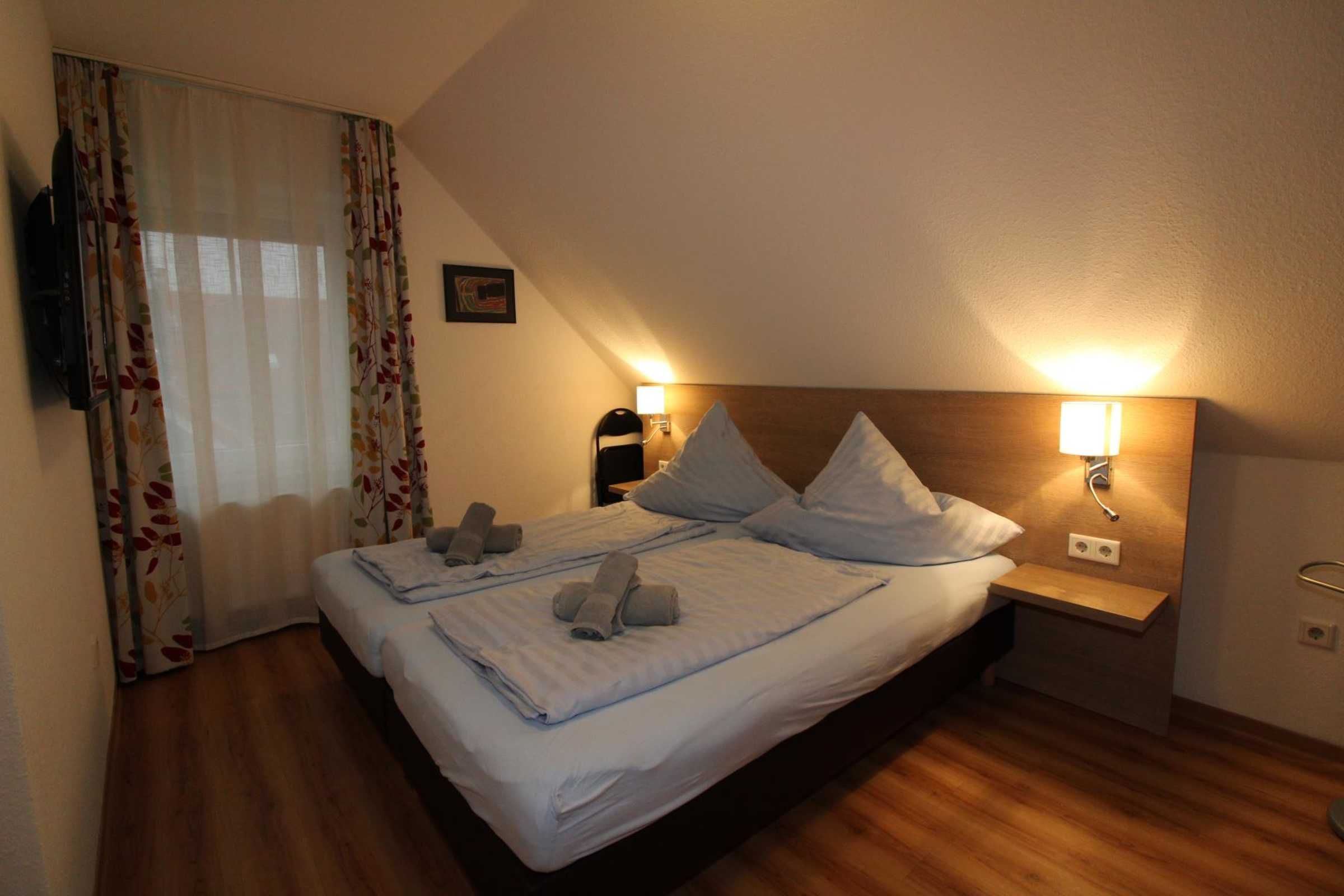 ein Schlafraum mit zwei Einzelbetten (und Kabel-LED-Fernseher)