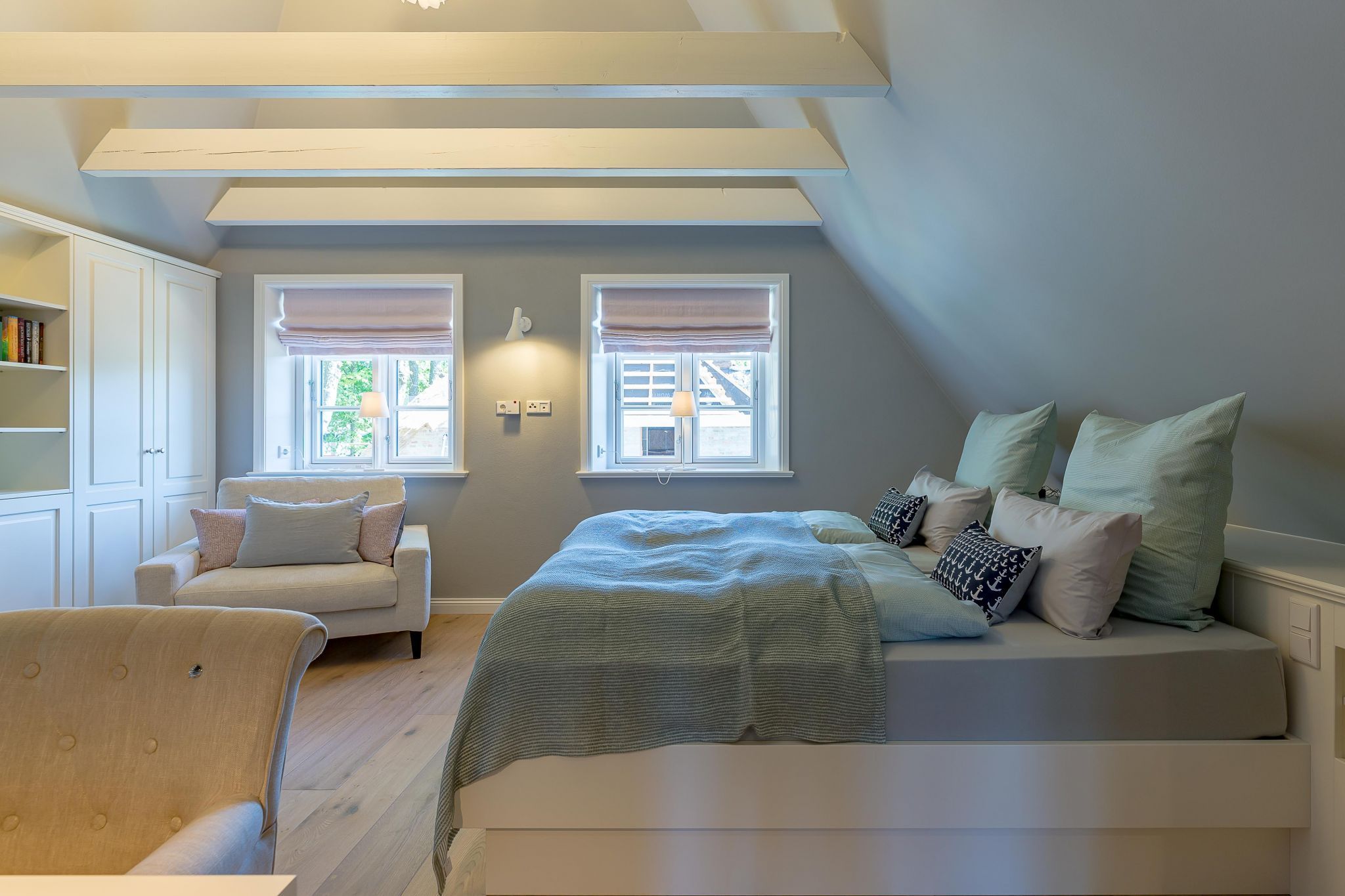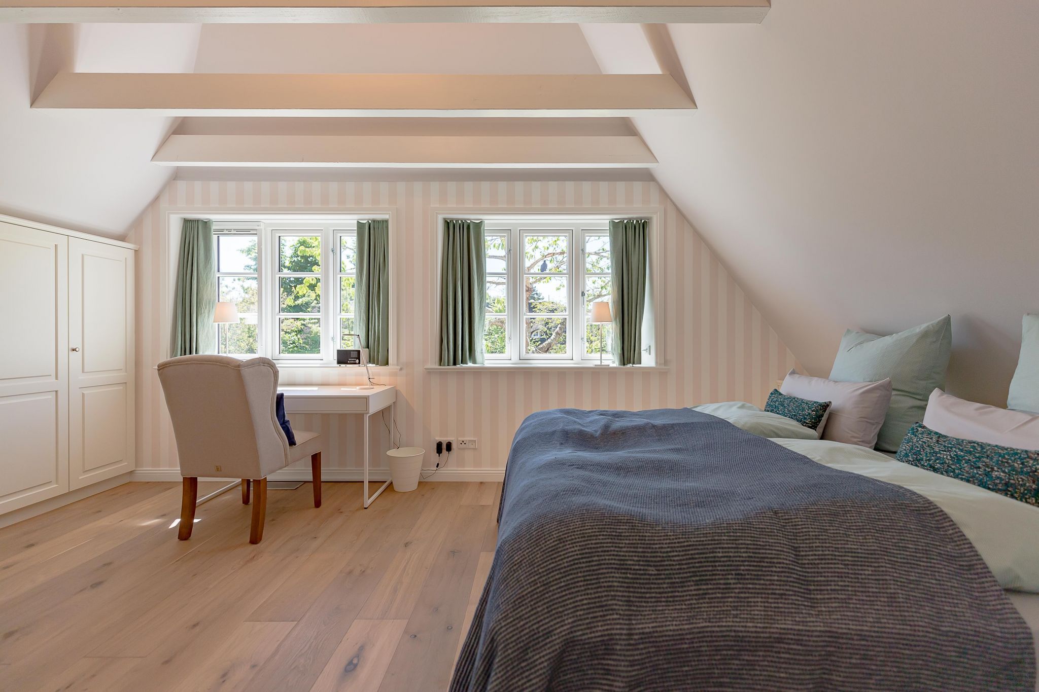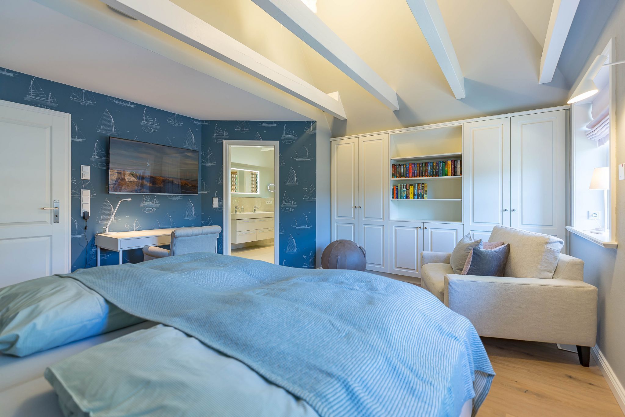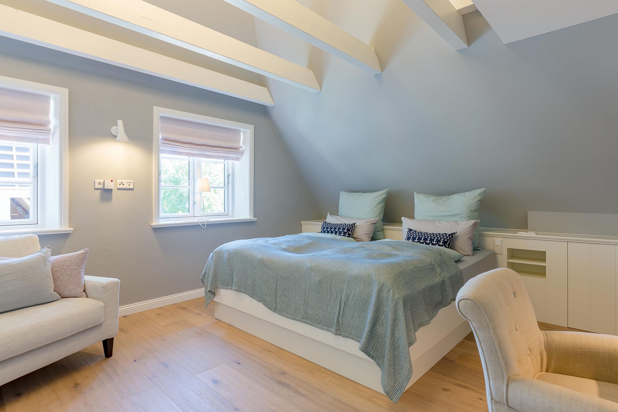 Im Obergeschoss finden Sie zwei weitere großzügige Schlafräume mit offener Kehlbalkendecke und jeweiligem en Suite Bad. Beide Schlafräume sind ebenfalls jeweils mit einem TV und auch einem Schreibtisch ausgestattet. Ein Arbeitszimmer mit Alkoven ist einem Schlafzimmer vorgelagert. Die ebenfalls im Obergeschoss befindliche Sauna mit großer Walk-in Dusche und Kneippgarnitur macht Ihren Wellnesstag zum Erlebnis.