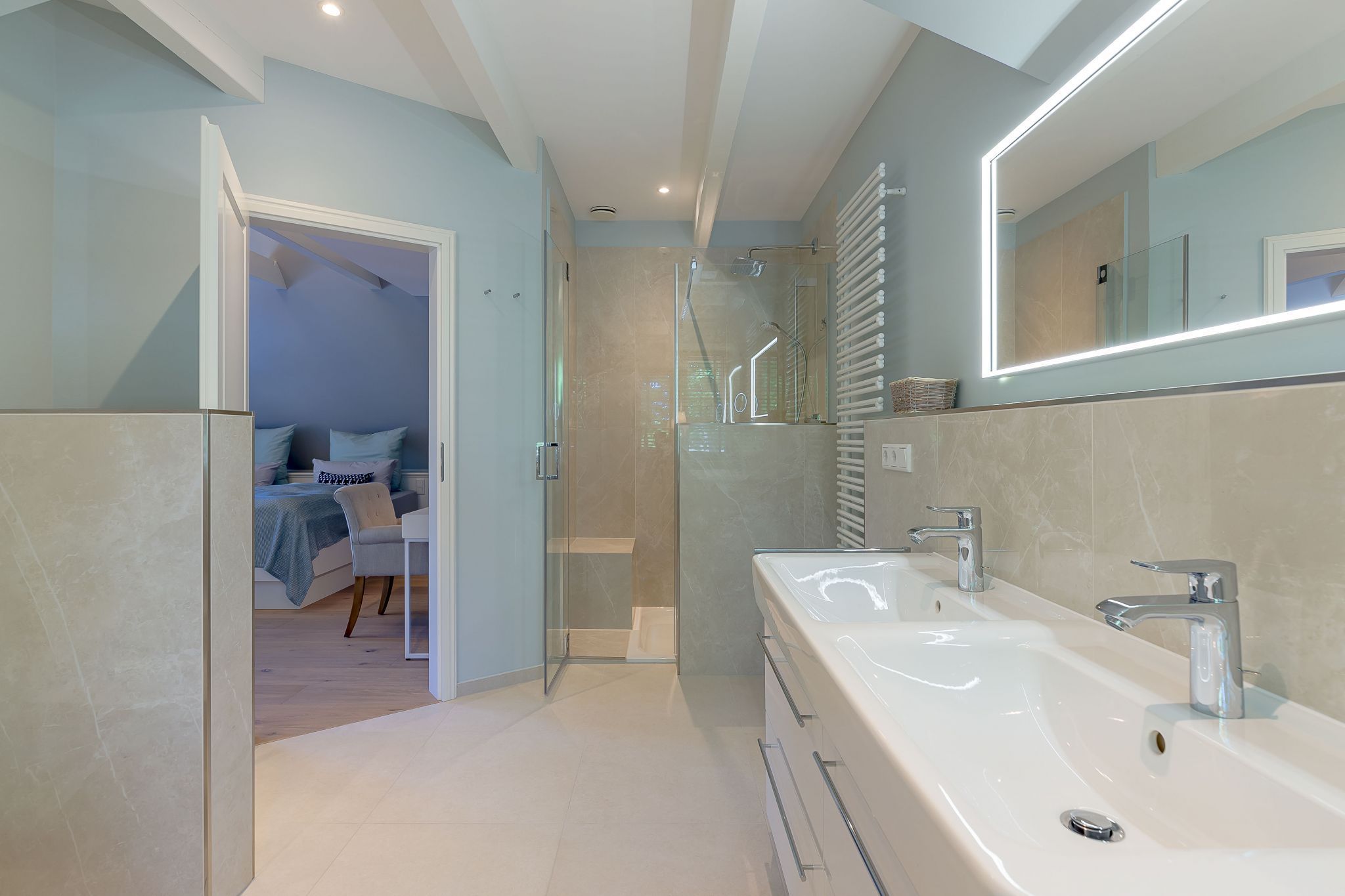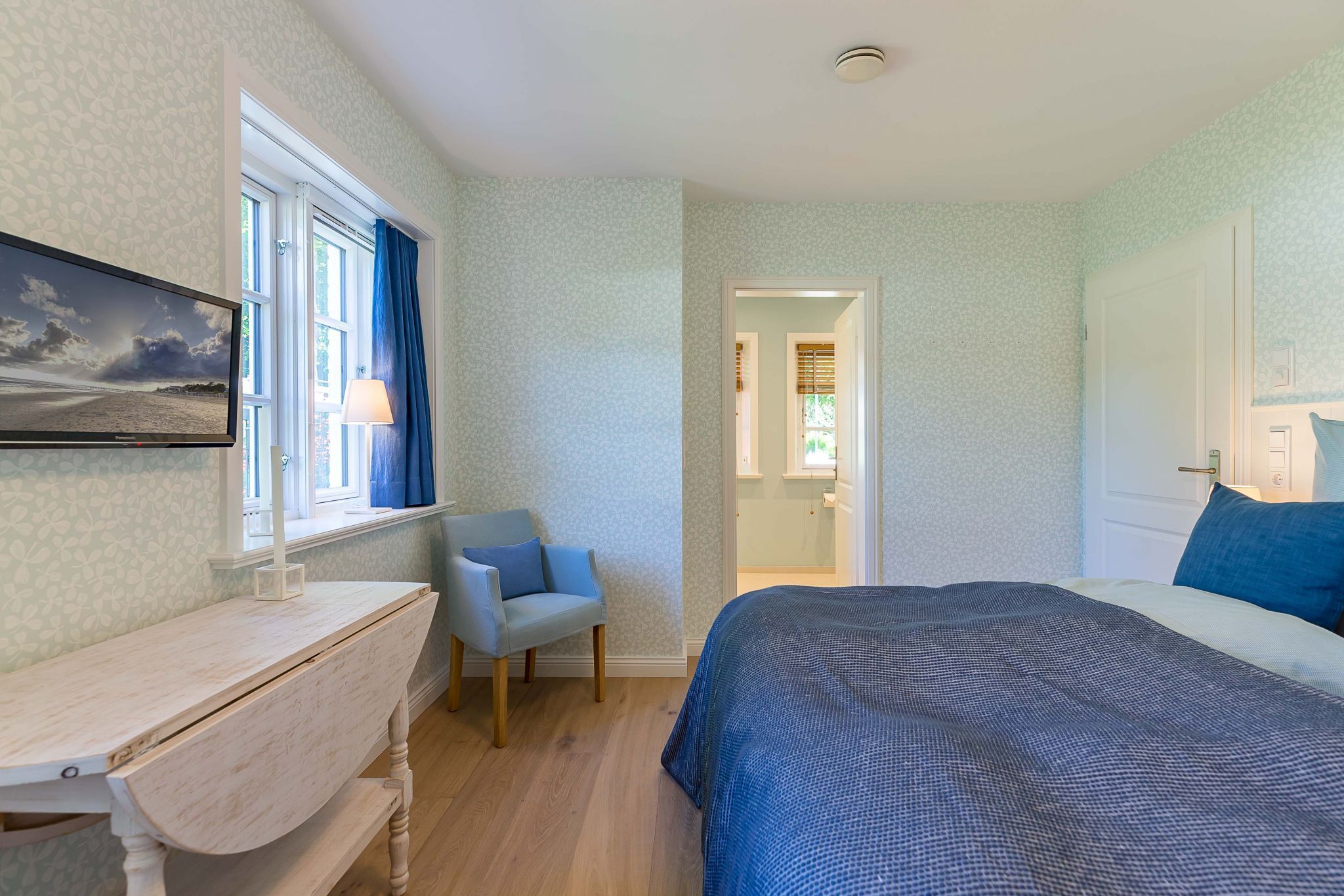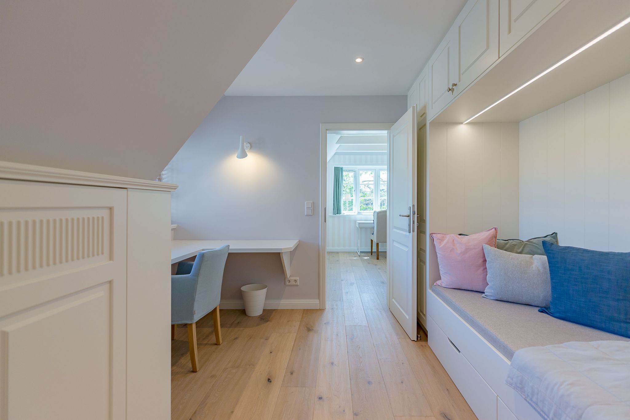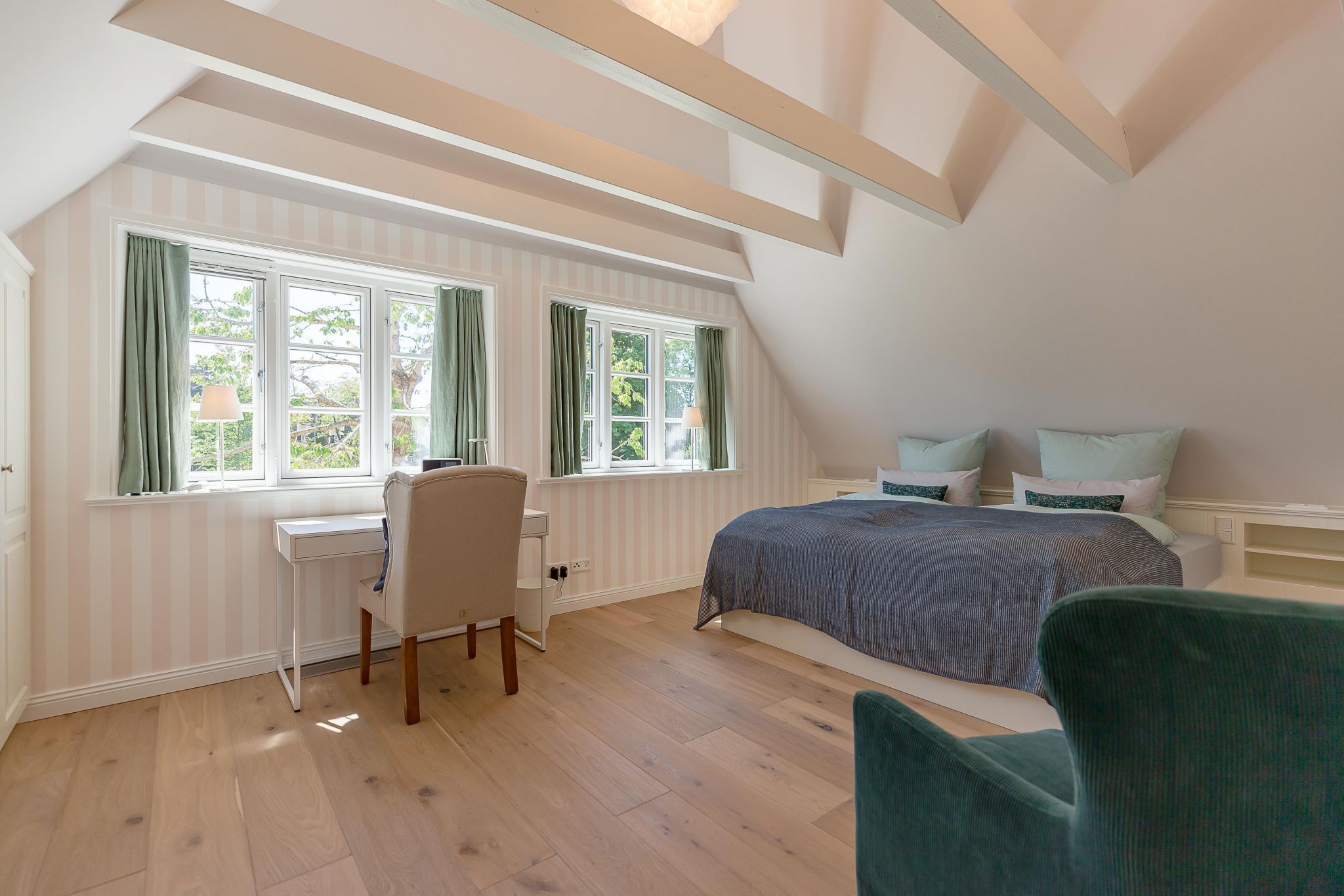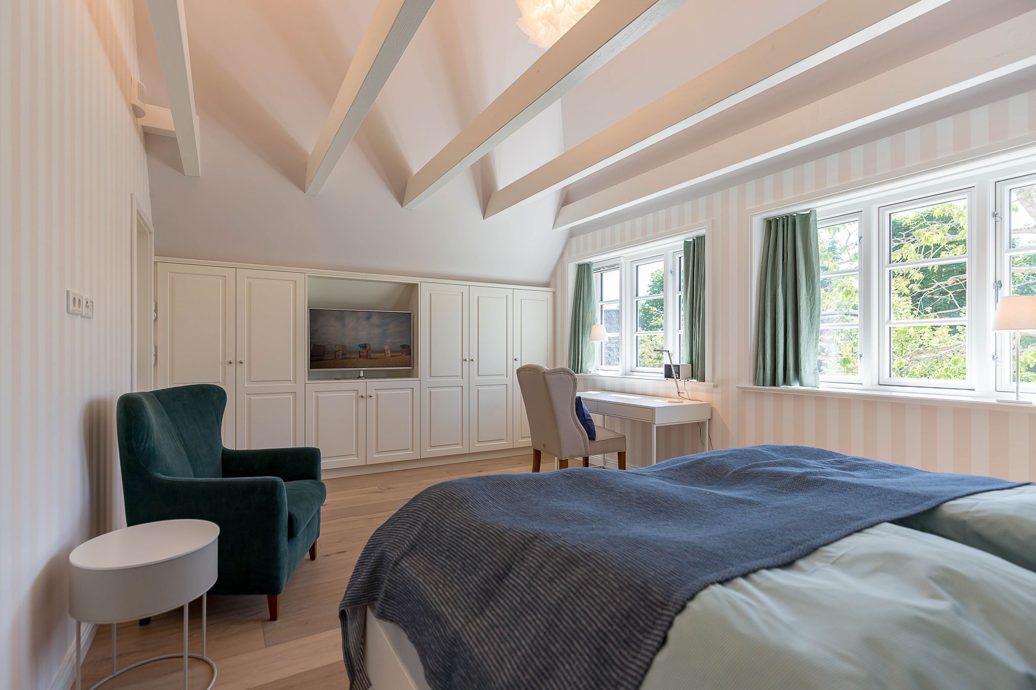 Im Obergeschoss finden Sie zwei weitere großzügige Schlafräume mit offener Kehlbalkendecke und jeweiligem en Suite Bad. Beide Schlafräume sind ebenfalls jeweils mit einem TV und auch einem Schreibtisch ausgestattet. Ein Arbeitszimmer mit Alkoven ist einem Schlafzimmer vorgelagert. Die ebenfalls im Obergeschoss befindliche Sauna mit großer Walk-in Dusche und Kneippgarnitur macht Ihren Wellnesstag zum Erlebnis.