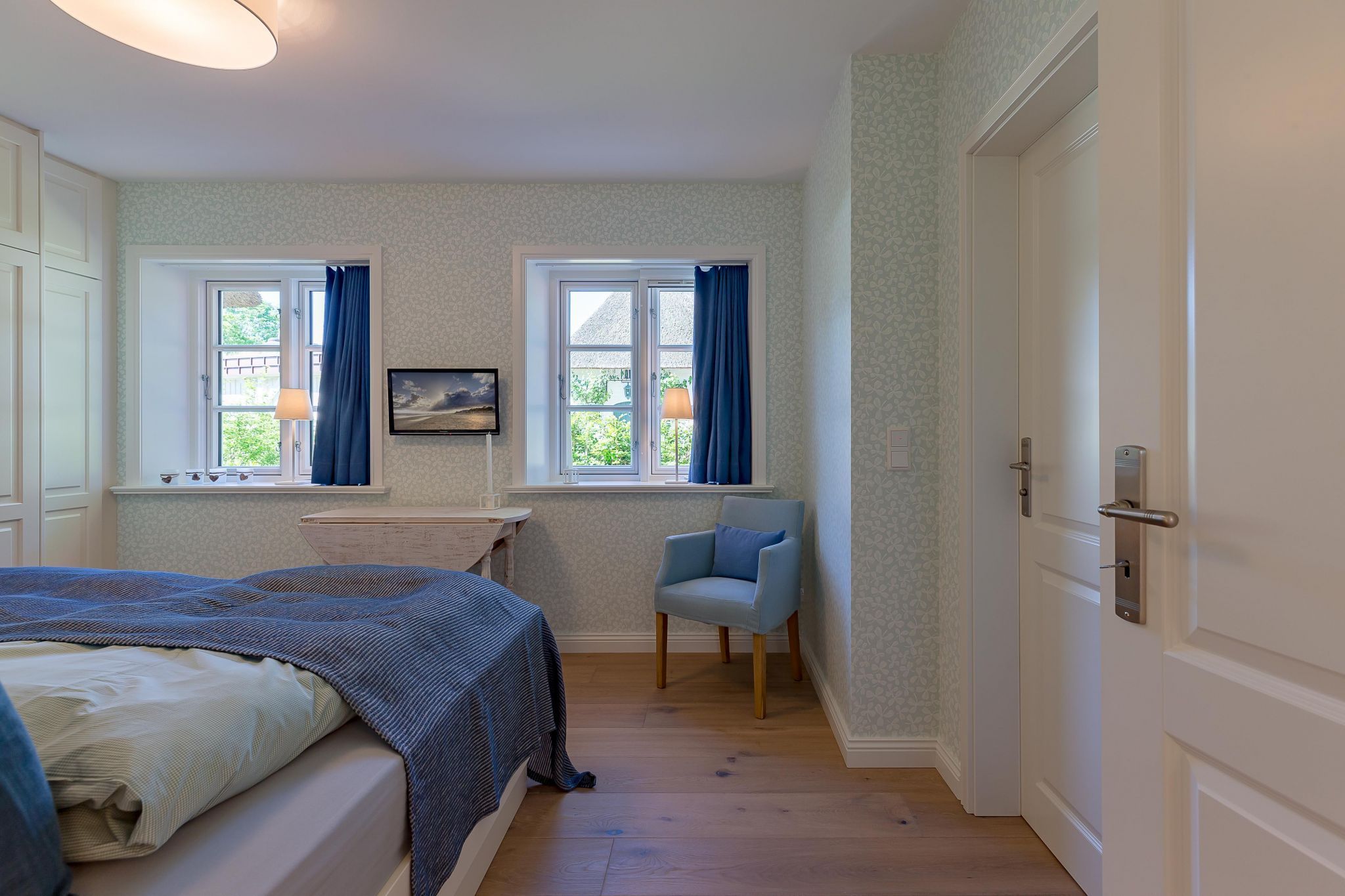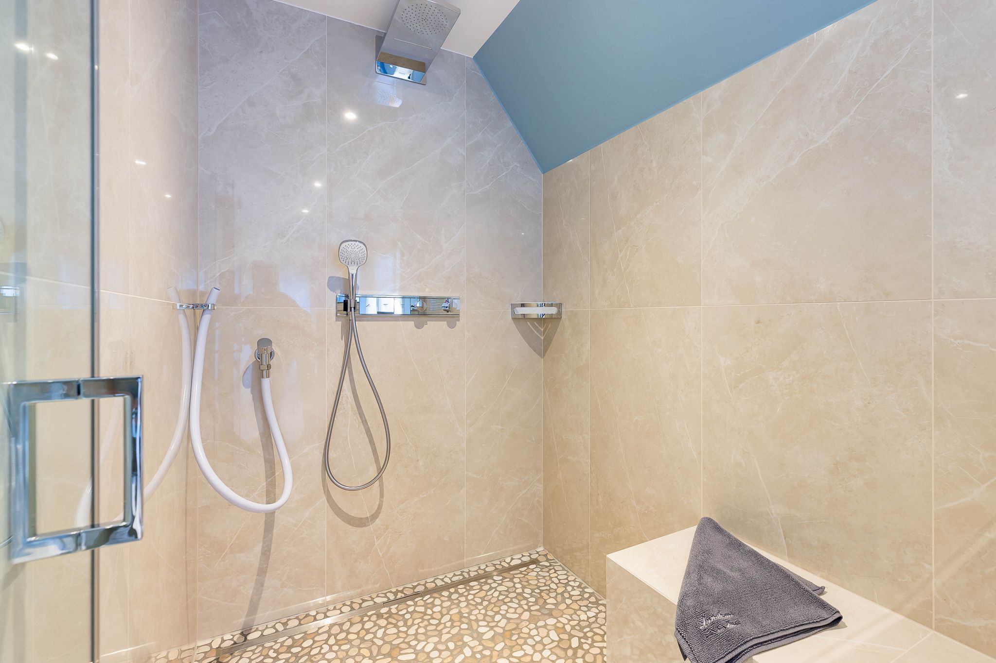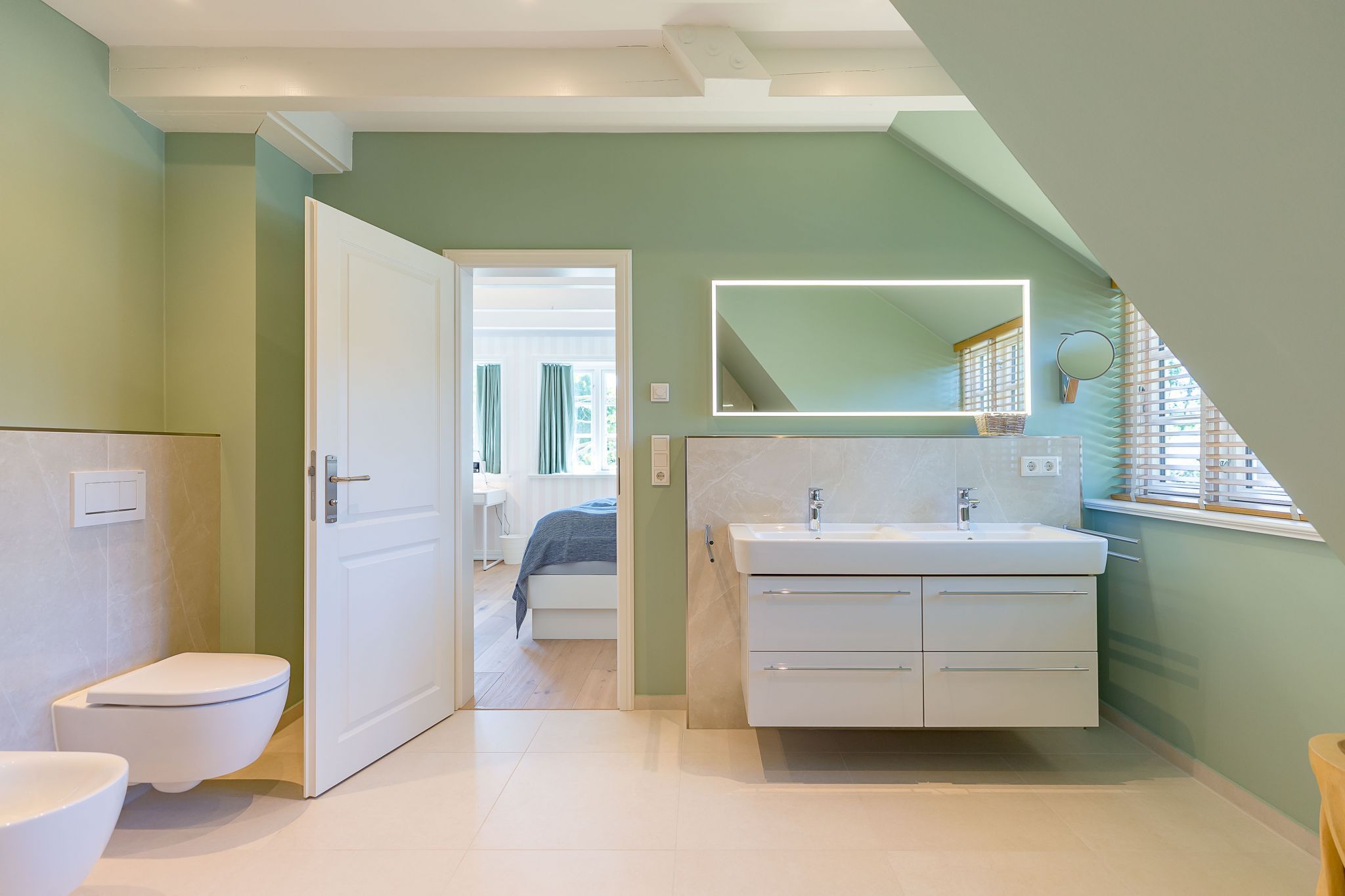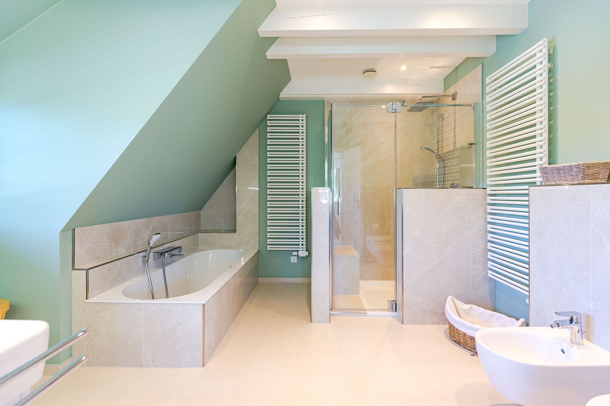 Im Obergeschoss finden Sie zwei weitere großzügige Schlafräume mit offener Kehlbalkendecke und jeweiligem en Suite Bad. Beide Schlafräume sind ebenfalls jeweils mit einem TV und auch einem Schreibtisch ausgestattet. Ein Arbeitszimmer mit Alkoven ist einem Schlafzimmer vorgelagert. Die ebenfalls im Obergeschoss befindliche Sauna mit großer Walk-in Dusche und Kneippgarnitur macht Ihren Wellnesstag zum Erlebnis.