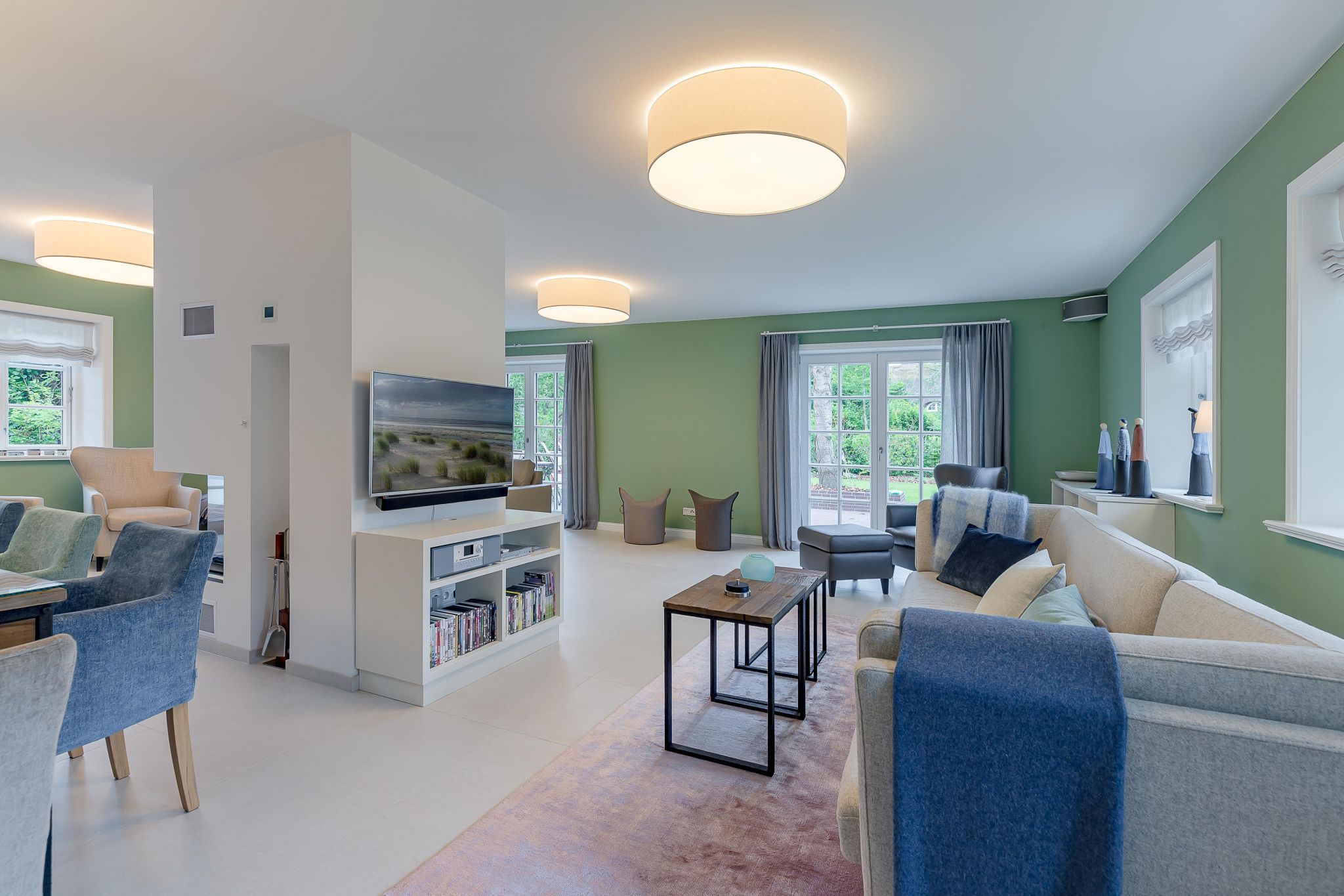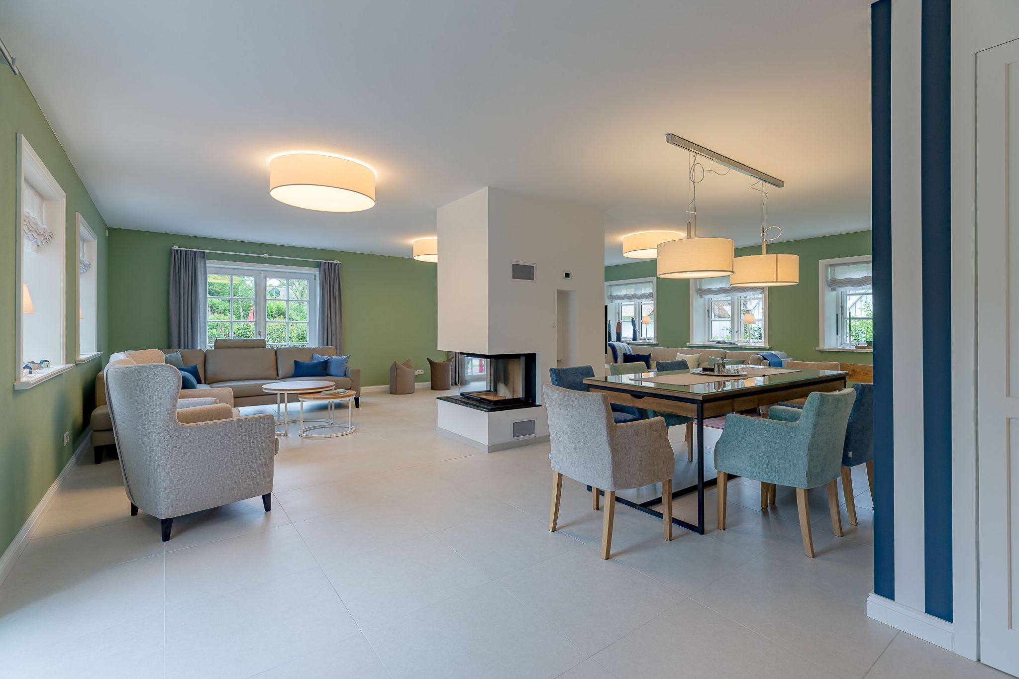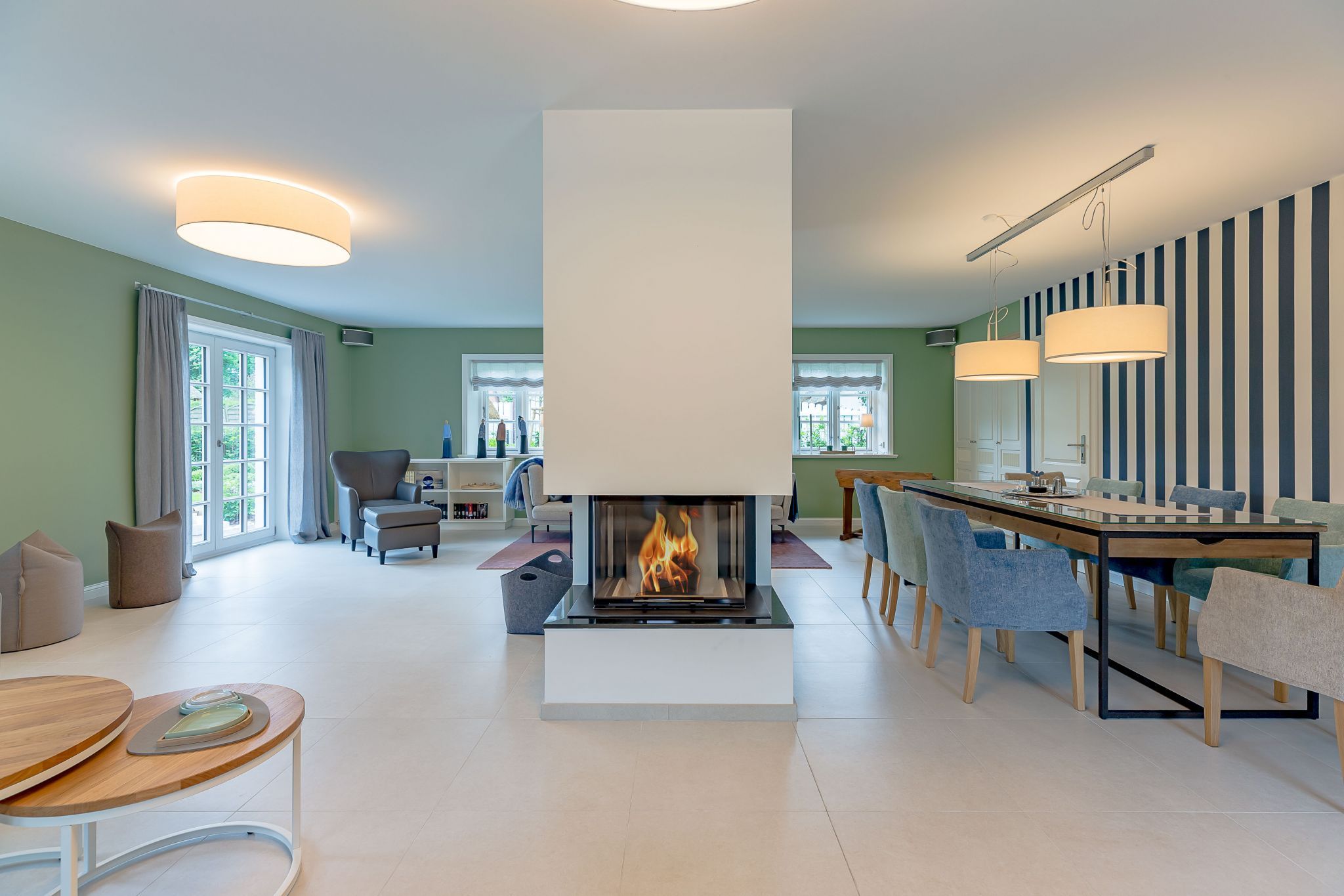 Auch im Haus wurde an alles gedacht, was den Aufenthalt angenehm und zum Erlebnis macht. Schon beim Betreten wirkt es beruhigend und einladend. Im Erdgeschoss befinden sich nicht nur ein Gäste-WC und ein Hauswirtschaftsraum mit Waschmaschine und Trockner, sondern auch ein Schlafzimmer mit en Suite Bad, das keine Wünsche offen lässt. Die große, offene Wohnraumküche mit gemütlicher Übereckbank und Kochinsel bietet genügend Möglichkeiten, seiner Kreativität beim gemeinsamen Kochen freien Raum zu lassen. Sie ist mit den modernsten Küchenutensilien voll ausgestattet und hält ein Kochfeld mit Bora Abzugssystem bereit. Der dreiseitig offene Kamin bildet das Herzstück des Wohnzimmers. Hier kann man gemütlich mit seinen Liebsten an einem großen Esstisch speisen oder aber auf einem großen Überecksofa mit zwei Sesseln das Kaminfeuer genießen. Ein Fernseher mit Soundanlage sowie eine Musikanlage runden das Angebot ab. Das lange und gemütliche Fernsehsofa lädt zu unterhaltsamen oder aber spannenden Abenden ein. Auch bei sportlichen Großereignissen finden hier alle ihren Platz.