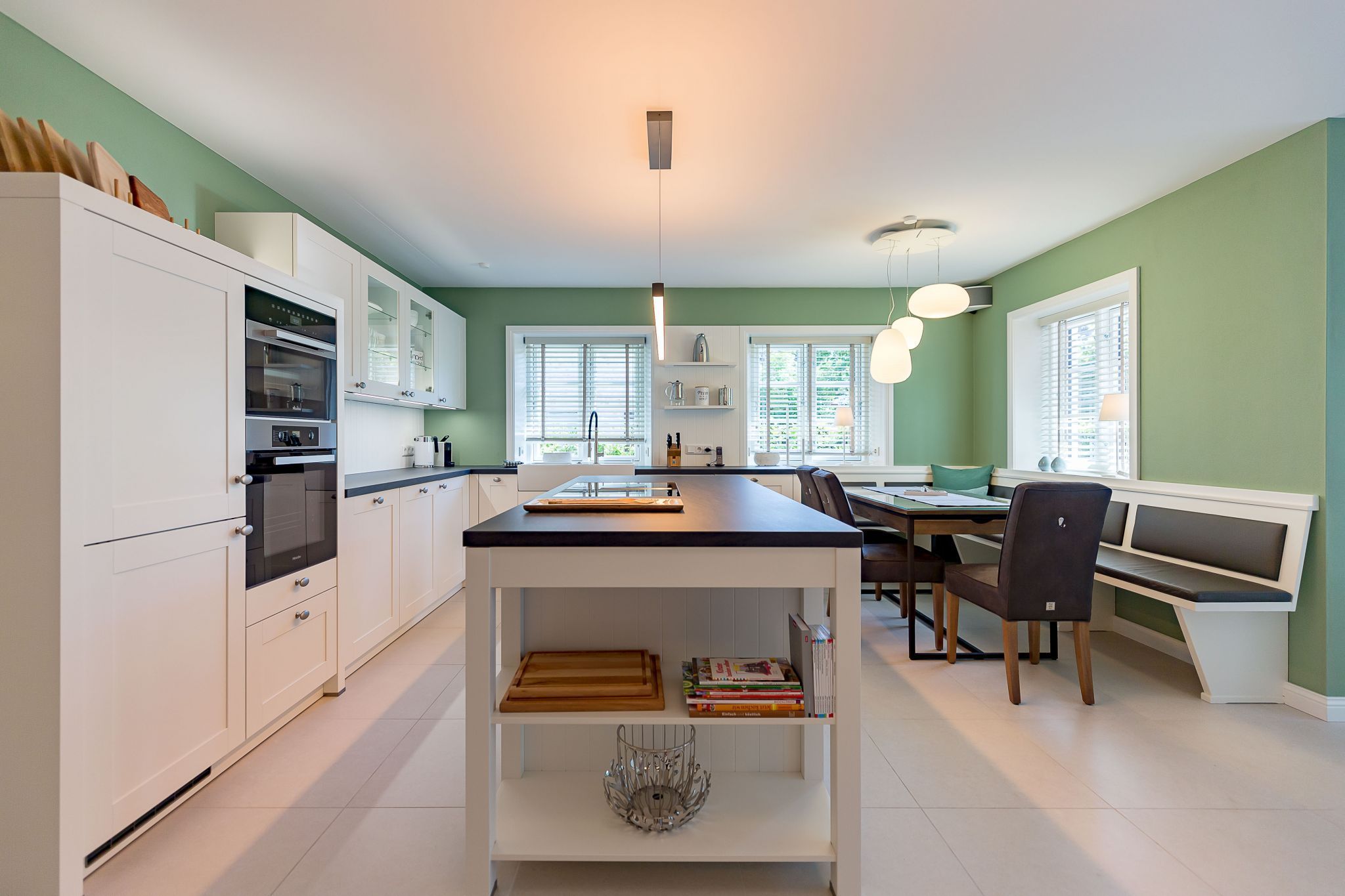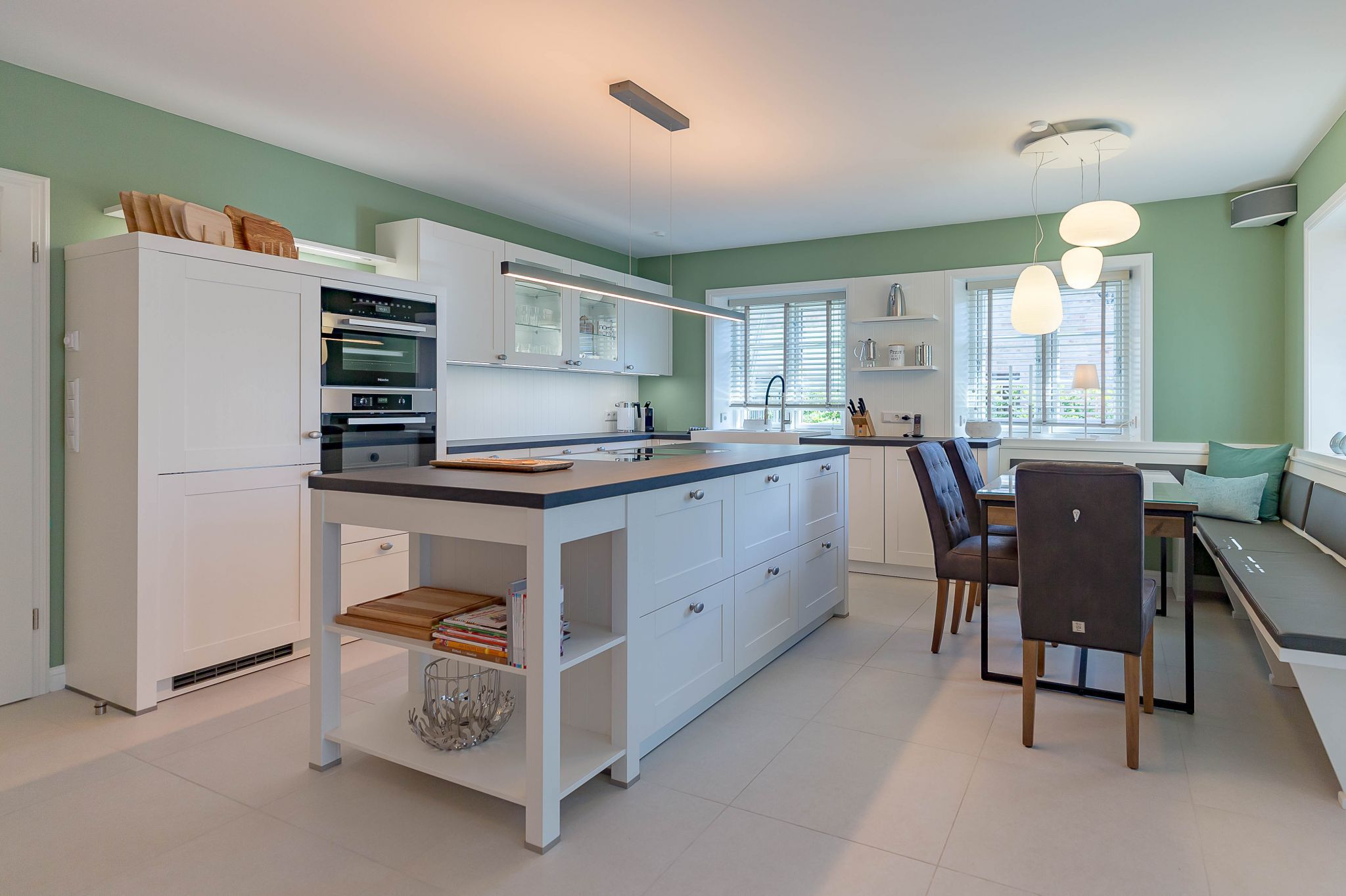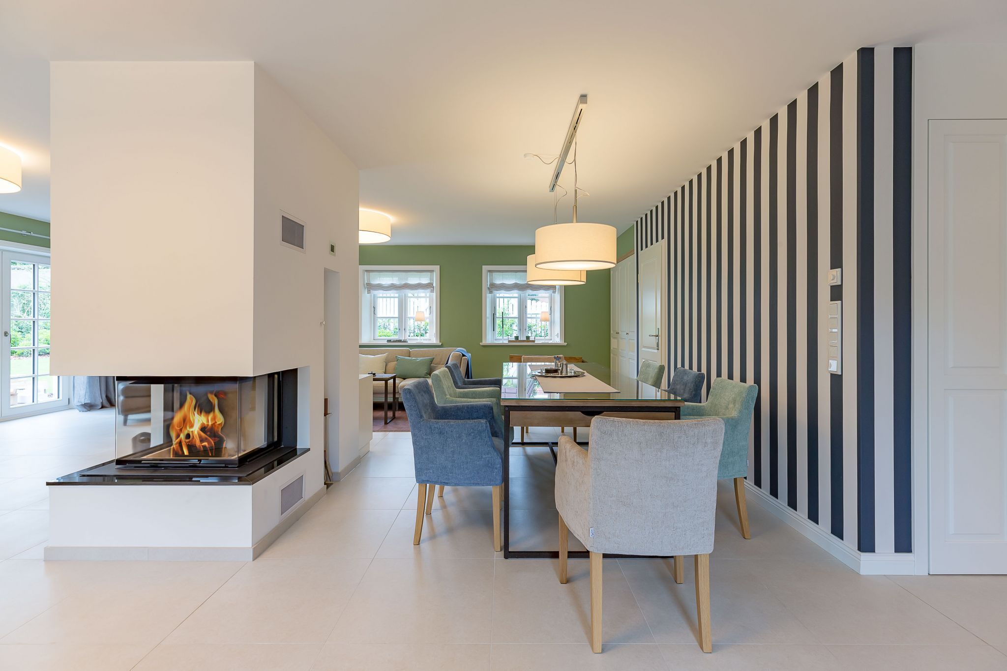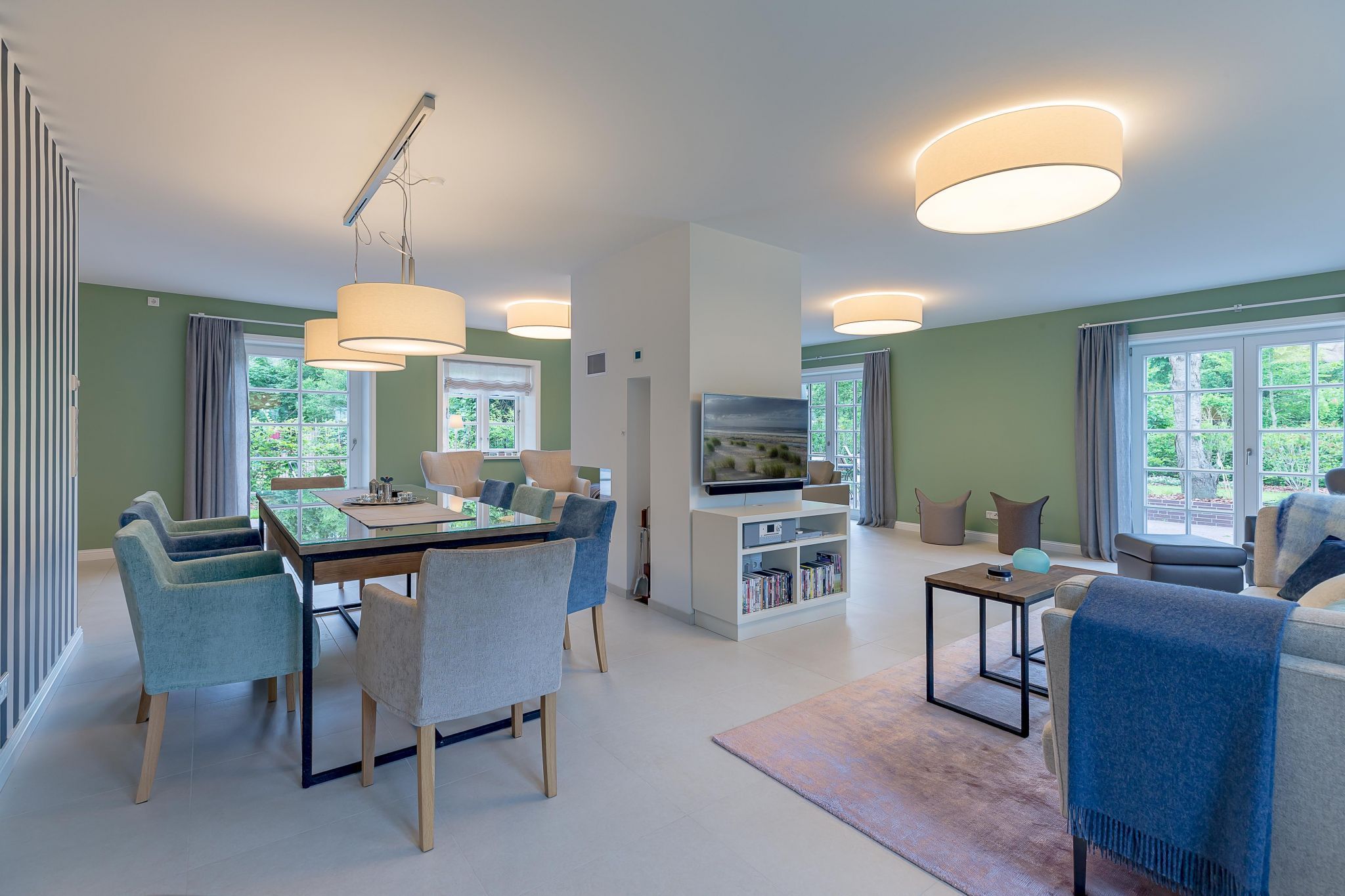 Auch im Haus wurde an alles gedacht, was den Aufenthalt angenehm und zum Erlebnis macht. Schon beim Betreten wirkt es beruhigend und einladend. Im Erdgeschoss befinden sich nicht nur ein Gäste-WC und ein Hauswirtschaftsraum mit Waschmaschine und Trockner, sondern auch ein Schlafzimmer mit en Suite Bad, das keine Wünsche offen lässt. Die große, offene Wohnraumküche mit gemütlicher Übereckbank und Kochinsel bietet genügend Möglichkeiten, seiner Kreativität beim gemeinsamen Kochen freien Raum zu lassen. Sie ist mit den modernsten Küchenutensilien voll ausgestattet und hält ein Kochfeld mit Bora Abzugssystem bereit. Der dreiseitig offene Kamin bildet das Herzstück des Wohnzimmers. Hier kann man gemütlich mit seinen Liebsten an einem großen Esstisch speisen oder aber auf einem großen Überecksofa mit zwei Sesseln das Kaminfeuer genießen. Ein Fernseher mit Soundanlage sowie eine Musikanlage runden das Angebot ab. Das lange und gemütliche Fernsehsofa lädt zu unterhaltsamen oder aber spannenden Abenden ein. Auch bei sportlichen Großereignissen finden hier alle ihren Platz.