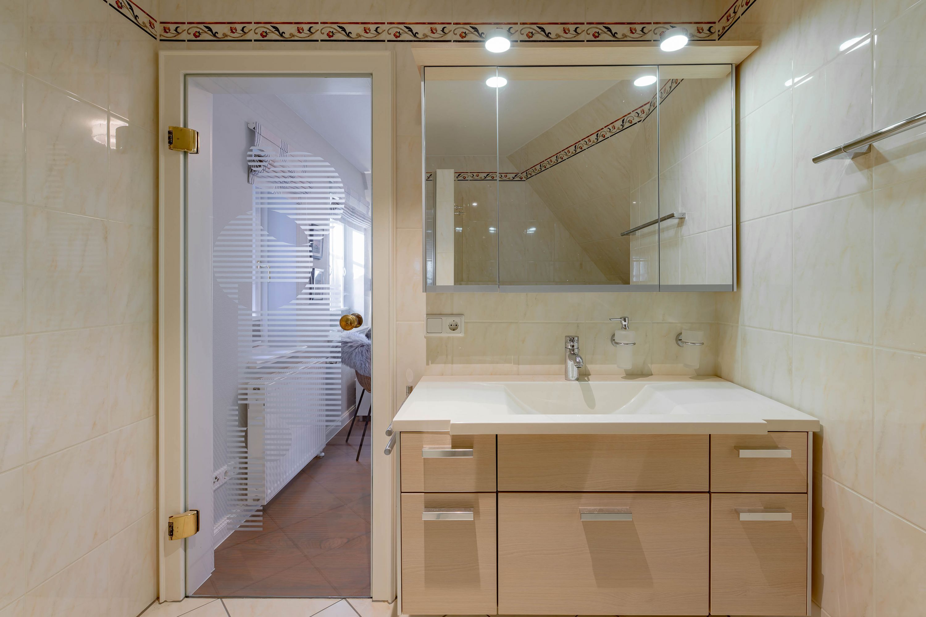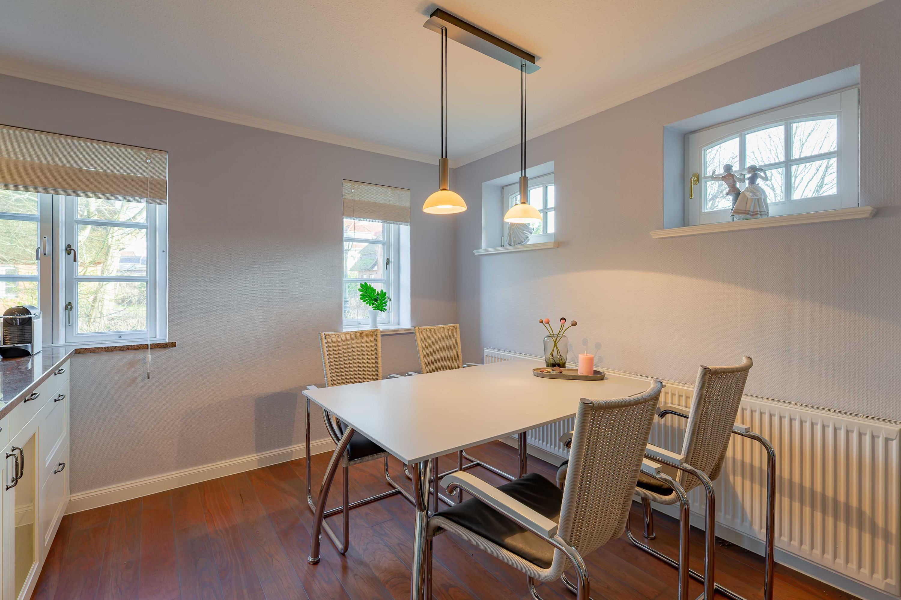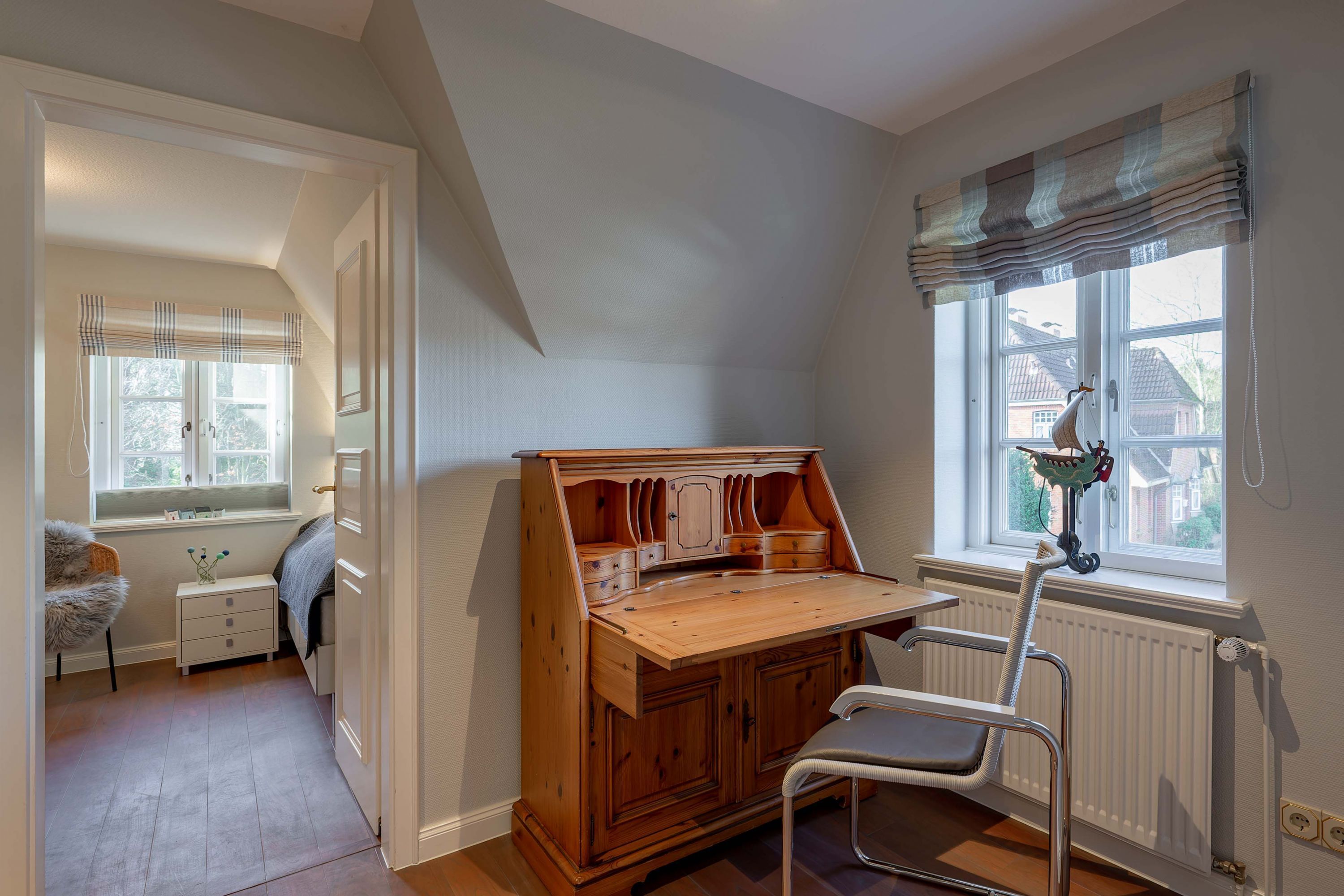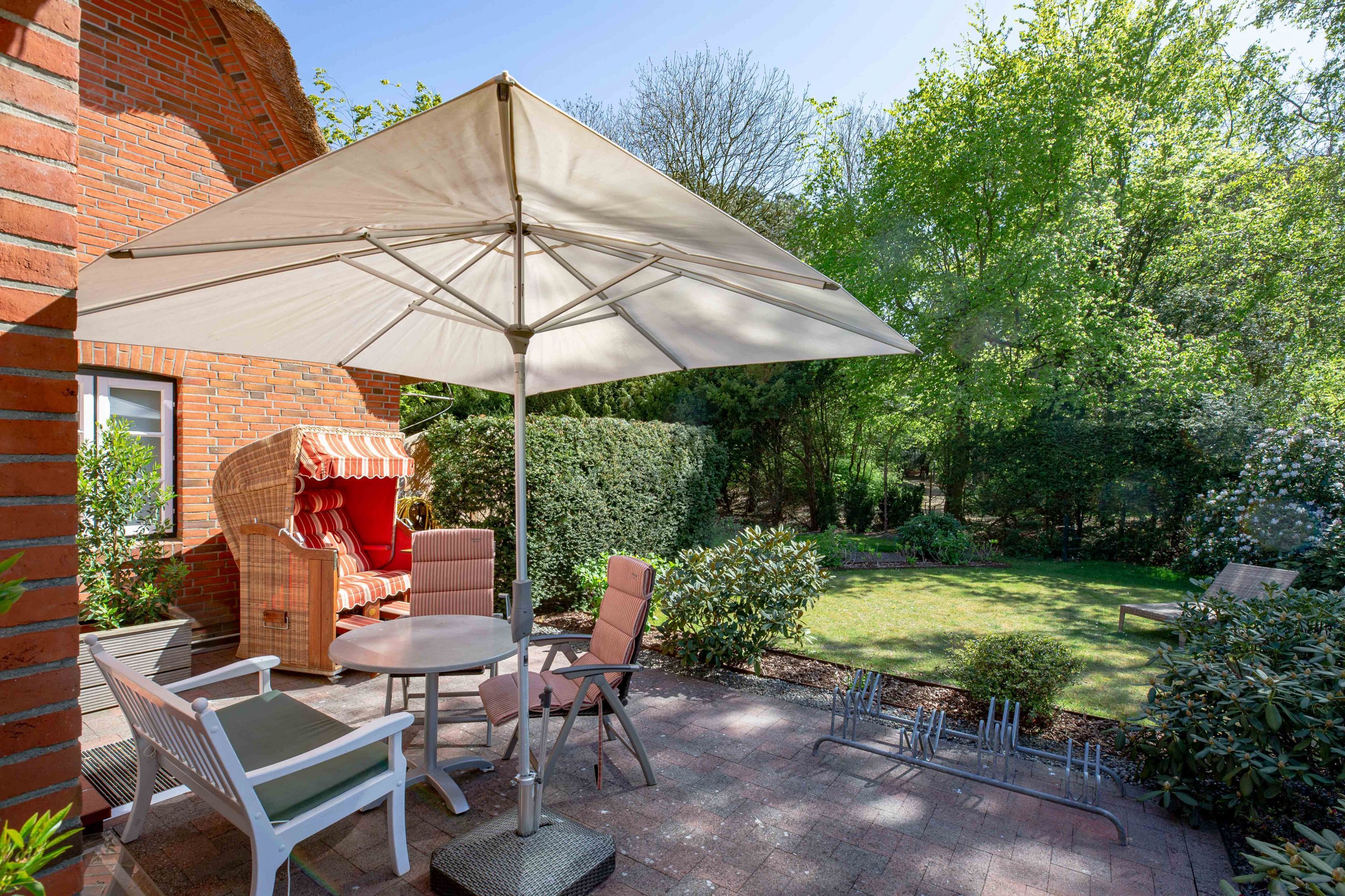 Wir begrüßen Sie im Haus Edda, unter dem Reetdach eines Drei-Parteien-Hauses im friesischen Baustil. Im Haus Edda stehen Ihnen 90 qm sowie ein separater Eingang zur Verfügung. Der kleine feine Garten grenzt direkt an den alten Kurpark in Wyk. Wenn Sie diesen durchqueren, gelangen Sie in wenigen Minuten zur Strandpromenade und haben von dort den freien Blick auf die Nordsee und die Halligen. Genießen Sie die Sonnenstunden im Strandkorb auf der Terrasse. Ein weiterer Strandkorb steht am Strand für Sie bereit. Für gemütliche Abende im Haus sorgt der schöne Mylin-Kachelofen an windigen und kühlen Herbst- und Winterabenden genau das Richtige, um zu entspannen. Die perfekt ausgestattete Küche mit großer Kochinsel macht Lust auf gemeinsames Kochen. Es schließt sich der Essbereich an, der in den Wohnraum mit Leseecke übergeht. Ein Gäste-WC komplettiert das Erdgeschoss. Die beiden Schlafräume mit jeweils einem angrenzenden Bad befinden sich im Obergeschoss.