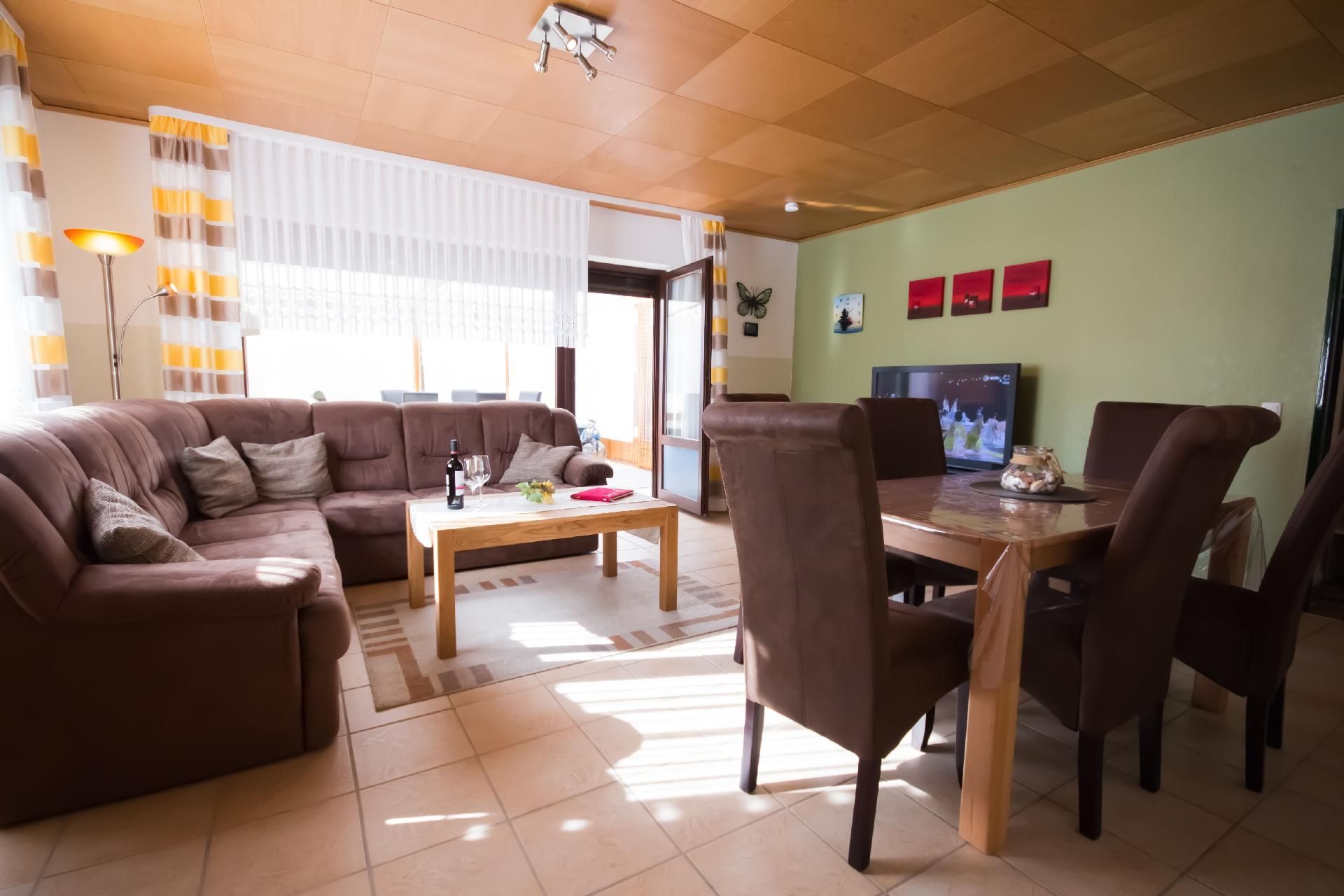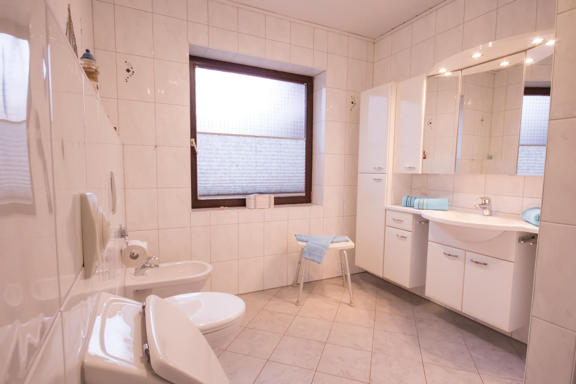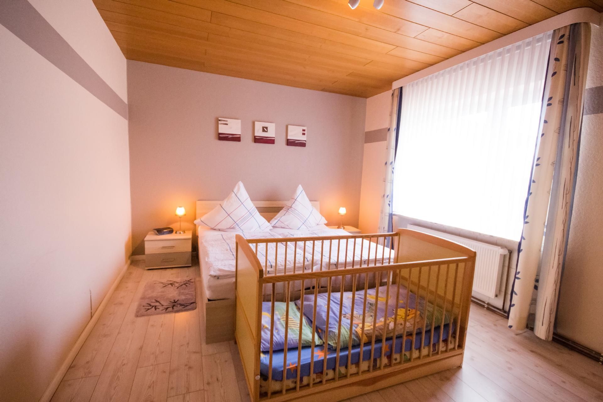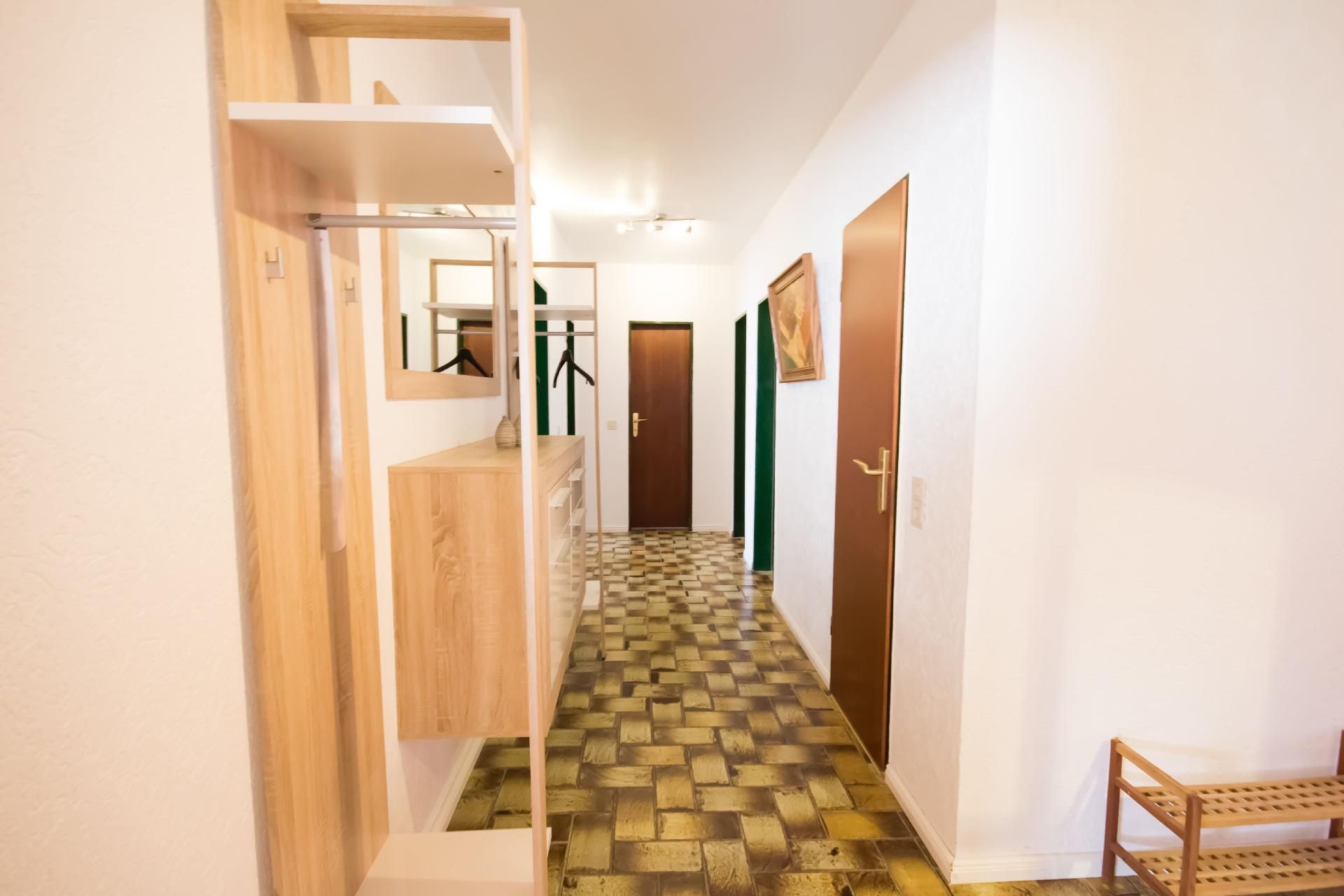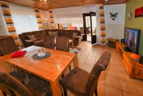 Die 4-Zimmer-Wohnung verfügt über eine Wohnfläche von ca. 125 m². Die freundlich und gemütlich eingerichtete Ferienunterkunft erstreckt sich über das gesamte Erdgeschoss. Der moderne Wohn- und Essbereich bietet eine Eckcouch mit Hocker und Couchtisch, eine Stehlampe sowie ein Sideboard mit 50-Zoll-Flachbildfernseher. Zudem steht ein Esstisch mit sechs Stühlen bereit. Die voll ausgestattete Küche verfügt neben der oben genannten Ausstattung zusätzlich über einen Backofen und eine Spülmaschine. Auch ein weiterer Essbereich für zwei Personen ist vorhanden. Ein Kinderhochstuhl wird bei Bedarf kostenfrei zur Verfügung gestellt. Das erste Schlafzimmer ist mit zwei Einzelbetten (je 0,90 x 2,00 m) ausgestattet. Ein CD-Radiorekorder, ein 23-Zoll-Fernseher und ein Hocker runden die Ausstattung dieses Schlafbereichs ab. Im zweiten Schlafzimmer erwarten Sie ein Doppelbett (1,80 x 2,00 m) sowie ein optionales Kinderbett (0,70 x 1,40 m) zur kostenfreien Nutzung, dazu ein Radiowecker und ein Hocker. Das dritte Schlafzimmer verfügt ebenfalls über ein Doppelbett (1,80 x 2,00 m) mit beigestelltem Hocker. Im Vergleich zu den anderen Wohnungen bietet dieses Badezimmer zusätzlich eine Fußbodenheizung, einen Handtuchheizkörper sowie Urinal, Bidet und Duschhocker. Das separate Gäste-WC ist mit Waschbecken, Toilette und Spiegel ausgestattet. Im Abstellraum befindet sich eine Waschmaschine zur kostenfreien alleinigen Nutzung, daneben Wäscheständer, Bügelbrett, Bügeleisen und Staubsauger. Eine Garderobe, einen Garderobenschrank und einen Spiegel finden Sie im Flurbereich. Wir haben für Sie Kostenfreies W-Lan für Ausfälle und Störungen übernehmen wir keine Haftung.