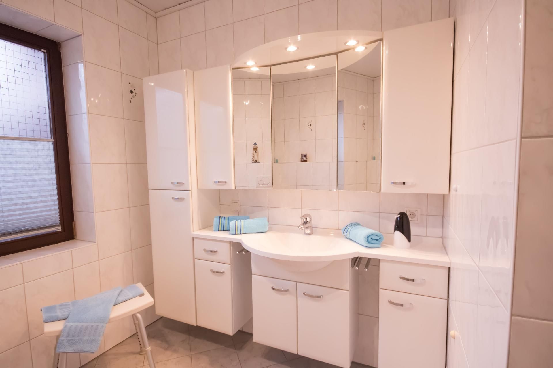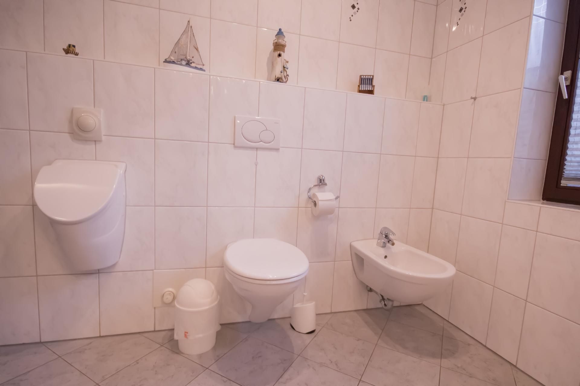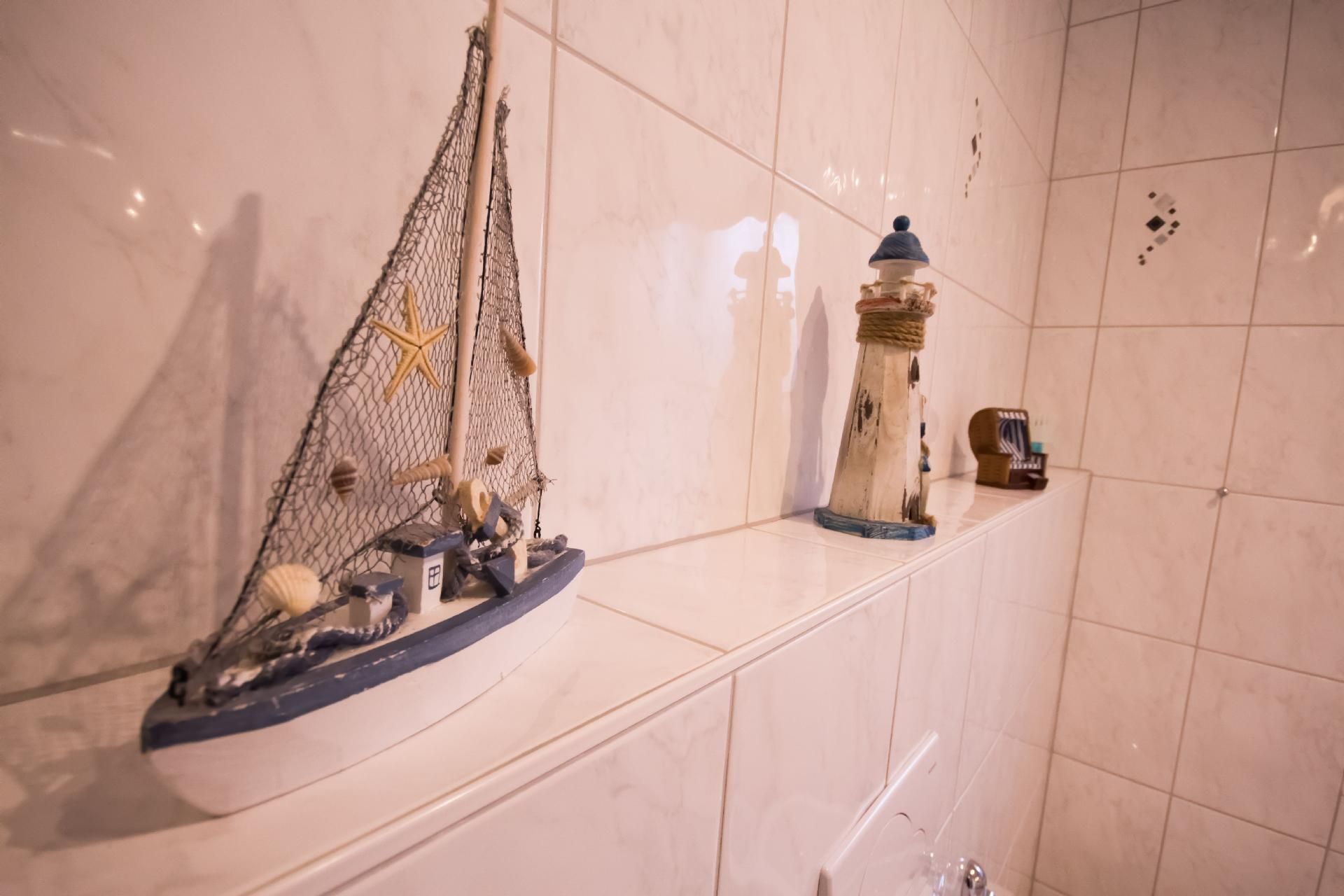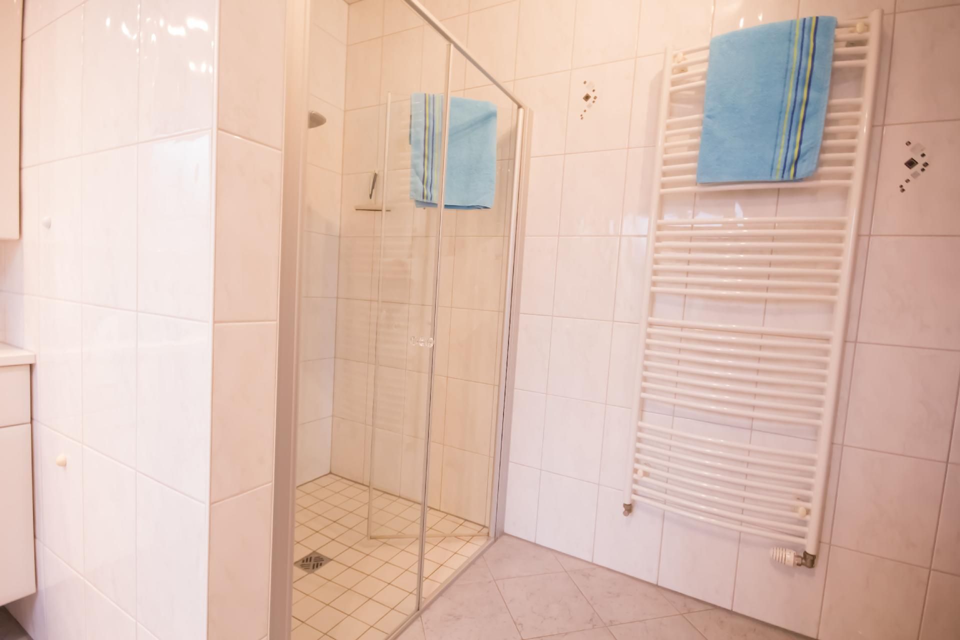 Die 4-Zimmer-Wohnung verfügt über eine Wohnfläche von ca. 125 m². Die freundlich und gemütlich eingerichtete Ferienunterkunft erstreckt sich über das gesamte Erdgeschoss. Der moderne Wohn- und Essbereich bietet eine Eckcouch mit Hocker und Couchtisch, eine Stehlampe sowie ein Sideboard mit 50-Zoll-Flachbildfernseher. Zudem steht ein Esstisch mit sechs Stühlen bereit. Die voll ausgestattete Küche verfügt neben der oben genannten Ausstattung zusätzlich über einen Backofen und eine Spülmaschine. Auch ein weiterer Essbereich für zwei Personen ist vorhanden. Ein Kinderhochstuhl wird bei Bedarf kostenfrei zur Verfügung gestellt. Das erste Schlafzimmer ist mit zwei Einzelbetten (je 0,90 x 2,00 m) ausgestattet. Ein CD-Radiorekorder, ein 23-Zoll-Fernseher und ein Hocker runden die Ausstattung dieses Schlafbereichs ab. Im zweiten Schlafzimmer erwarten Sie ein Doppelbett (1,80 x 2,00 m) sowie ein optionales Kinderbett (0,70 x 1,40 m) zur kostenfreien Nutzung, dazu ein Radiowecker und ein Hocker. Das dritte Schlafzimmer verfügt ebenfalls über ein Doppelbett (1,80 x 2,00 m) mit beigestelltem Hocker. Im Vergleich zu den anderen Wohnungen bietet dieses Badezimmer zusätzlich eine Fußbodenheizung, einen Handtuchheizkörper sowie Urinal, Bidet und Duschhocker. Das separate Gäste-WC ist mit Waschbecken, Toilette und Spiegel ausgestattet. Im Abstellraum befindet sich eine Waschmaschine zur kostenfreien alleinigen Nutzung, daneben Wäscheständer, Bügelbrett, Bügeleisen und Staubsauger. Eine Garderobe, einen Garderobenschrank und einen Spiegel finden Sie im Flurbereich. Wir haben für Sie Kostenfreies W-Lan für Ausfälle und Störungen übernehmen wir keine Haftung.