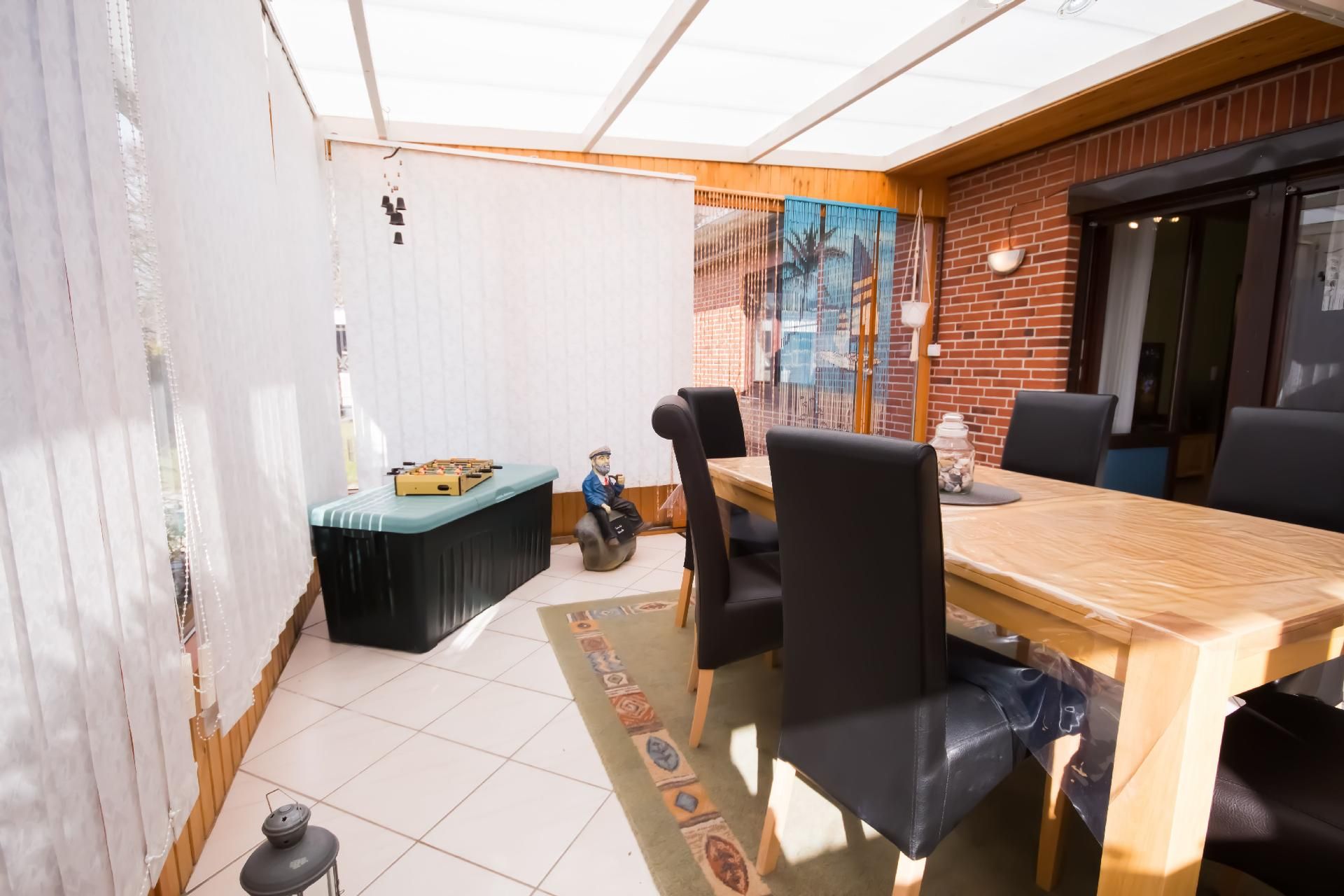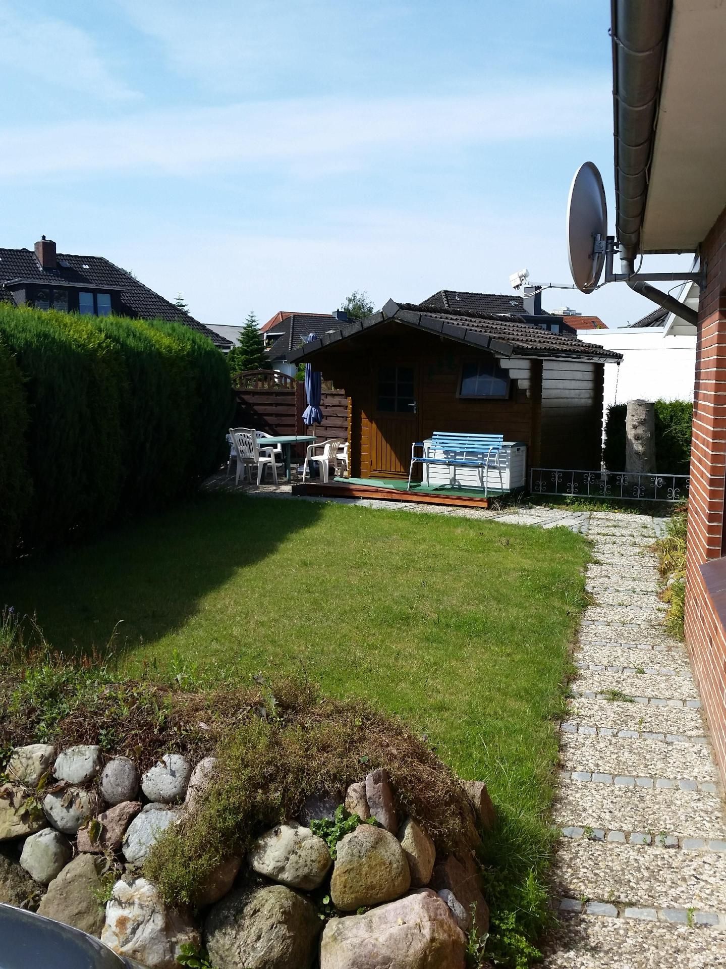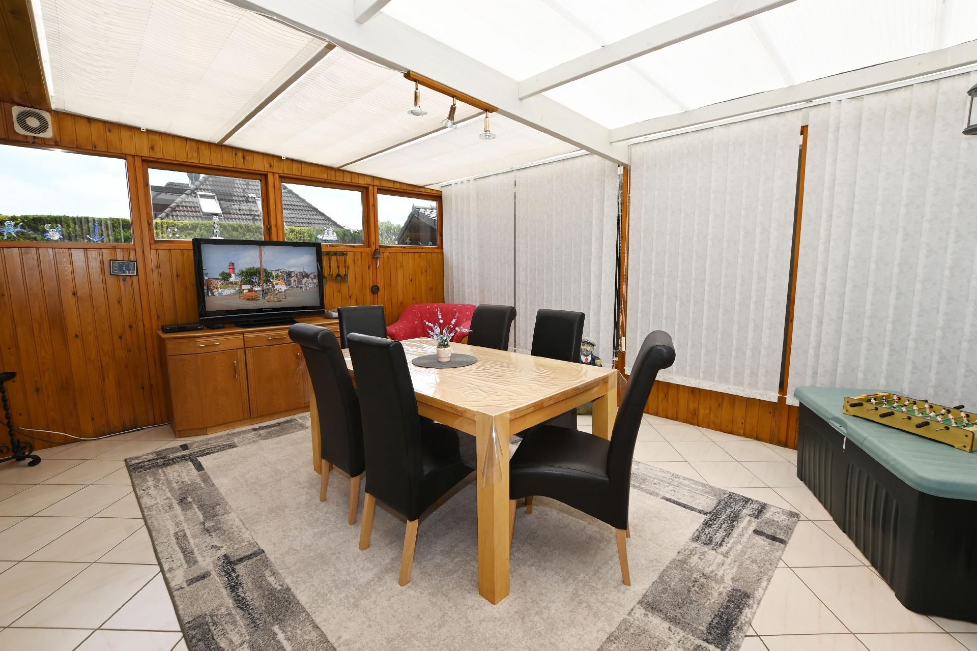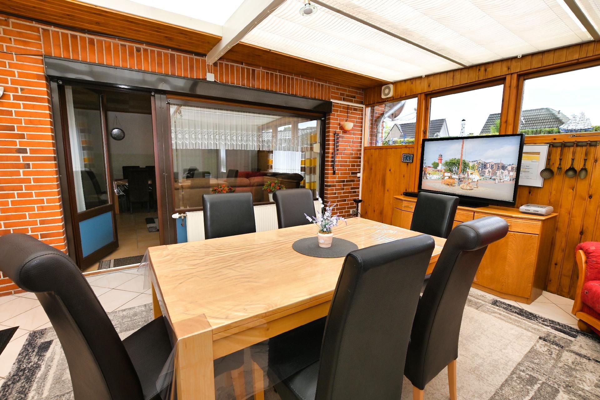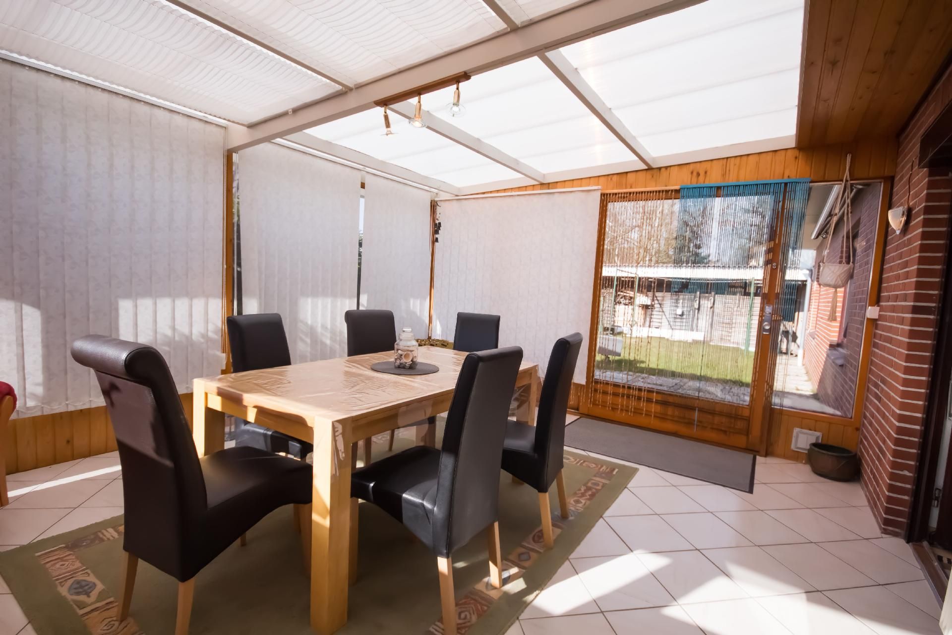 Der Wintergarten bietet Ihnen einen schönen Blick in den Garten und ist eingerichtet mit einem großen Tisch und sechs Stühlen, einem Sessel, einer Anrichte mit Sat.-TV sowie einer Spielkonsole. Im Außenbereich stehen Ihnen ein kleiner Garten sowie eine Terrasse mit Gartenmöbeln zur alleinigen Nutzung zur Verfügung. Bis zu sechs Personen finden am Tisch unter der elektrischen Markise Platz. Auch ein eigener Grill wird bereitgestellt. Es gibt keine Möglichkeit ein E Auto zu Laden dafür ist der Hausstrom nicht ausgelegt Brandgefahr.