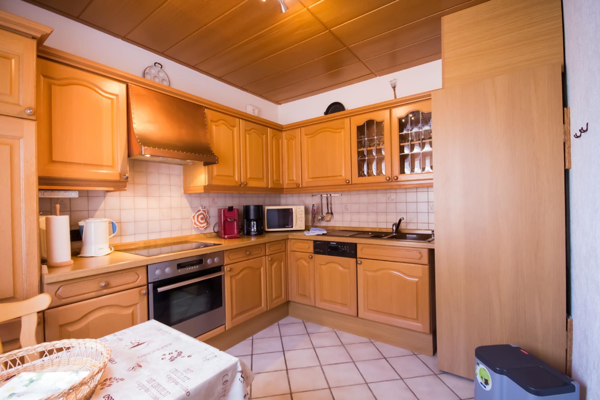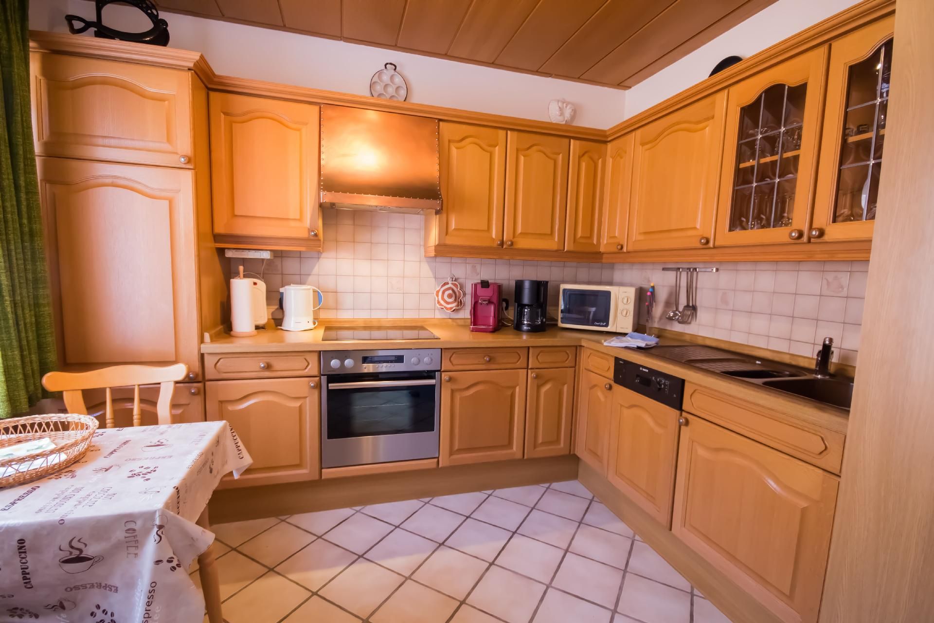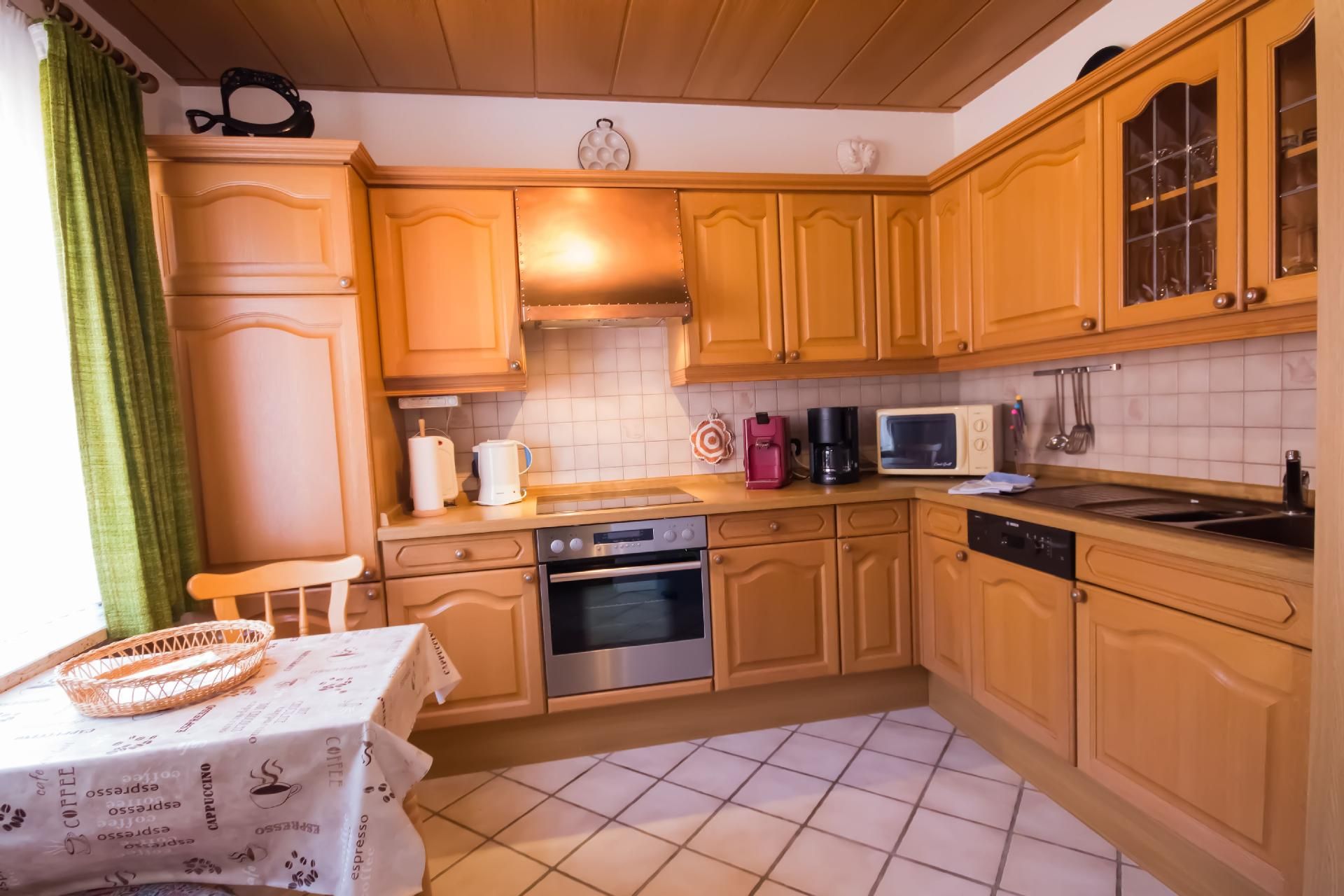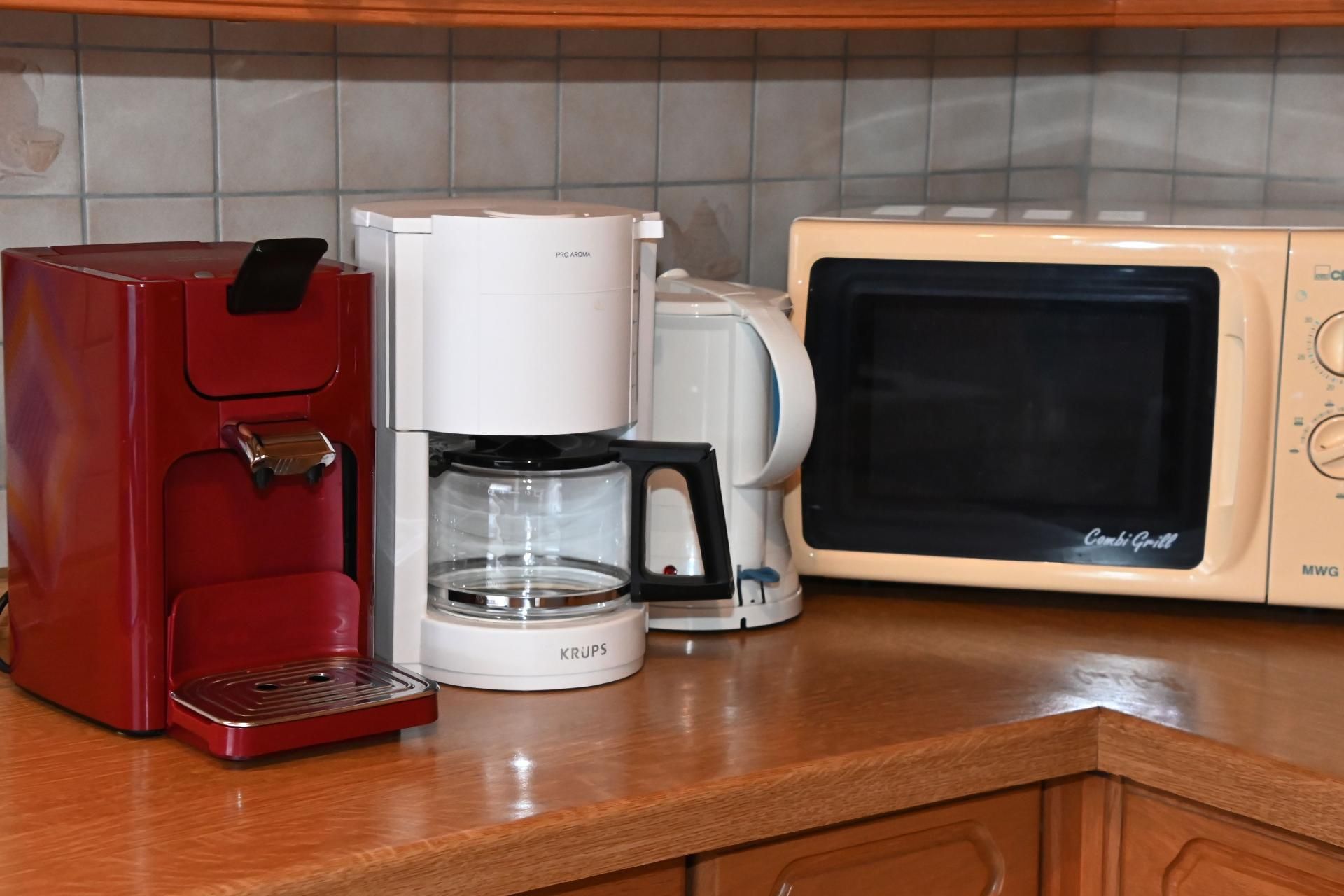 Kochen: Backofen; Ceranherd; Gefrierfach; Kaffeemaschine; Kaffeepadmaschine; Kühlschrank; Mikrowelle; Spülmaschine; Toaster; Wasserkocher;