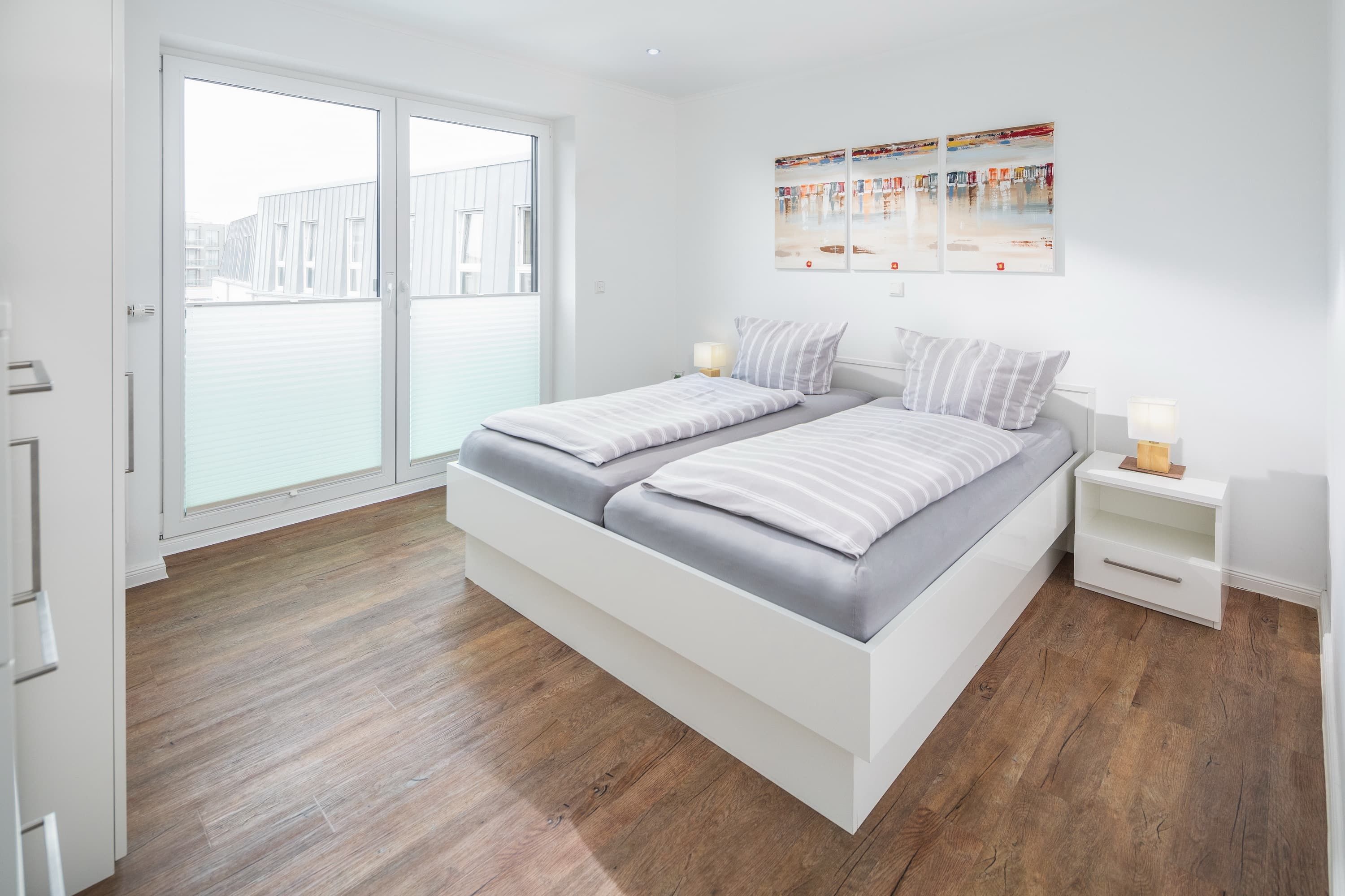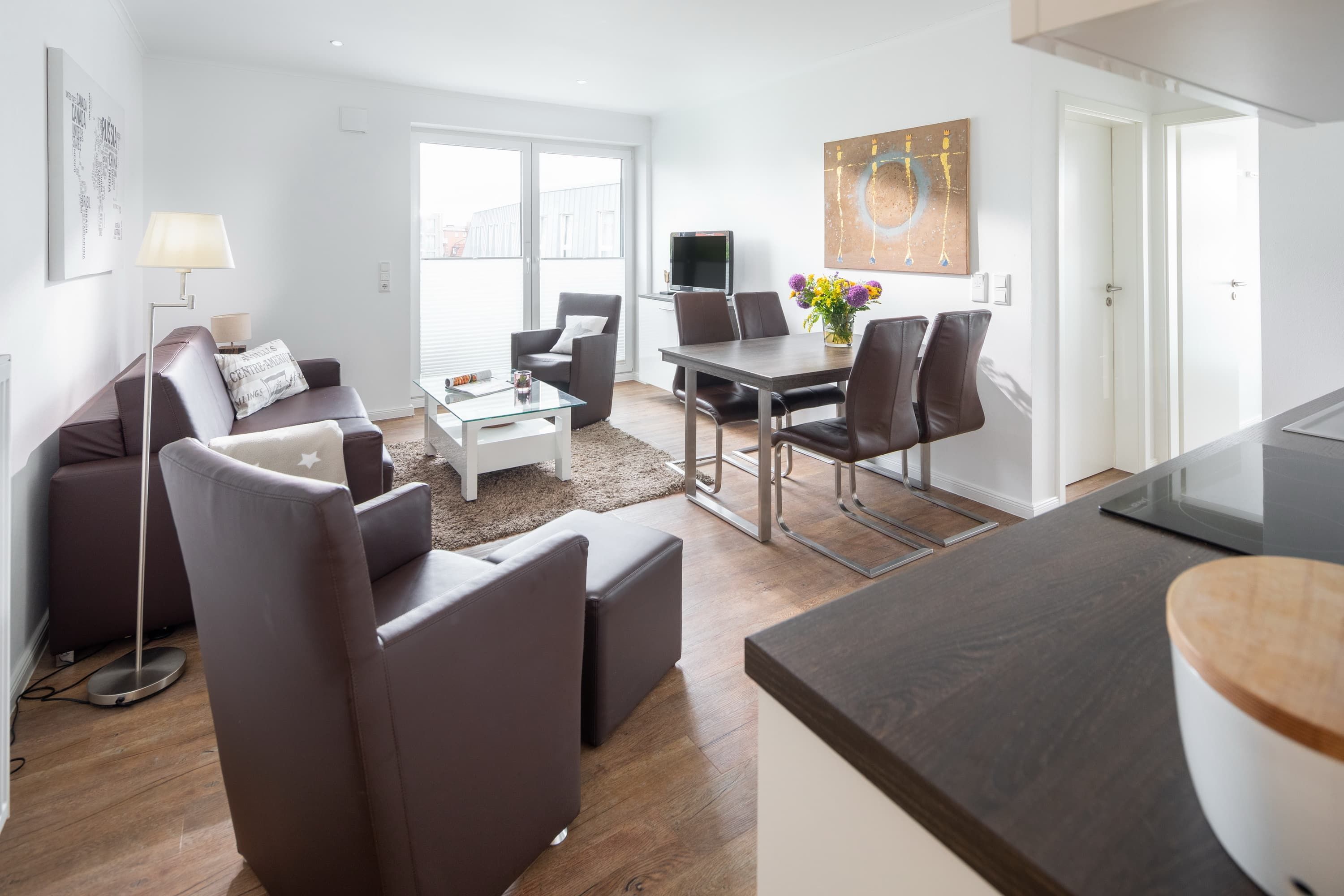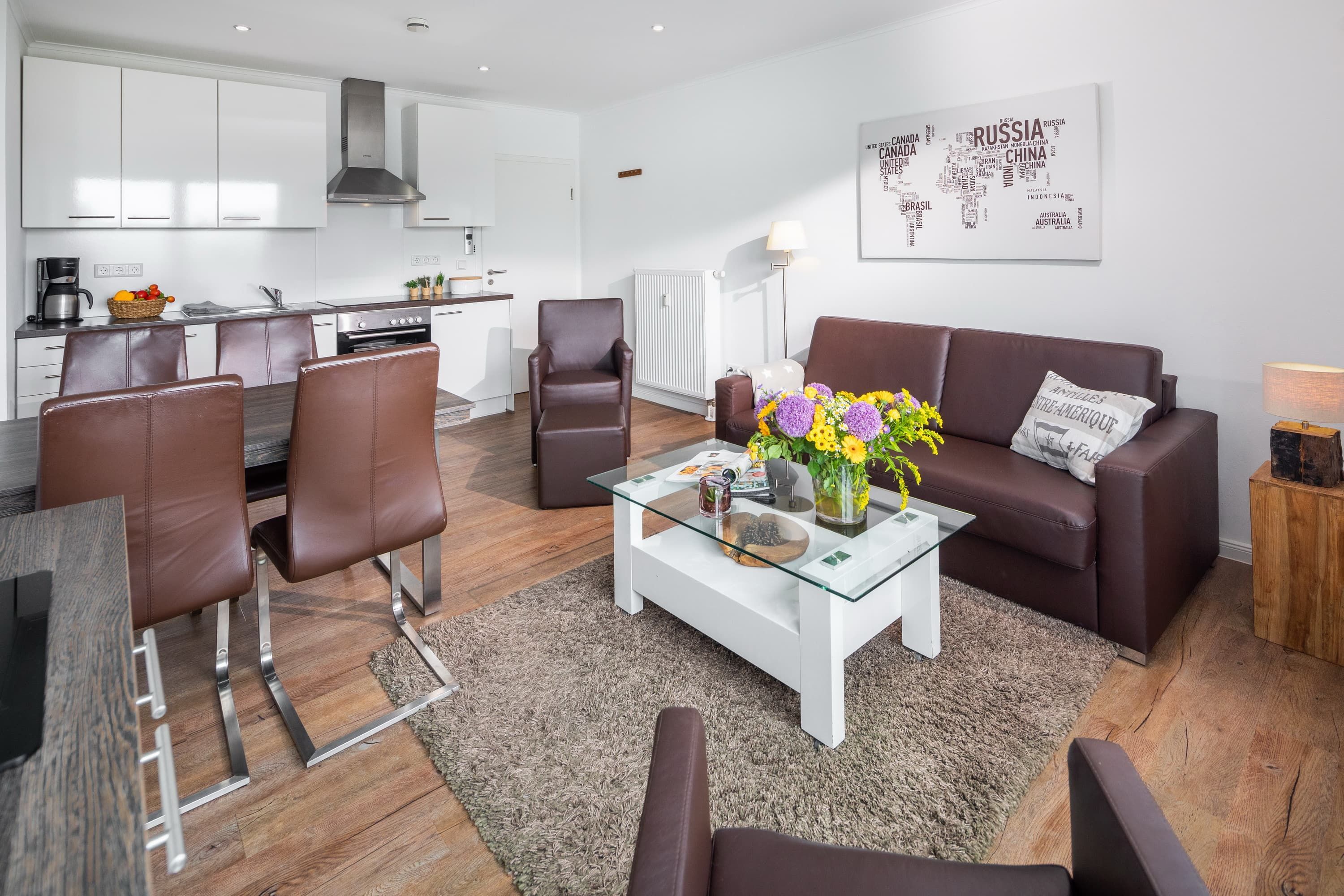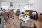 Sie verfügt über ca 45qm Wohnfläche und liegt im zweiten Stock. Sie bietet neben einem geräumigen Schlafzimmer mit Doppelbett einen modern und gemütlich gestalteten Wohnbereich mit Esstisch und angrenzender Küche. Im Wohnzimmer befindet sich eine hochwertige Schlafcouch die mit wenigen Handgriffen zu einem vollwertigen Bett mit Matratze und Lattenrost ausgezogen werden kann.