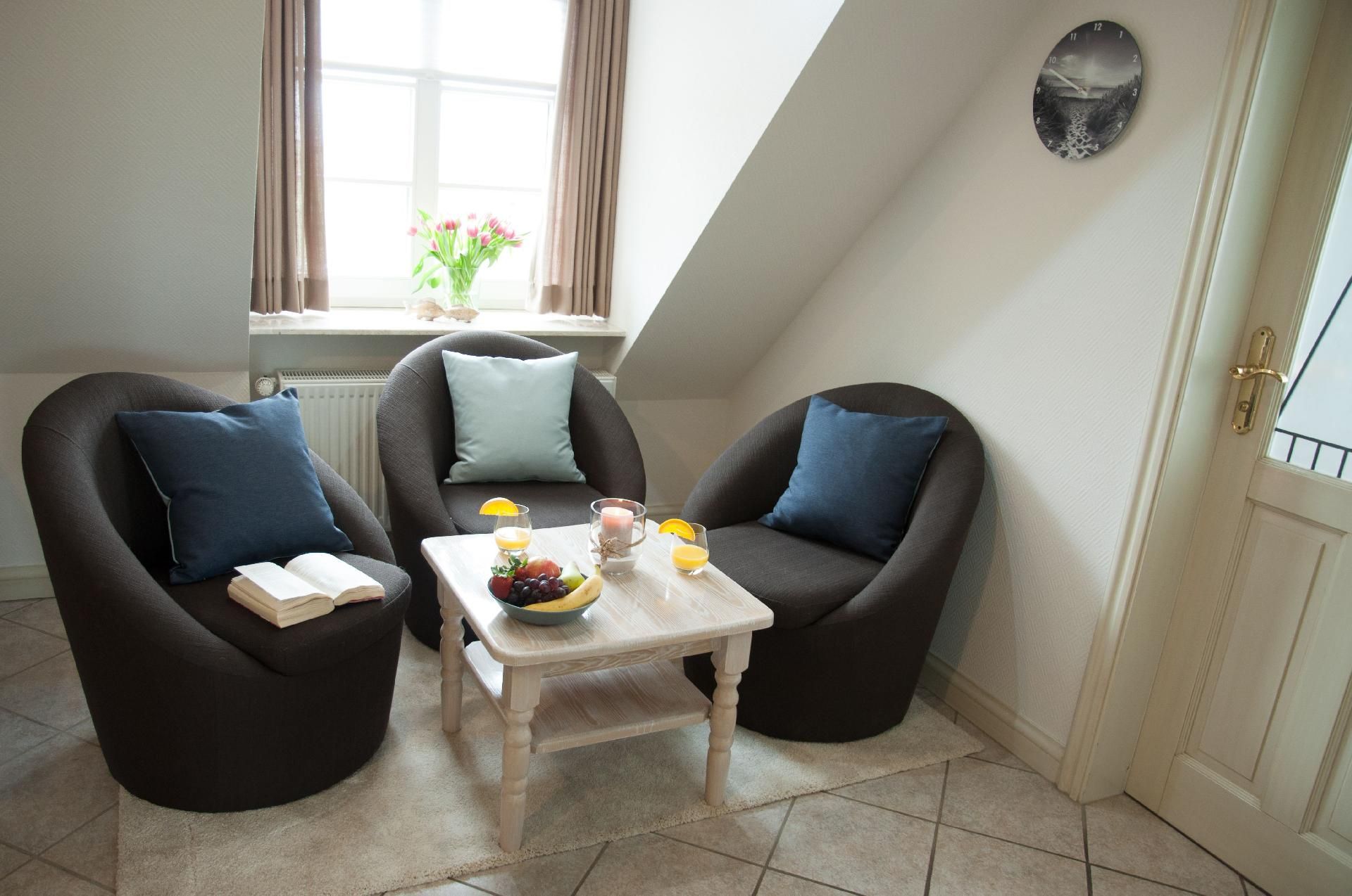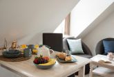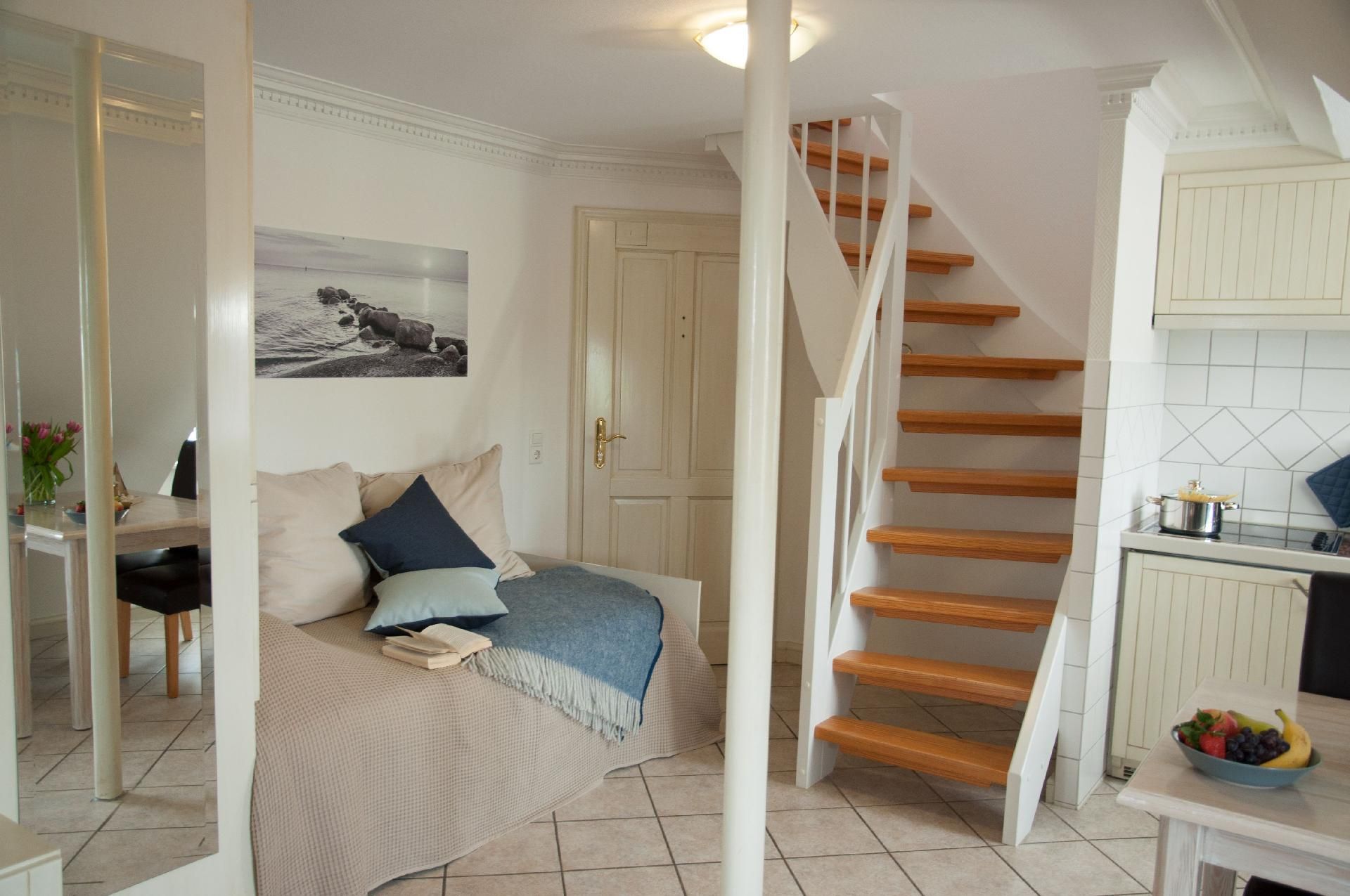 Unser gemütliche Ferienwohnung Ekke-Nekkepen bietet mit seinen 38 m² Platz für 2 Personen und erstreckt sich über zwei Geschosse (Bitte beachten Sie: Die Treppe ist nicht Seniorengeeignet). Die Einbauküche ist voll ausgestattet mit 4 Platten-Ceranfeld, Kühlschrank, Gefrierfach, Abzugshaube, Kaffeemaschine, Toaster, Wasserkocher. Im Wohnbereich finden Sie eine gemütliche Sitzecke, einen Esstisch mit Stühlen, einen Schrank sowie ein elektrisches Einzel-Schrankbett. Im Schlafraum befinden sich zwei Einzelbetten, ein Kinderbett ist wahlweise zustellbar. Das Duschbad mit Waschbecken und WC verfügt über eine Fußbodenheizung.