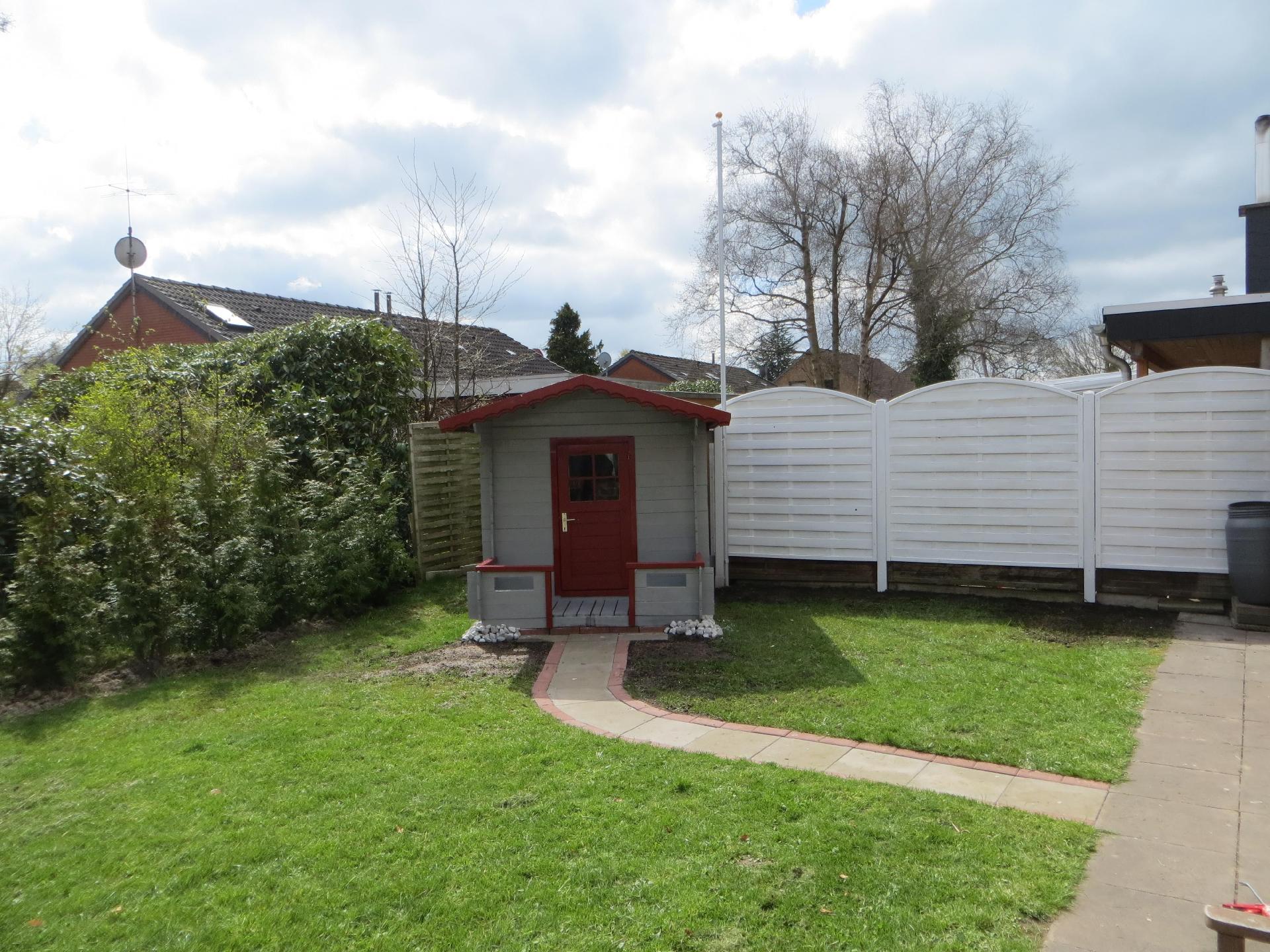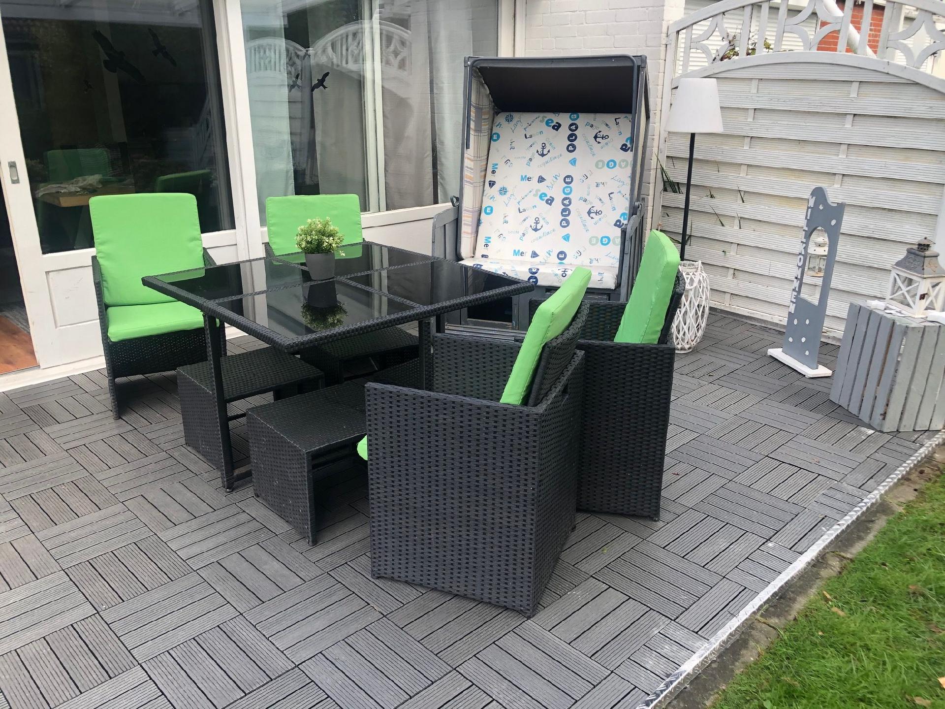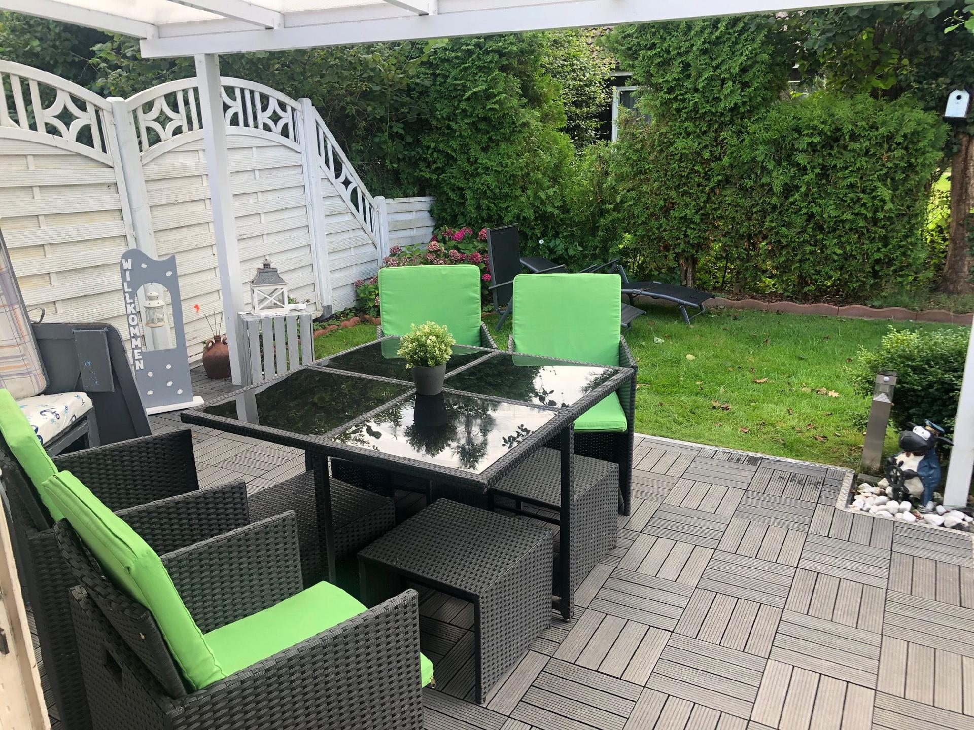 Der in sich geschlossene Garten (Südausrichtung) mit überdachter Terrasse mit Holzfliesen verfügt über eine 4er Rattansitzgruppe, Strandkorb, Sonnenschirm und Sonnenliegen samt Grill.