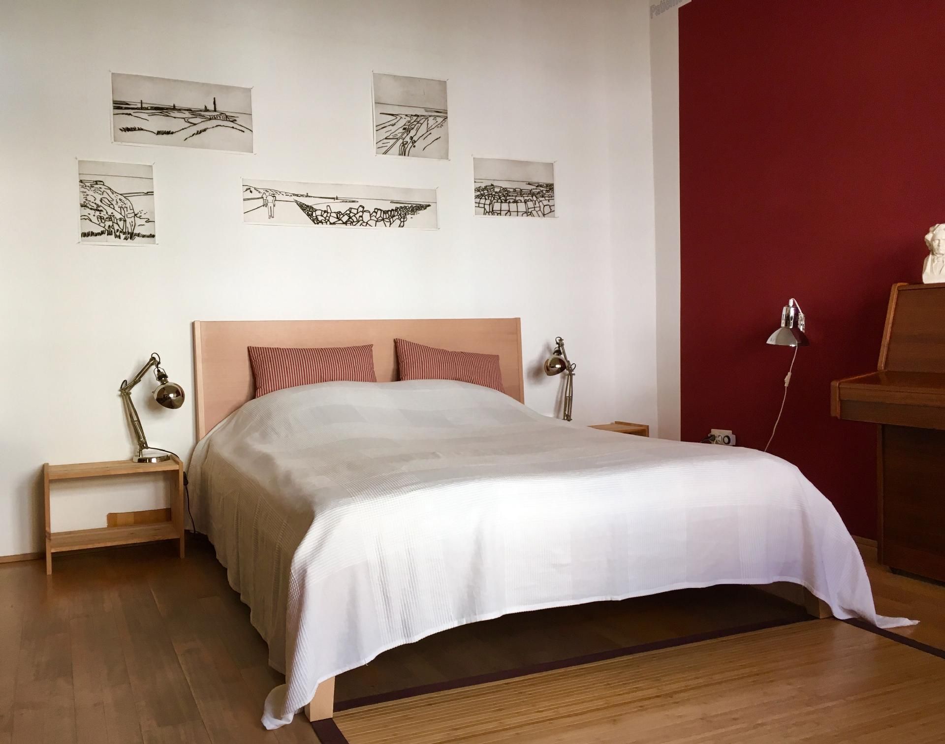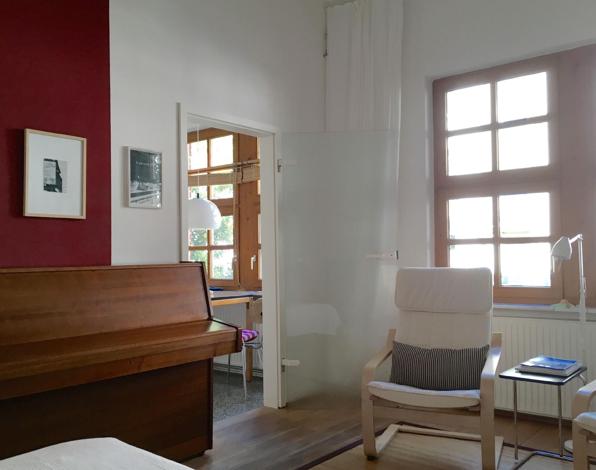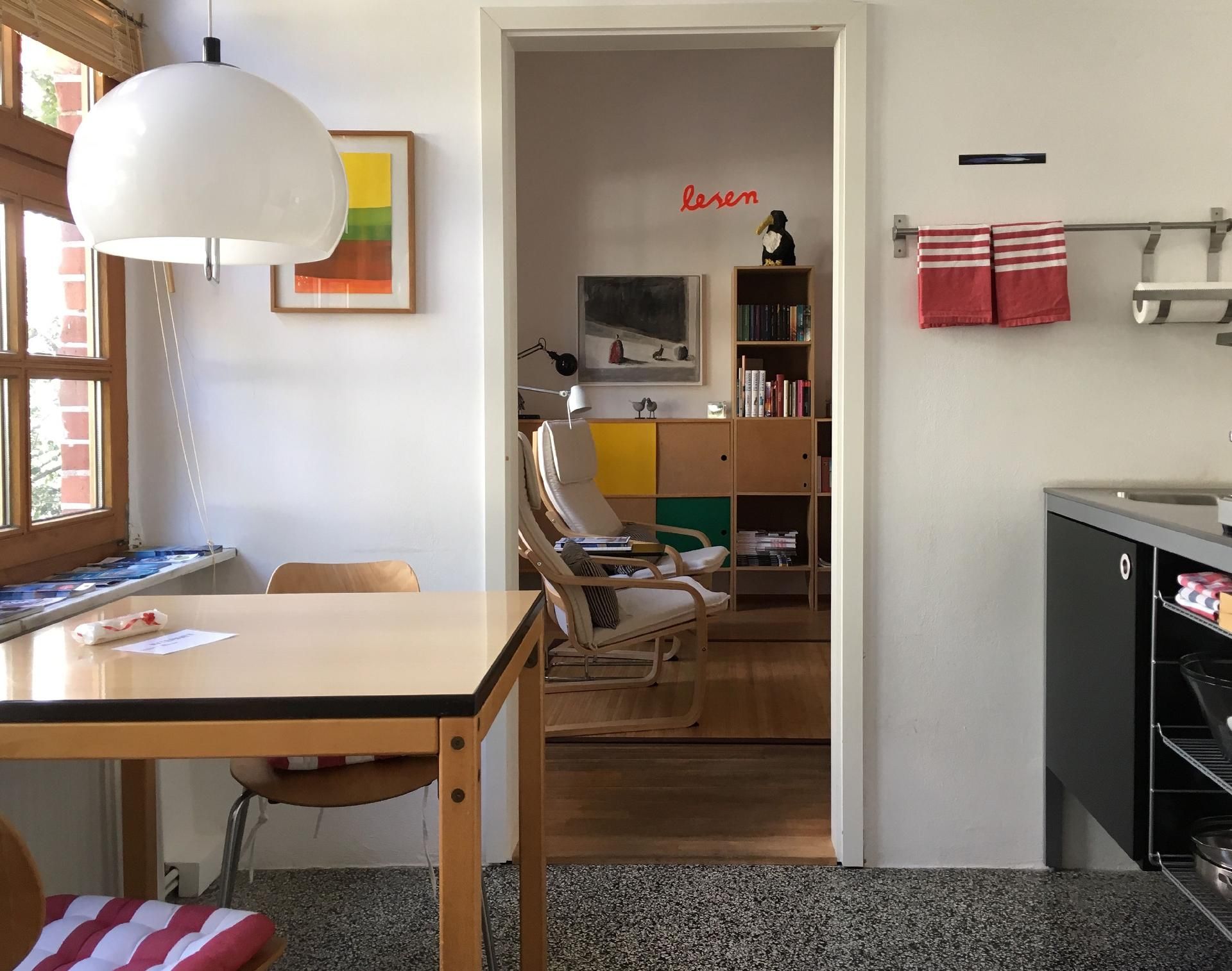 Das Apartment, ca. 37 qm, befindet sich im Erdgeschoss eines Einfamilienhauses mit separatem Eingang. Wir bieten Ihnen ein originelles Ein-Zimmer- Apartment in individuellem Design, ausgestattet mit zeitgenössischer Kunst und einem Klavier. Im Schlafbereich befindet sich ein Doppelbett für eine ruhige, erholsame und angenehme Nacht. Eine separate Küche, ausgestattet mit einem Kühlschrank, Zwei- Plattenherd, Wasserkocher, Kaffeemaschine, Esspressomaschine, Toaster und allem Zubehör, um ein kleines Essen für Zwischendurch zubereiten zu können, ist vorhanden. Der Essbereich in der Küche bietet einen interessanten Blick in den Vorgarten. Das gepflegte, neue Badezimmer verfügt über eine vielgelobte Regendusche und ist mit seinen hochwertigen Materialen und Armaturen ausgestattet.