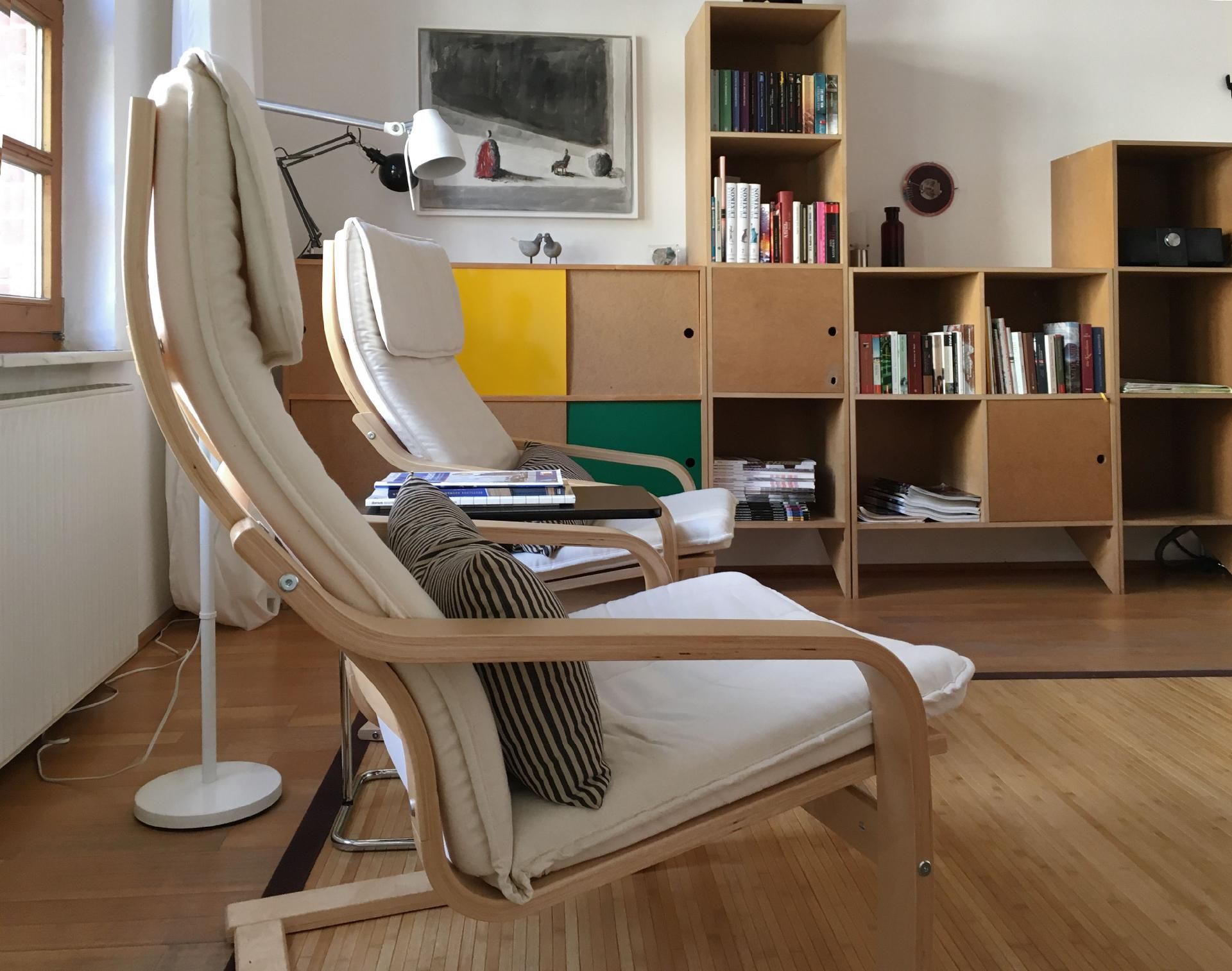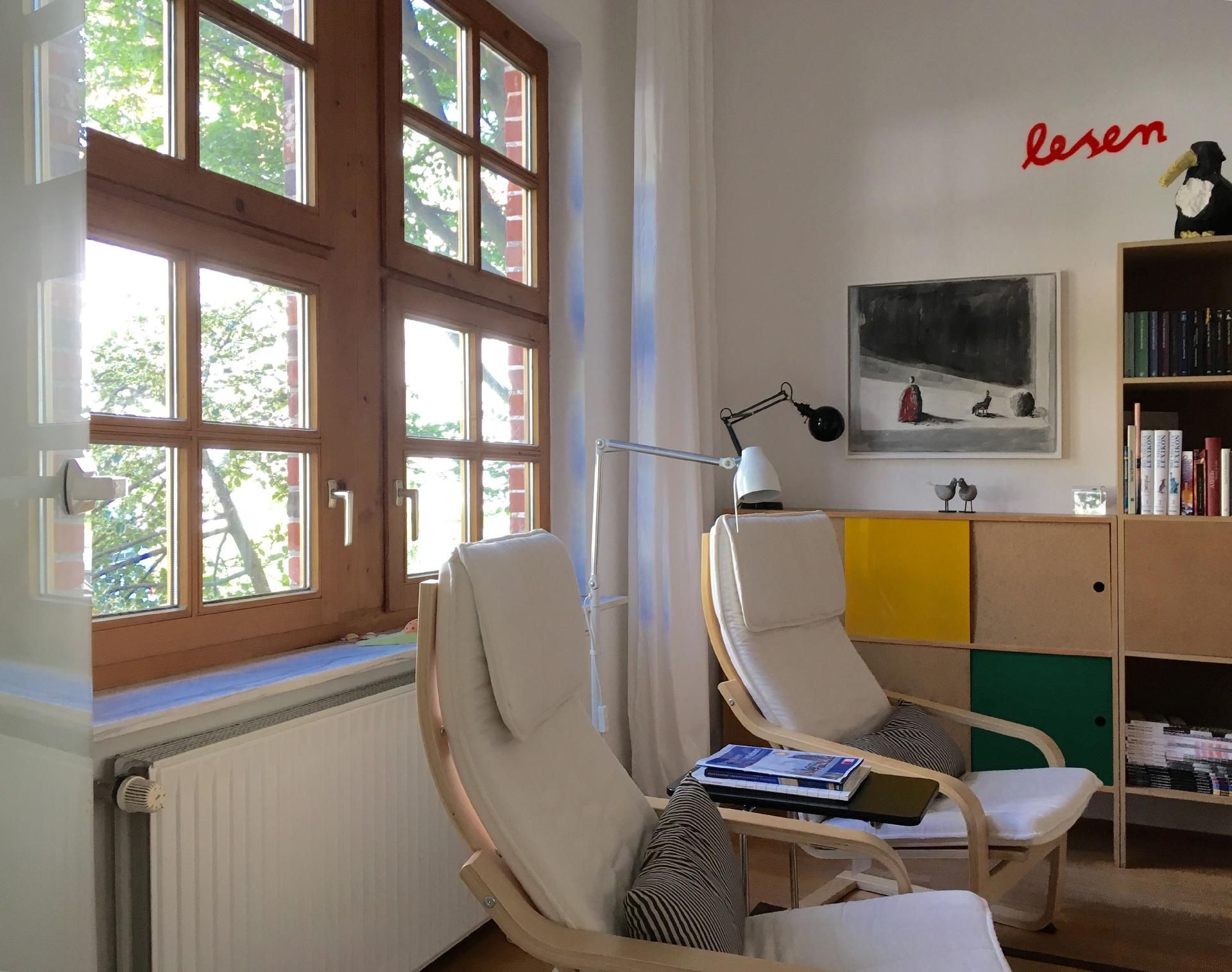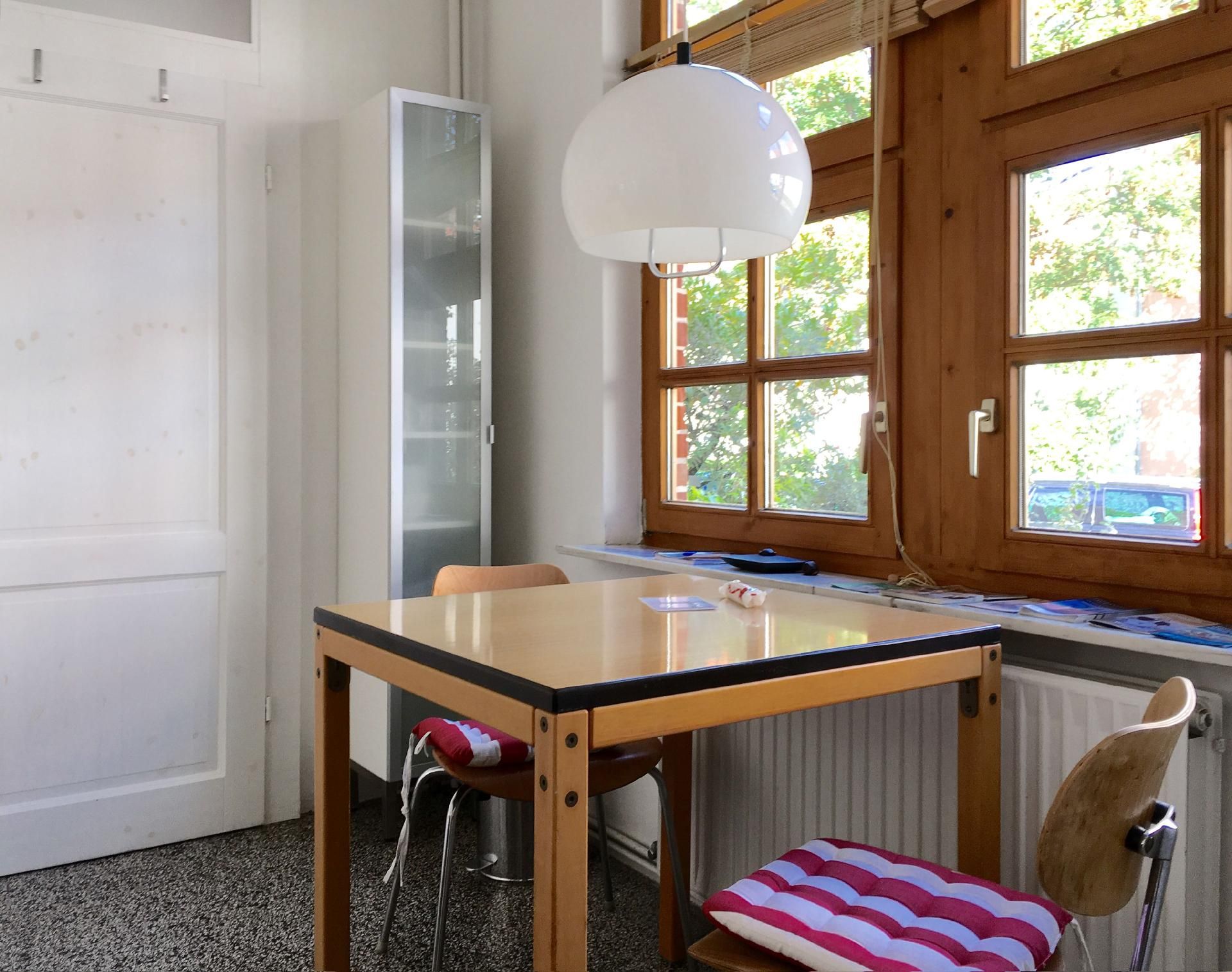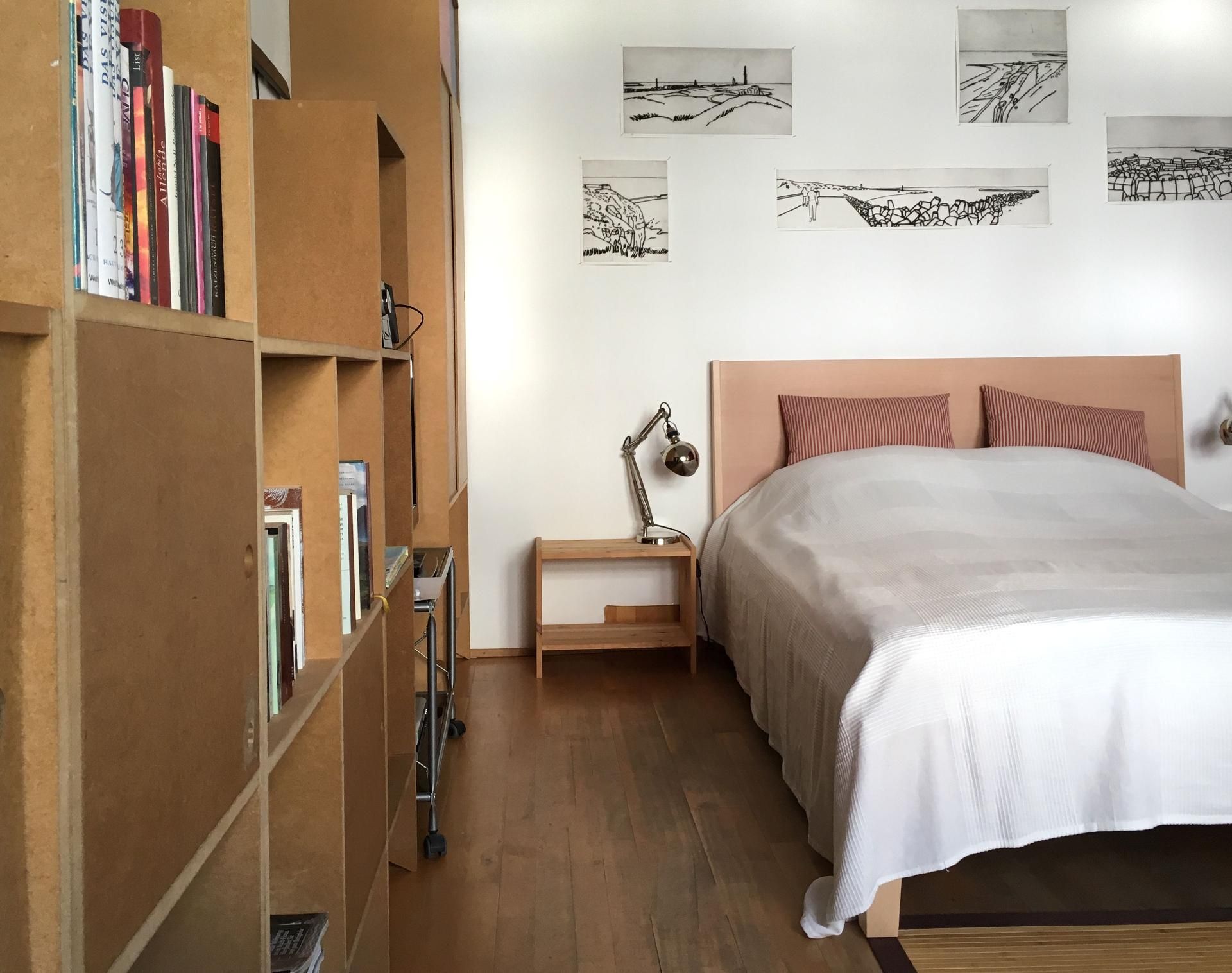 Das Apartment, ca. 37 qm, befindet sich im Erdgeschoss eines Einfamilienhauses mit separatem Eingang. Wir bieten Ihnen ein originelles Ein-Zimmer- Apartment in individuellem Design, ausgestattet mit zeitgenössischer Kunst und einem Klavier. Im Schlafbereich befindet sich ein Doppelbett für eine ruhige, erholsame und angenehme Nacht. Eine separate Küche, ausgestattet mit einem Kühlschrank, Zwei- Plattenherd, Wasserkocher, Kaffeemaschine, Esspressomaschine, Toaster und allem Zubehör, um ein kleines Essen für Zwischendurch zubereiten zu können, ist vorhanden. Der Essbereich in der Küche bietet einen interessanten Blick in den Vorgarten. Das gepflegte, neue Badezimmer verfügt über eine vielgelobte Regendusche und ist mit seinen hochwertigen Materialen und Armaturen ausgestattet.