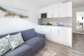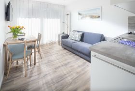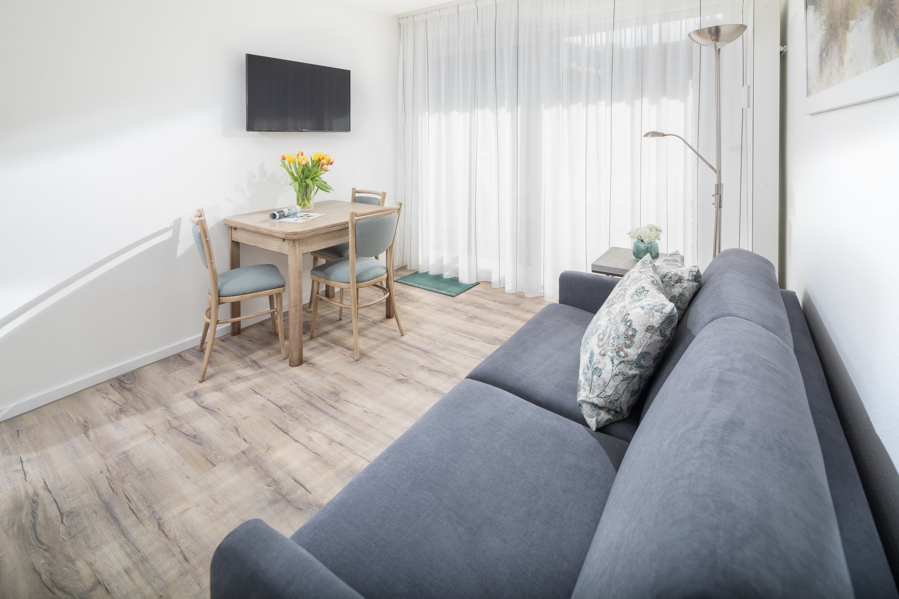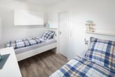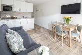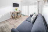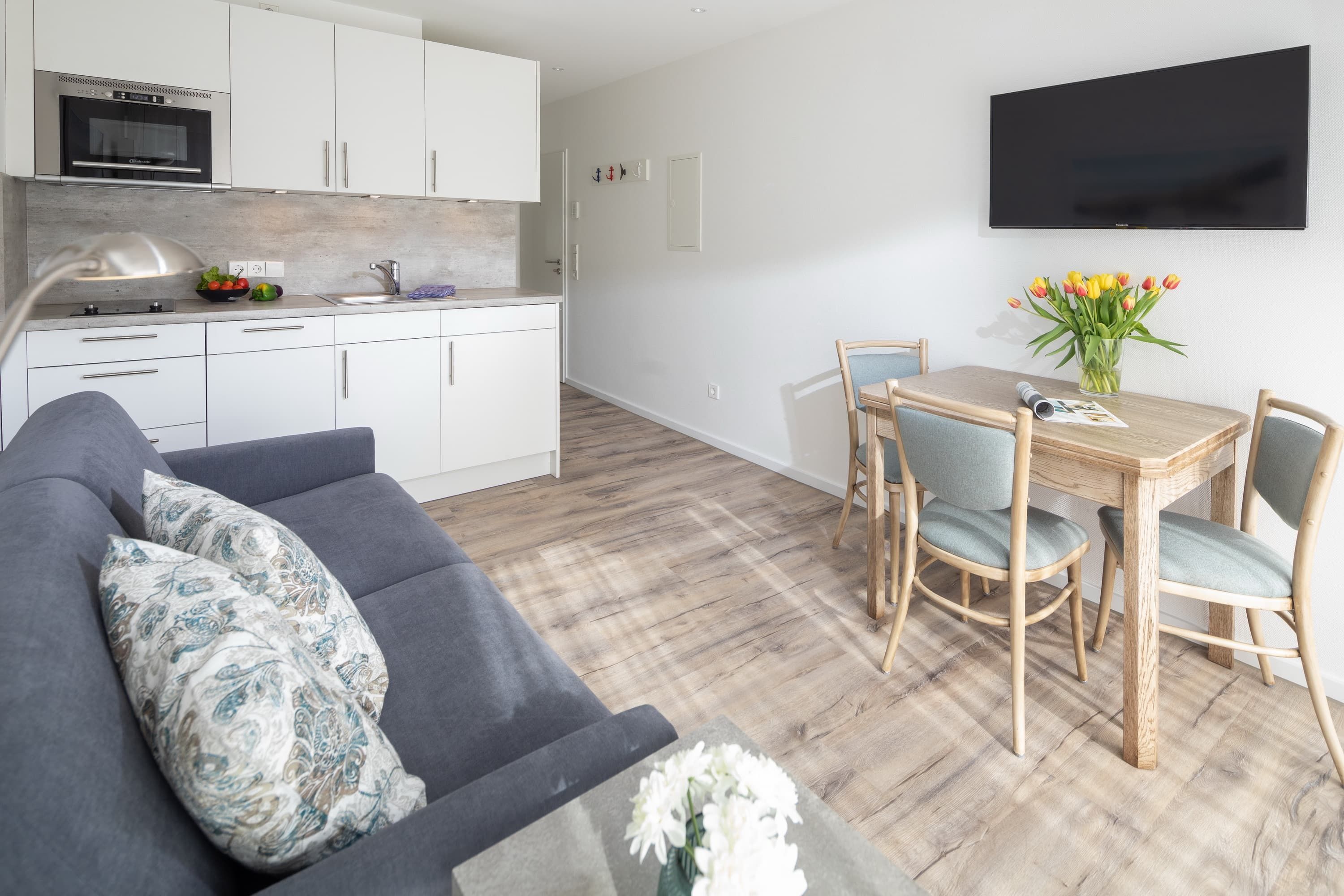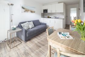 Das Apartment wurde im Frühjahr 2019 kernsaniert und komplett neu gestaltet. Es bietet Platz für 2-3 Personen. Neben einer gemütlichen Couch (zum alternativen Schlafplatz mit Lattenrost klappbar) und TV steht eine moderne und funktionale Küchenzeile zur Verfügung. Am Esstisch kann man gemeinsam essen und spielen. Das separate Schlafzimmer verfügt über 2 Einzelbetten (90cm breit). Das Duschbad ist weiß gefliest. Die Wohnung hat einen ruhigen und überdachten Balkon zur Hofseite.