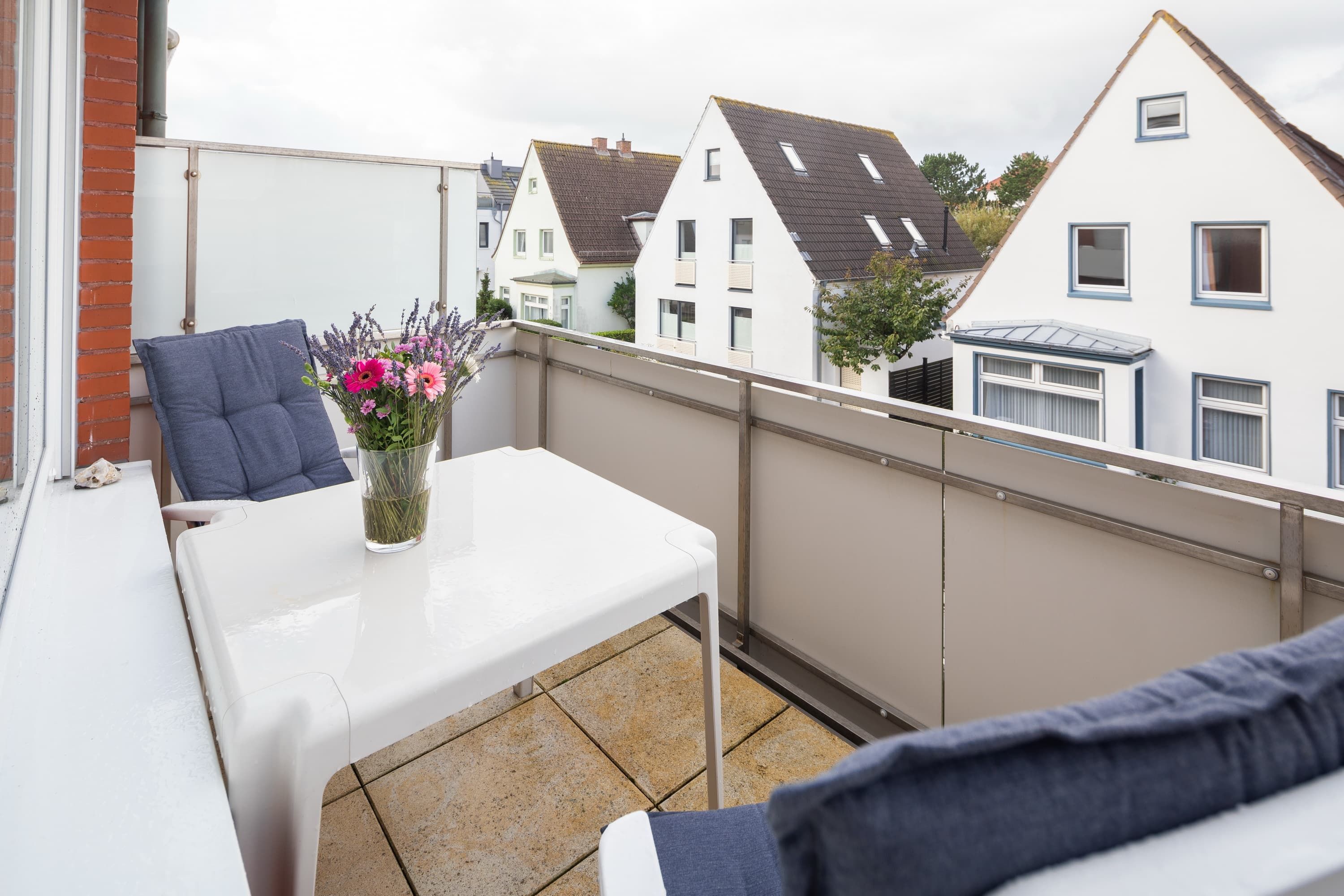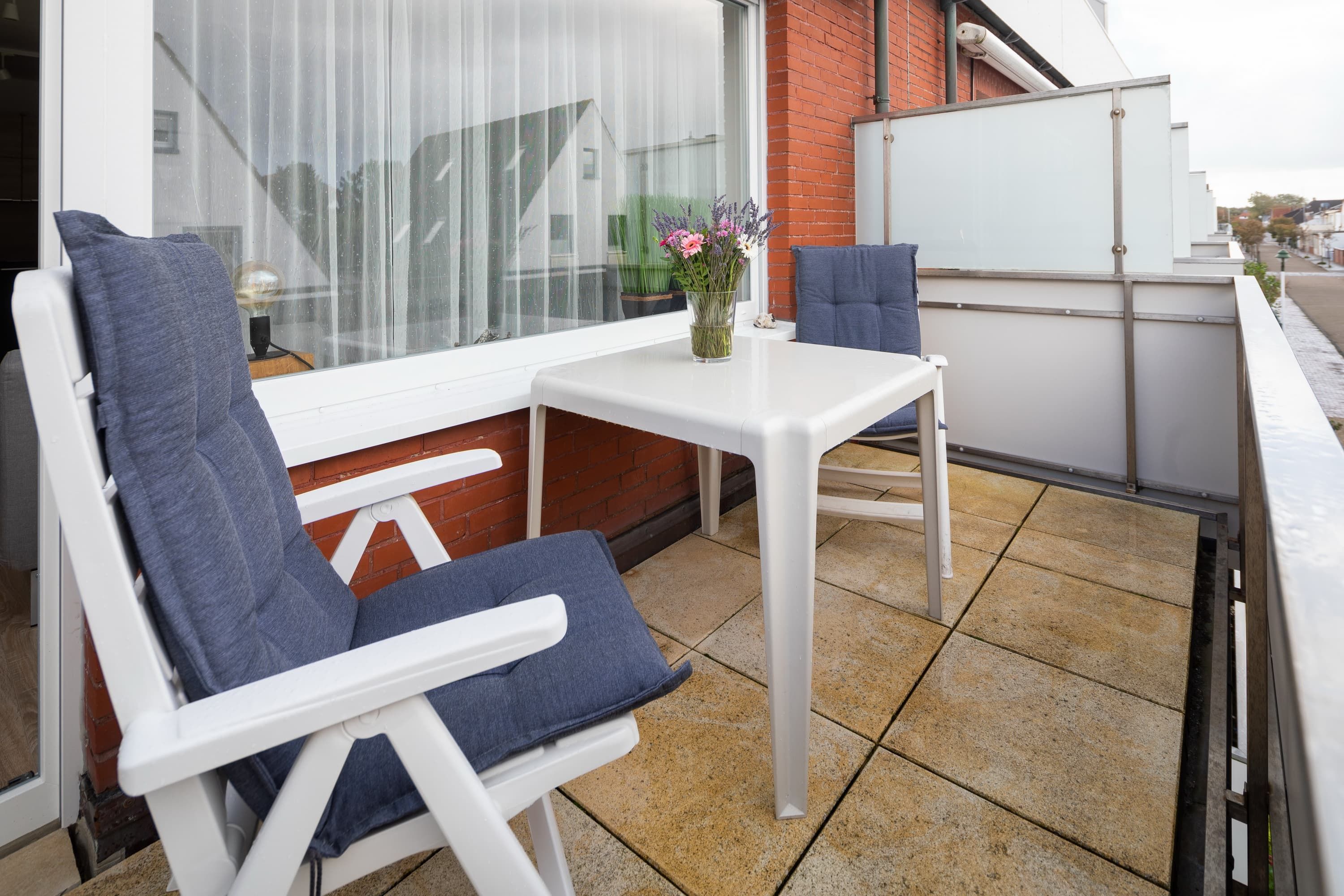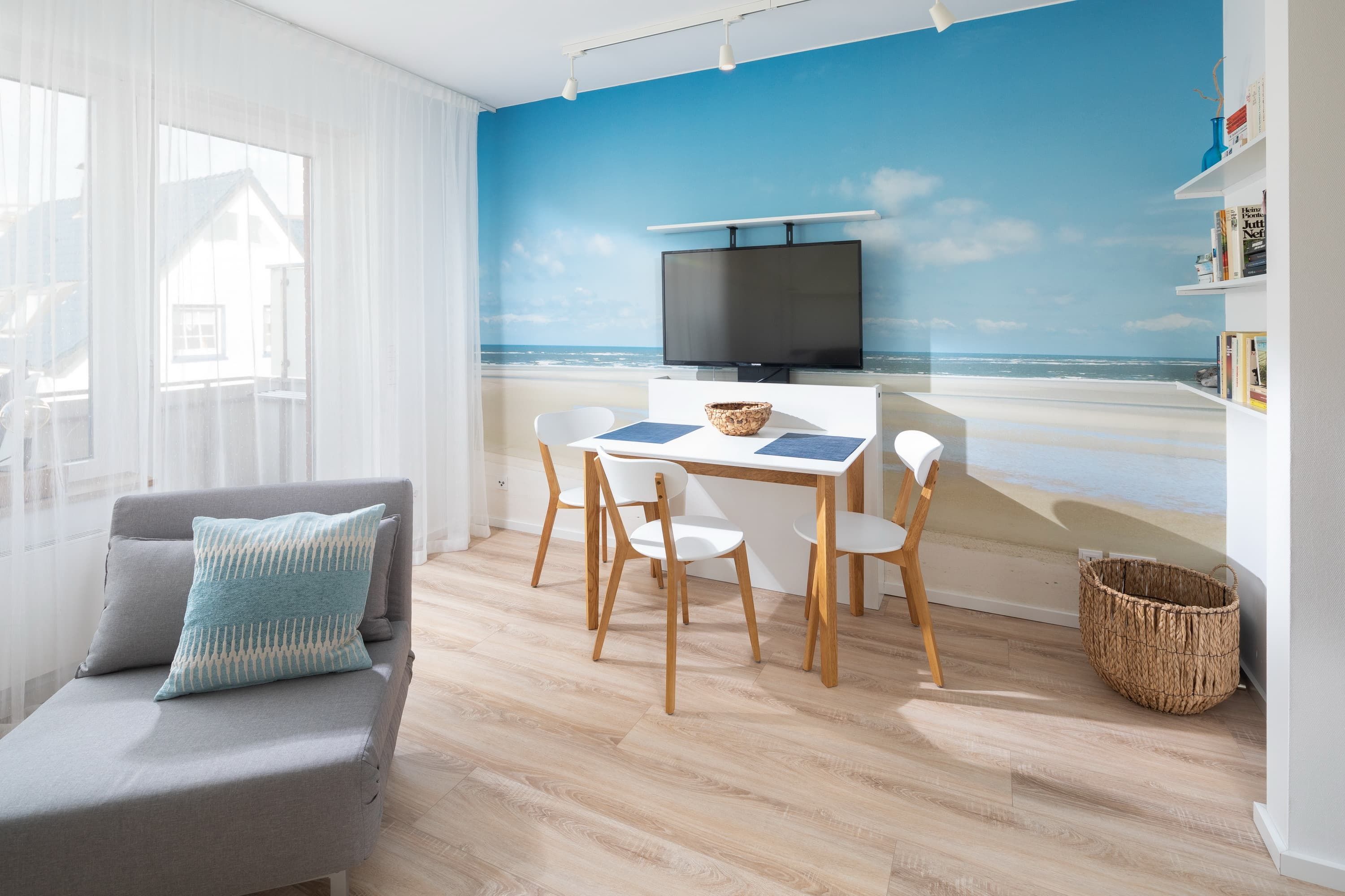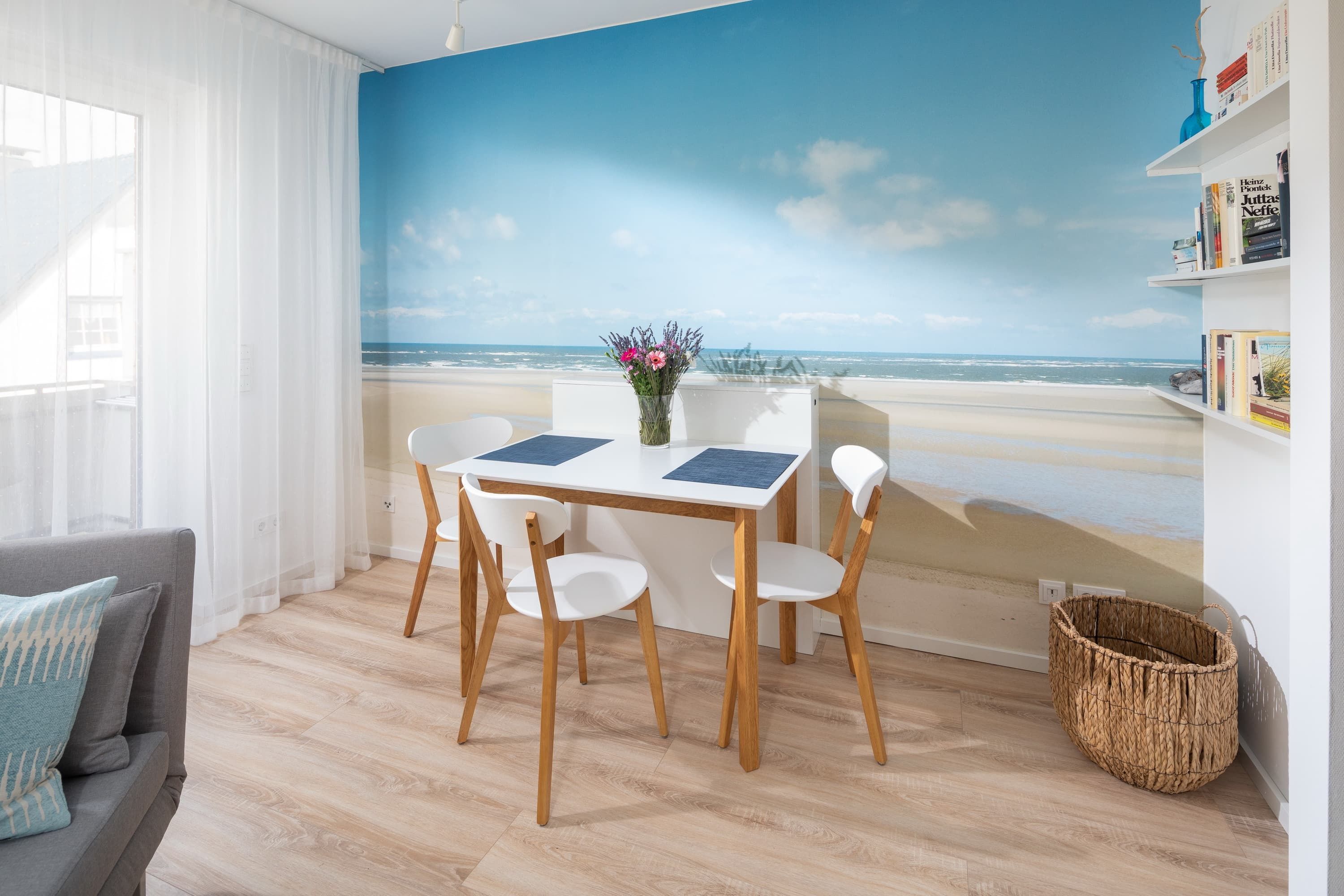 Die Ferienwohnung wurde 2019 komplett saniert. Der helle Wohn- und Schlafraum bietet ein hochwertiges Schrankbett mit integriertem Sofa. Am Esstisch können Sie gemeinsam frühstücken oder im gemütlichen Sessel etwas lesen. Die schöne Fototapete sorgt auch bei Nieselregen für Urlaubsgefühl! Die Küche bietet alle gängigen Elektrogeräte und wird auch Kochliebhabern gerecht. Vom Wohn- und Schlafraum aus gelangen Sie auf den geräumigen Balkon, von dem aus Sie die Dünen des Nordstrandes sehen können. Nur 50m sind es bis zum beliebten Januskopf mit Surfcafé und Cornelius.